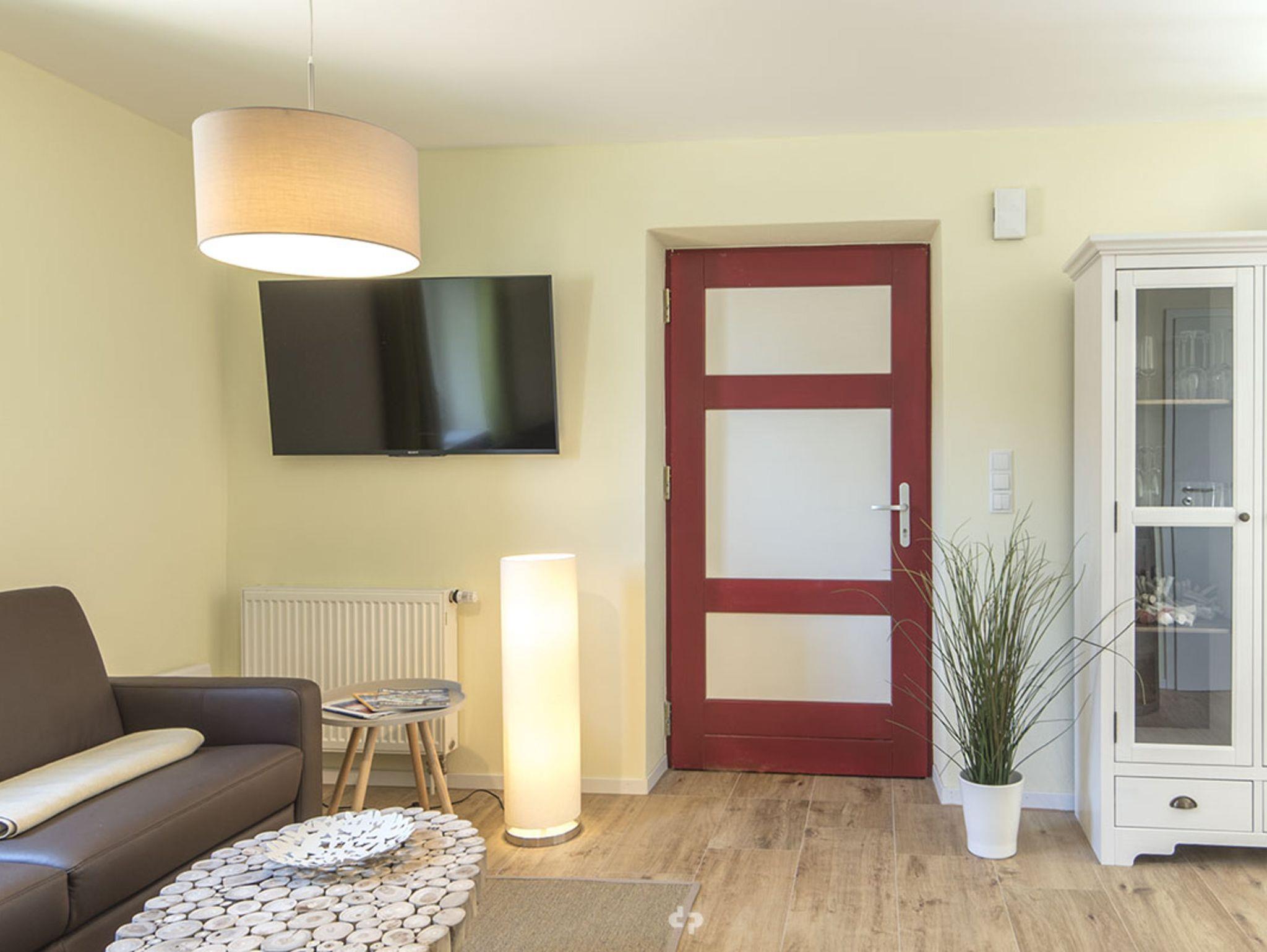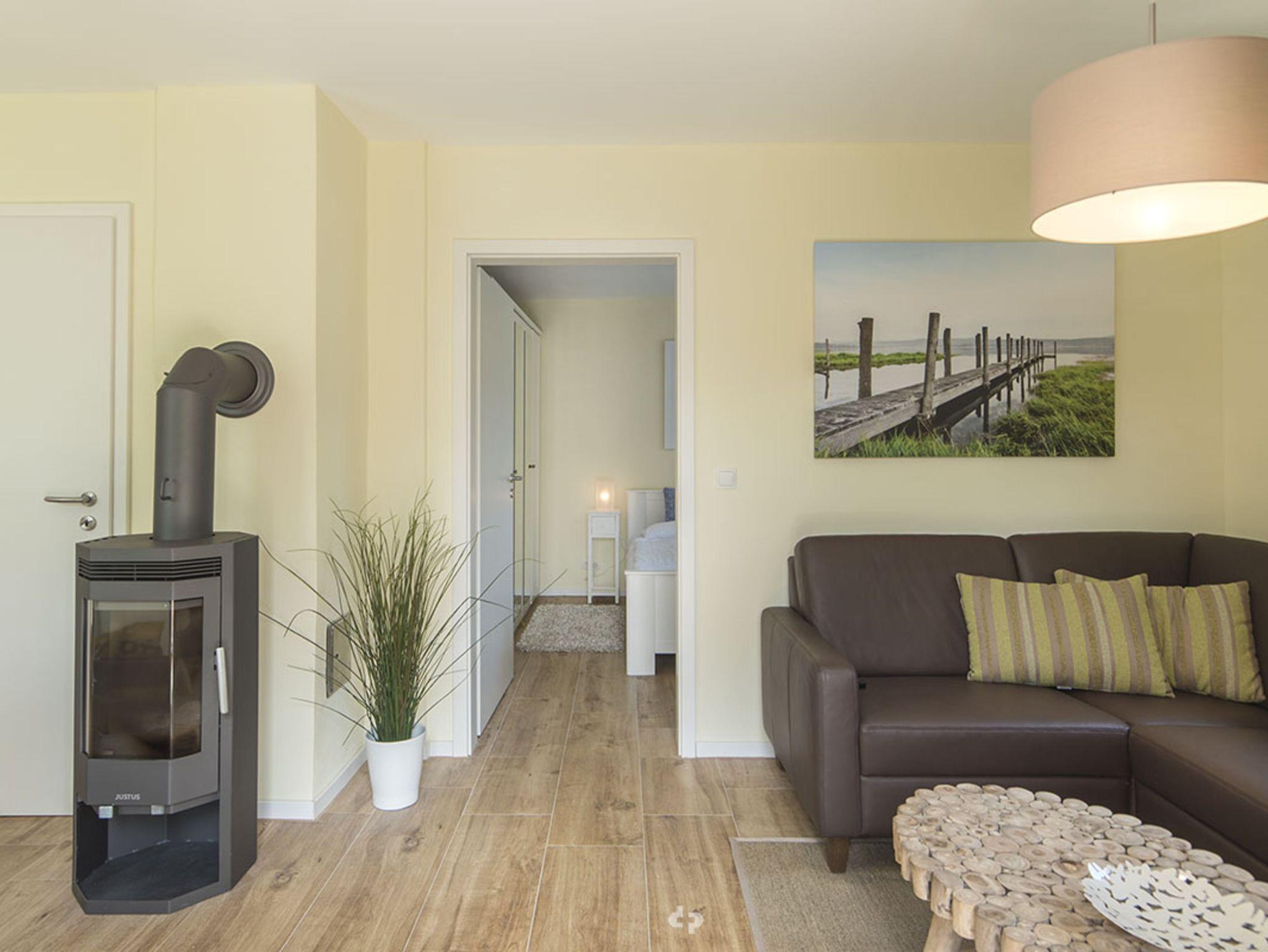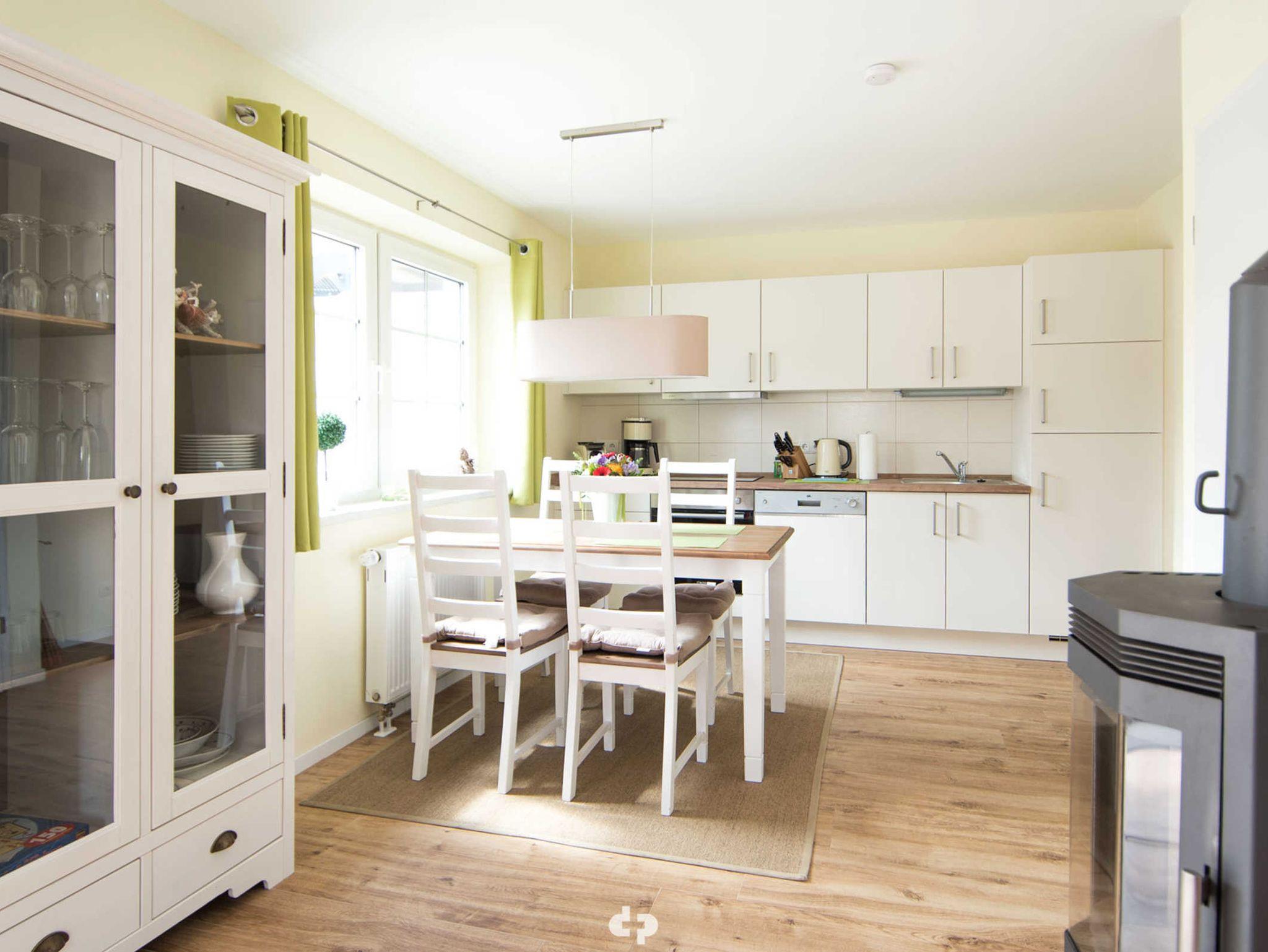 • Im Erdgeschoss erwartet Sie ein Wohnbereich mit integrierter Einbauküche und Essplatz. Der Wohnbereich ist mit einer bequemen Couch, Flachbild-TV und Kaminofen ausgestattet.