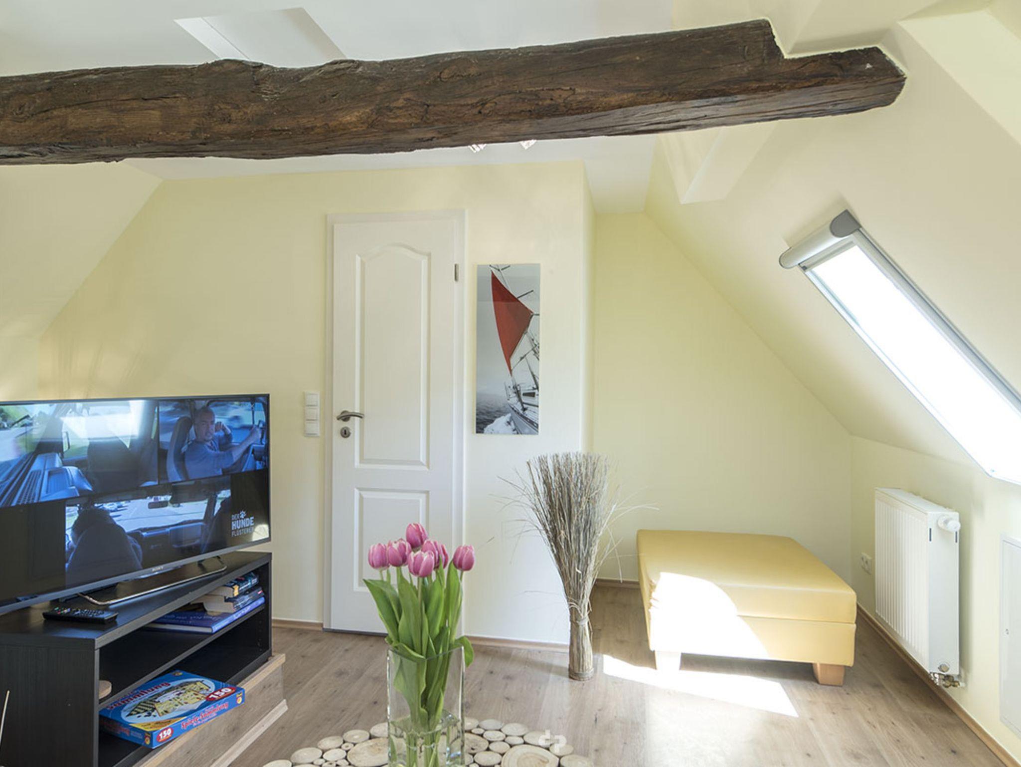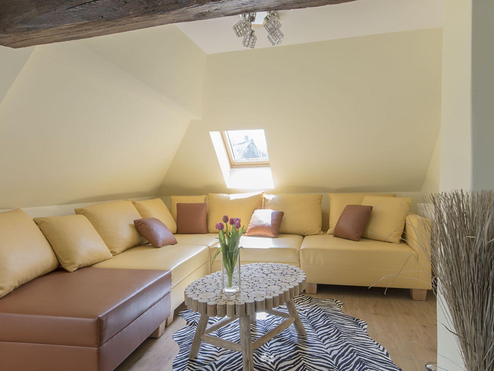 • Über eine Treppe gelangen Sie in das Dachgeschoss. Hier lädt eine großzügige Couch mit Flachbild-TV zum Entspannen ein.