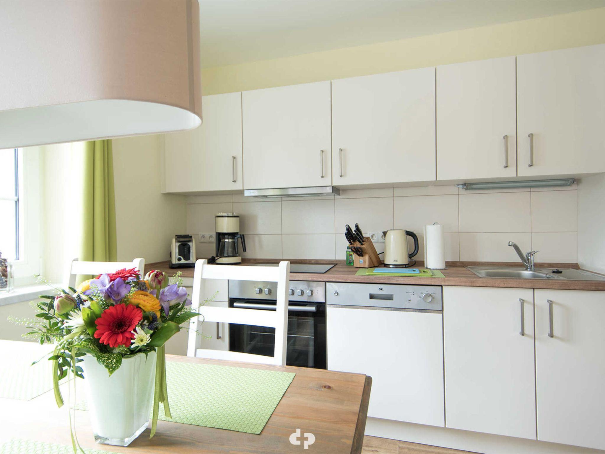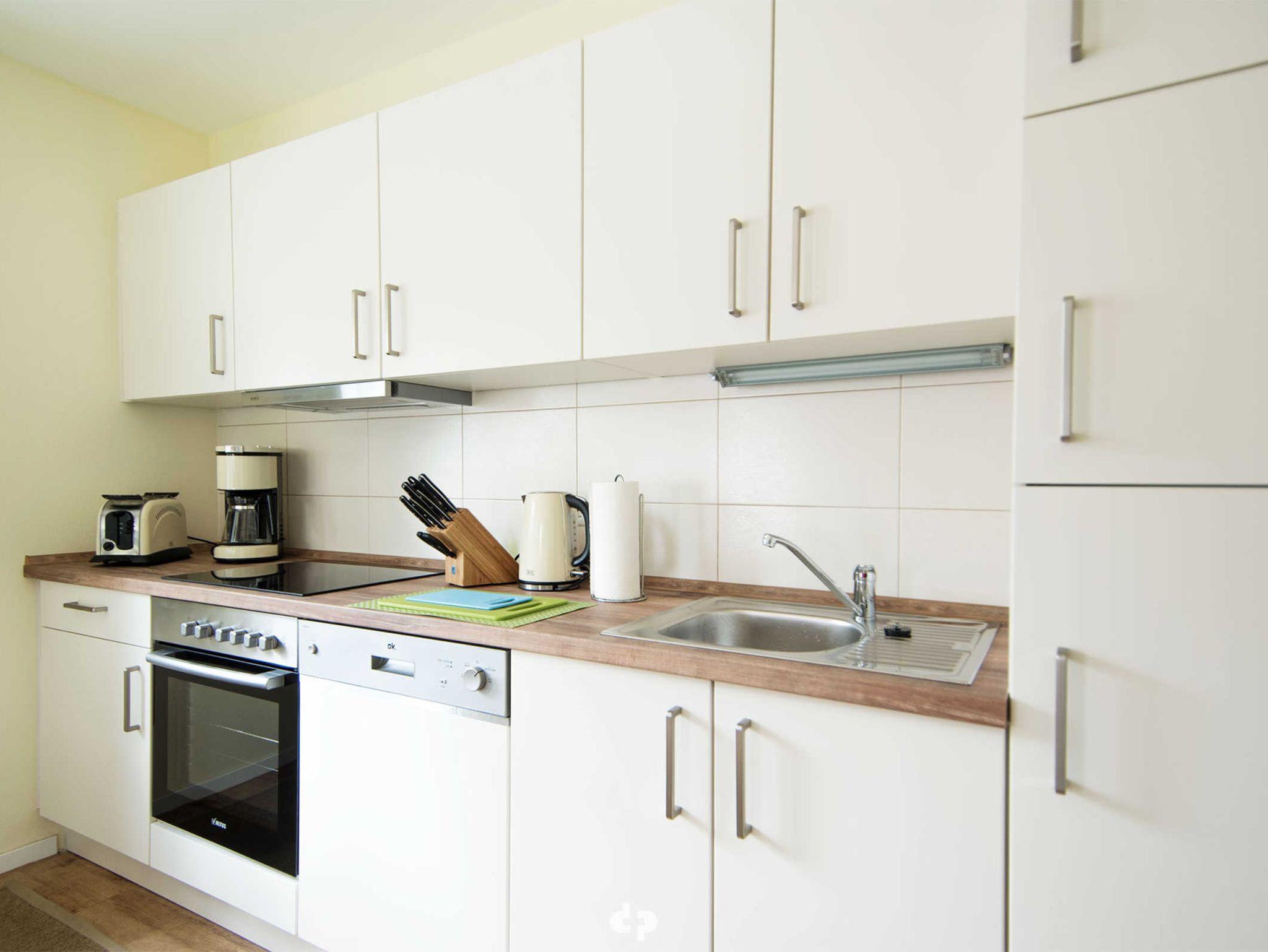 • Die Einbauküche verfügt über Kühlschrank mit Gefriermöglichkeit, Cerankochfeld, Backofen und Geschirrspüler. Kaffeemaschine, Wasserkocher und Toaster sind ebenso vorhanden wie ausreichend Geschirr und Besteck.