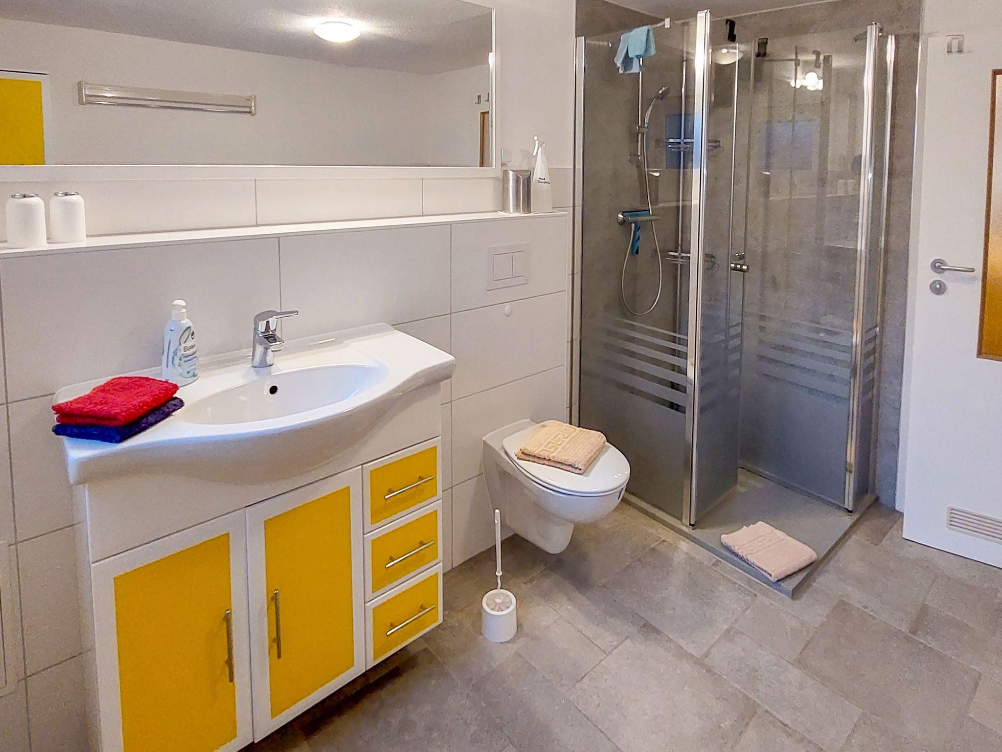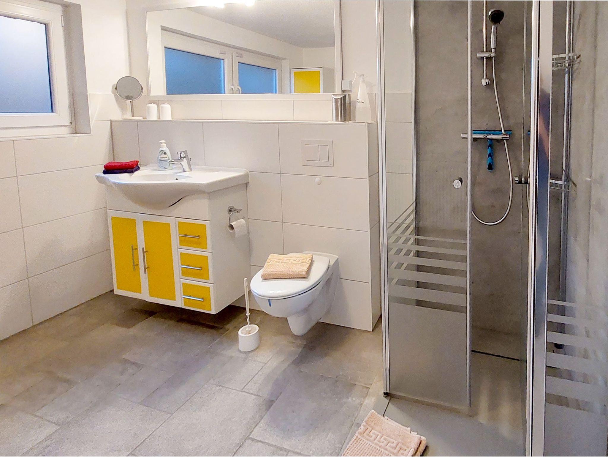 Im Schlafzimmer wartet ein komfortables Doppelbett (160x200) auf dich, ergänzt durch einen geräumigen Kleiderschrank für deine Urlaubsgarderobe. Für eine dritte Person gibt es ein praktisches Klappbett (70x200), und für die Kleinsten steht ein Kinderbett bereit ? alles ist durchdacht, damit du dich wie zu Hause fühlen kannst. Das Badezimmer ist modern gestaltet und mit einer ebenerdigen Dusche und einem WC ausgestattet. Hier kannst du dich nach einem erlebnisreichen Tag erfrischen und wohlfühlen.