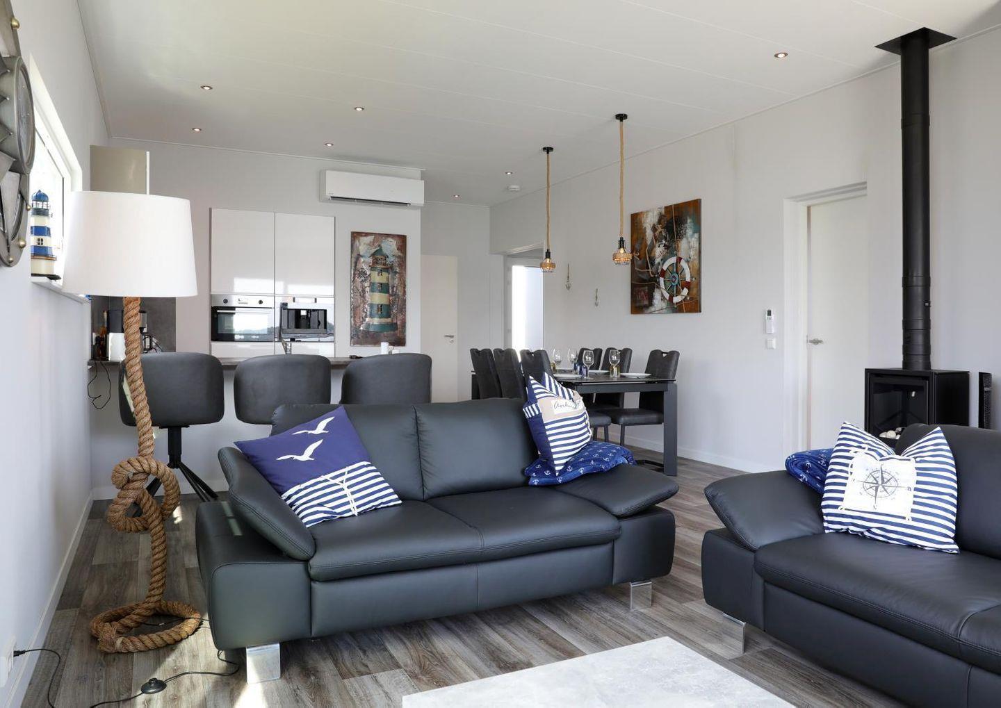 Der Wohnbereich ist hell und einladend gestaltet und verfügt über Sofa, Sofaecke sowie einen Essbereich mit Esstisch – passend für gemeinsame Mahlzeiten oder gemütliche Abende. Für Unterhaltung und Verbindung sorgt WLAN, ergänzt durch TV und Radio. An kühleren Tagen schafft der Kamin-/Ofen eine behagliche Atmosphäre, während Fußbodenheizung und Heizung für zusätzlichen Komfort sorgen. In der warmen Jahreszeit profitieren Sie von Klimaanlage und Fliegengittern; Sichtschutz an allen Fenstern unterstützt dabei Privatsphäre und Erholung.