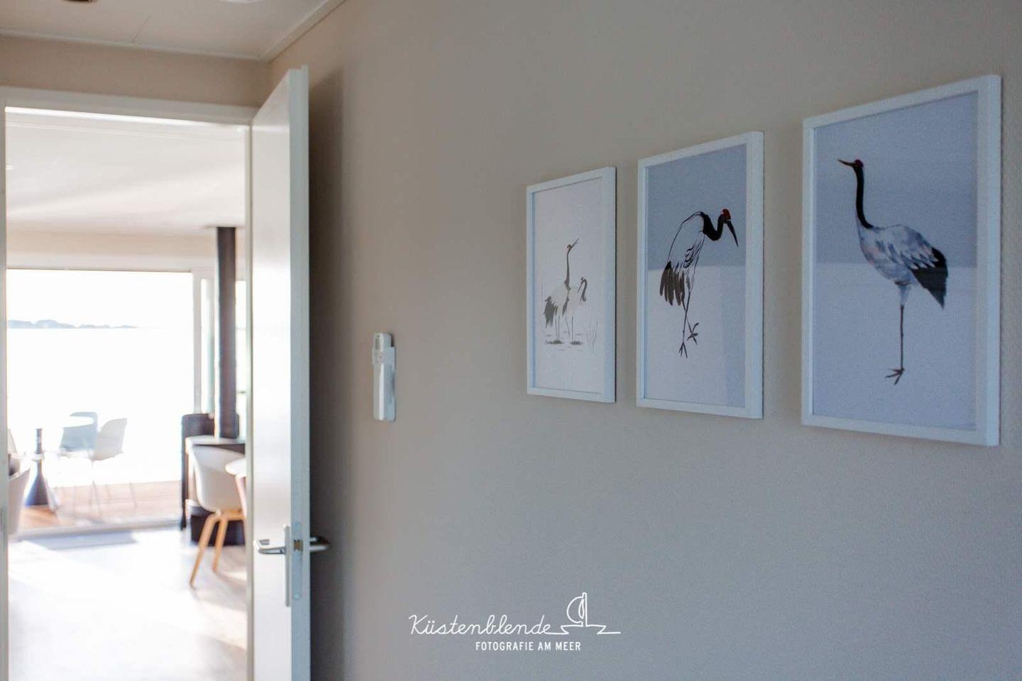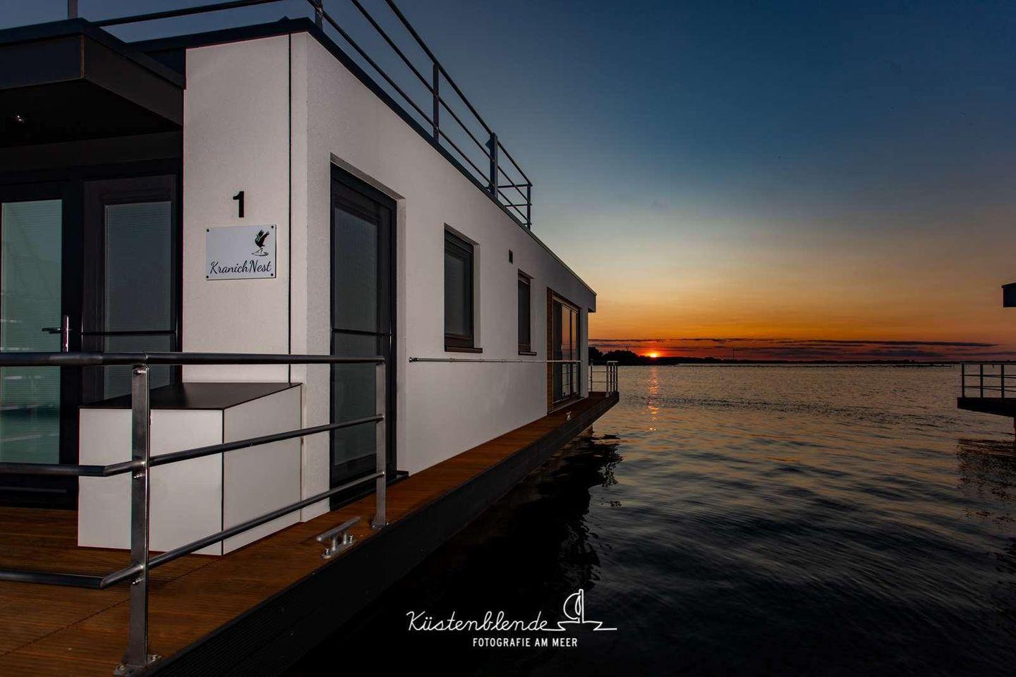 Das Floatinghouse KranichNest ist ein freistehendes Nichtraucher-Ferienhaus am See (44 m²) mit Seeblick und Landschaftsblick. 3 Zimmer, 2 Schlafzimmer und Platz für bis zu 4 Personen. Offene Küche zum Wohnzimmer mit Ceranherd und Spülmaschine. Überdachte Terrasse mit Gartenmöbeln, Sonnenliegen und Elektrogrill am Steg; WLAN, TV, Klimaanlage und Kamin. Kinder willkommen.