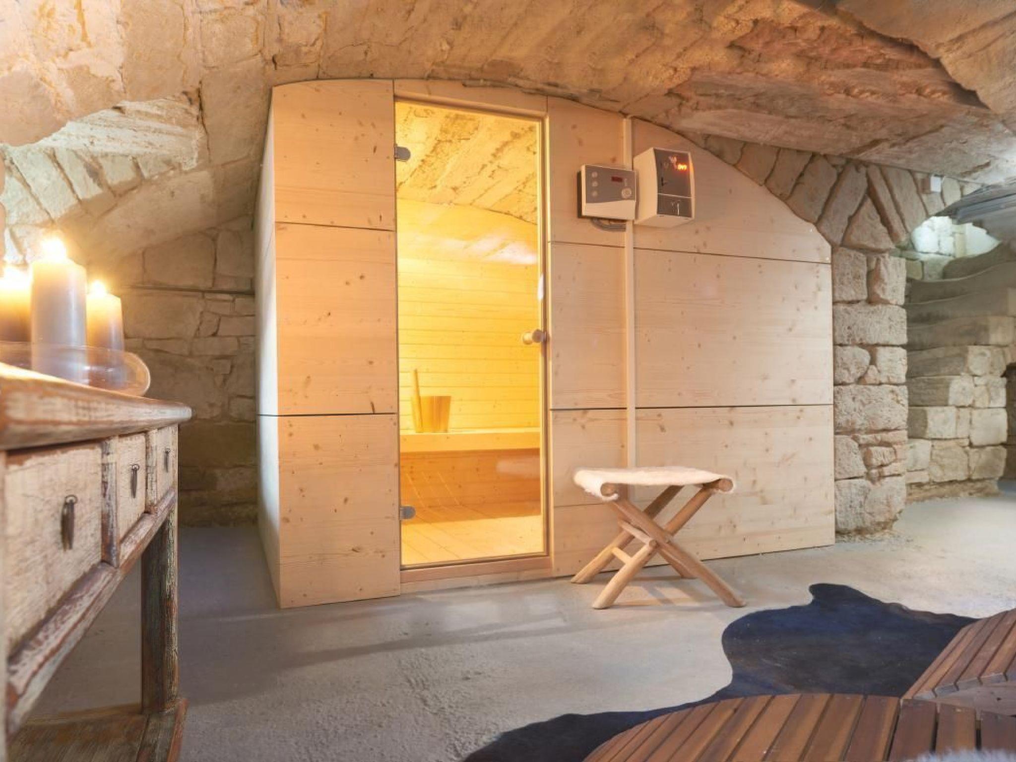 The cosy living room has a wood-burning stove, 3 bedrooms, an eat-in kitchen, two bathrooms with bathtub and a Finnish sauna with relaxation room in the natural stone vaulted cellar.