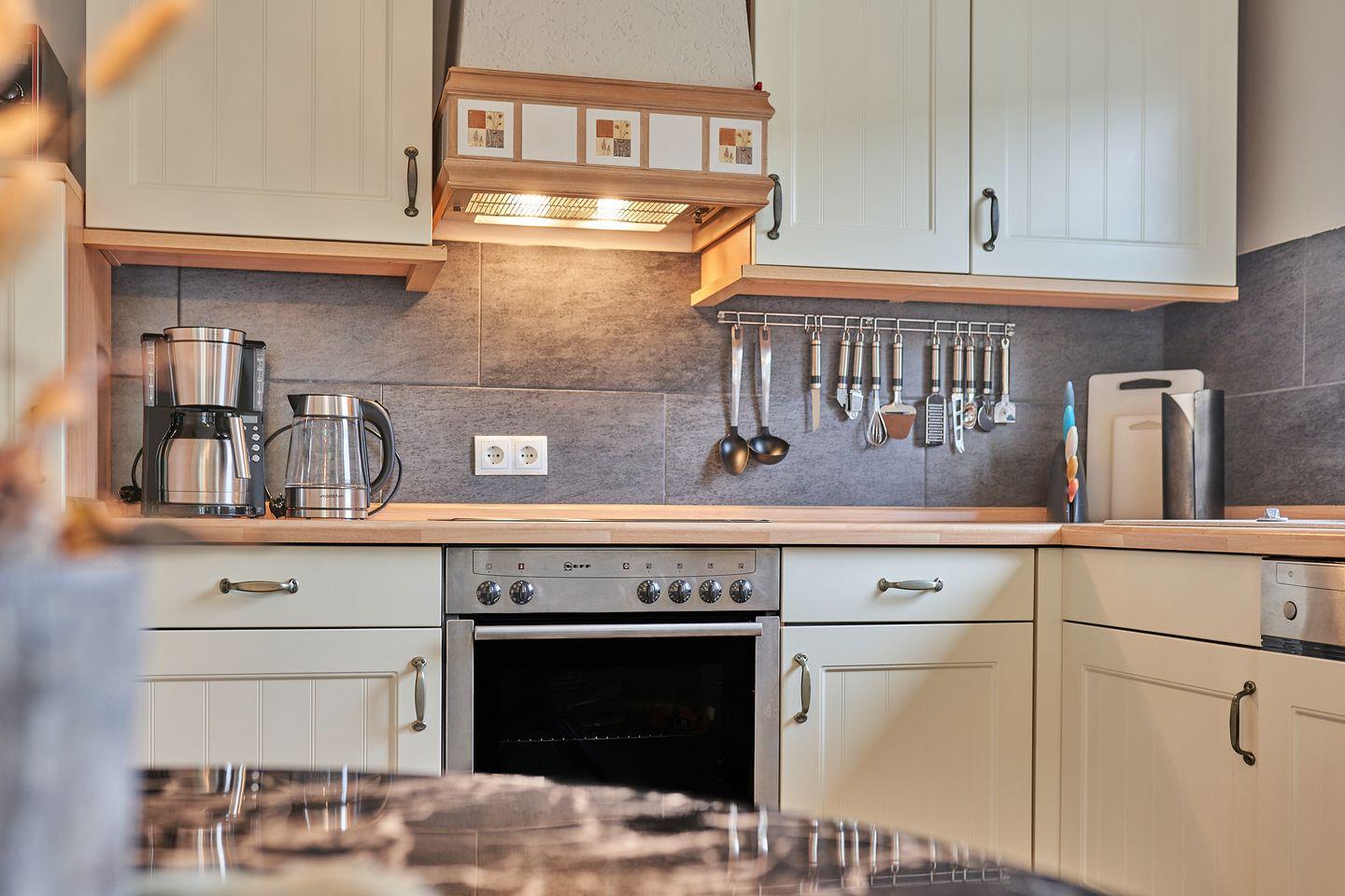 Die Ferienwohnung im Obergeschoss hat eine offene, voll ausgestattete Küche mit angrenzendem Ess- und Wohnzimmer (mit Seeblick), in dem der integrierte Kaminofen (Kaminholz wird kostenlos zur Verfügung gestellt) für eine gemütliche Wärme in den kühlen Monaten sorgt.