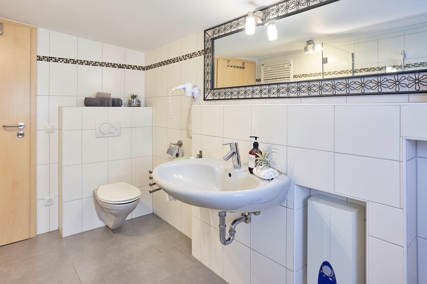 Das Bad verfügt über ein WC, ein Waschbecken und eine ebenerdige Dusche.