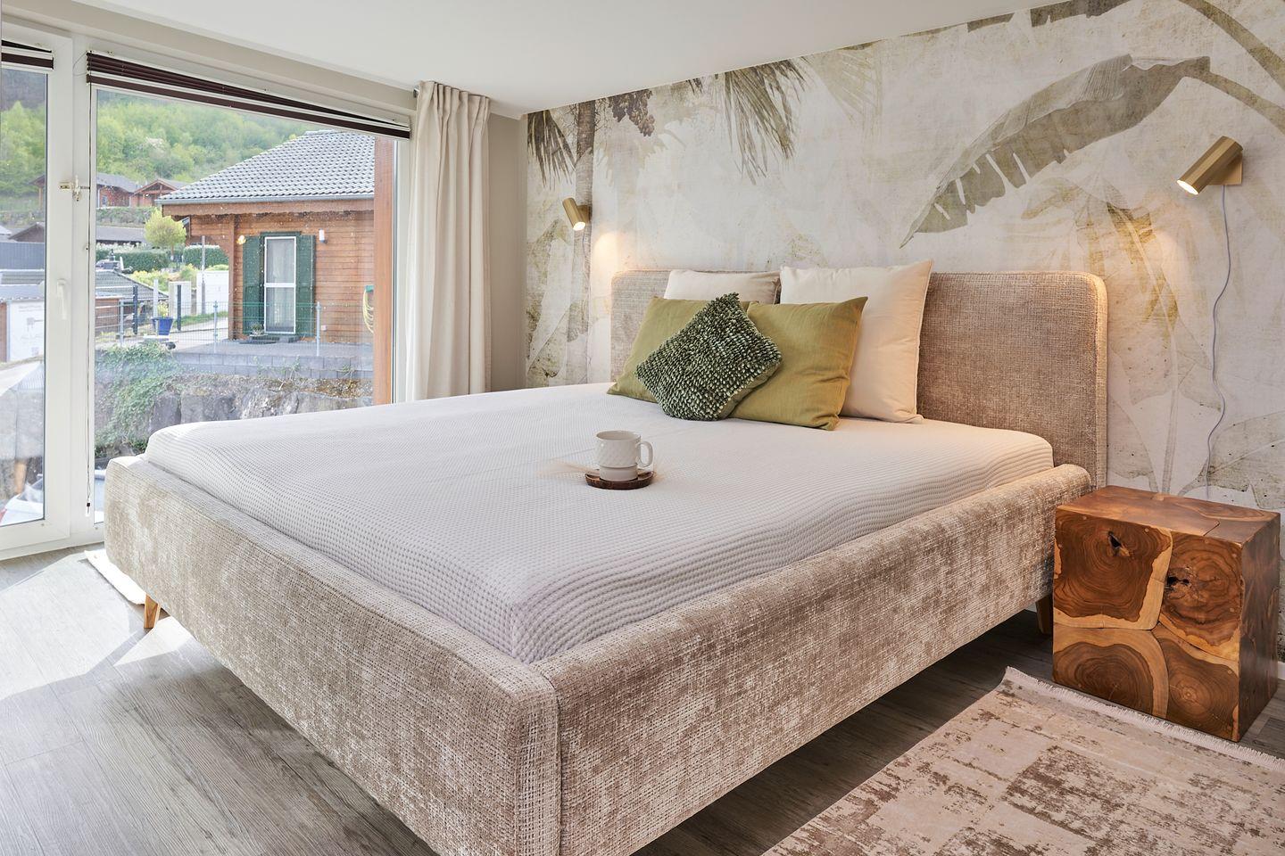 Die Schlafzimmer sind jeweils mit einem Doppelbett (1,80 m x 2,00 m) und einem Kleiderschrank ausgestattet. Ein Schlafzimmer hat Seeblick, das andere Gartenblick.