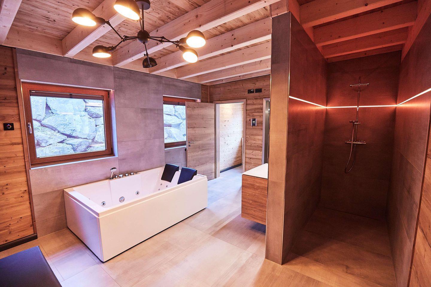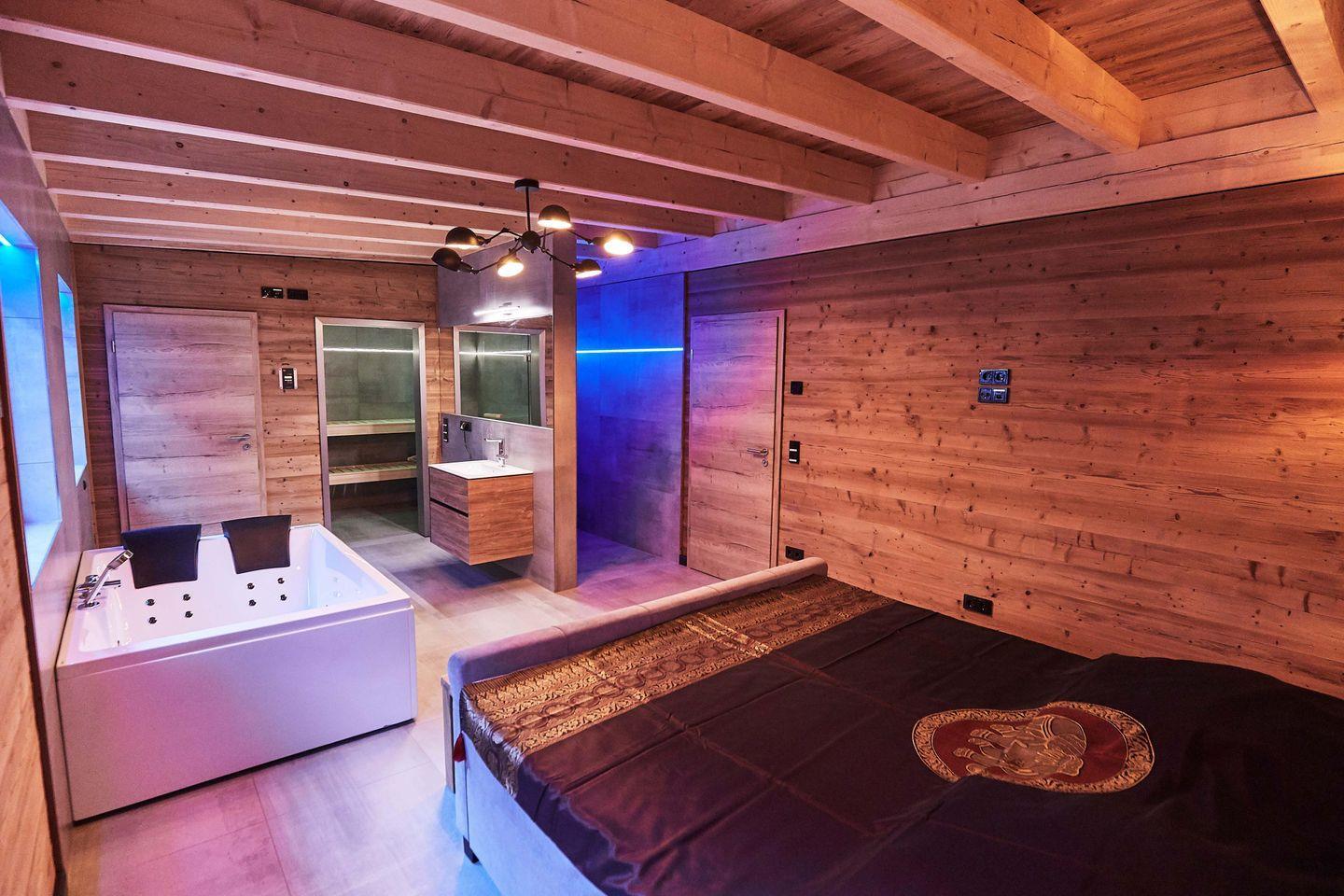 Dieses geräumige Schlafzimmer bietet ein komfortables Boxspringbett (180 x 200 cm), einen Whirlpool, eine ebenerdige XL-Dusche, eine Sauna, ein separates WC, ein großes Waschbecken und einen Fön.