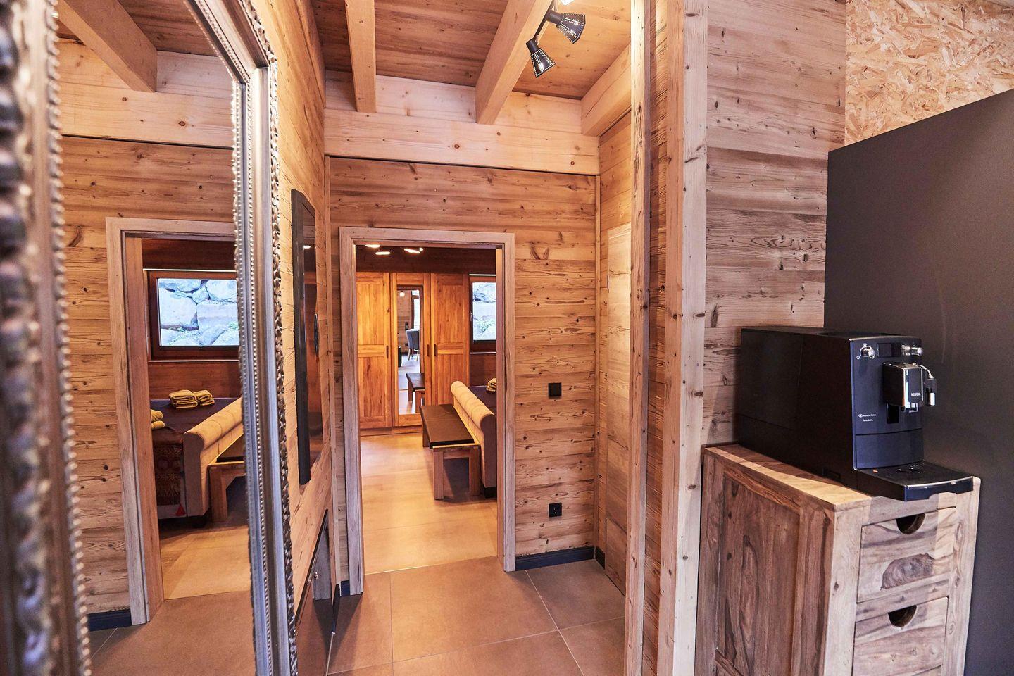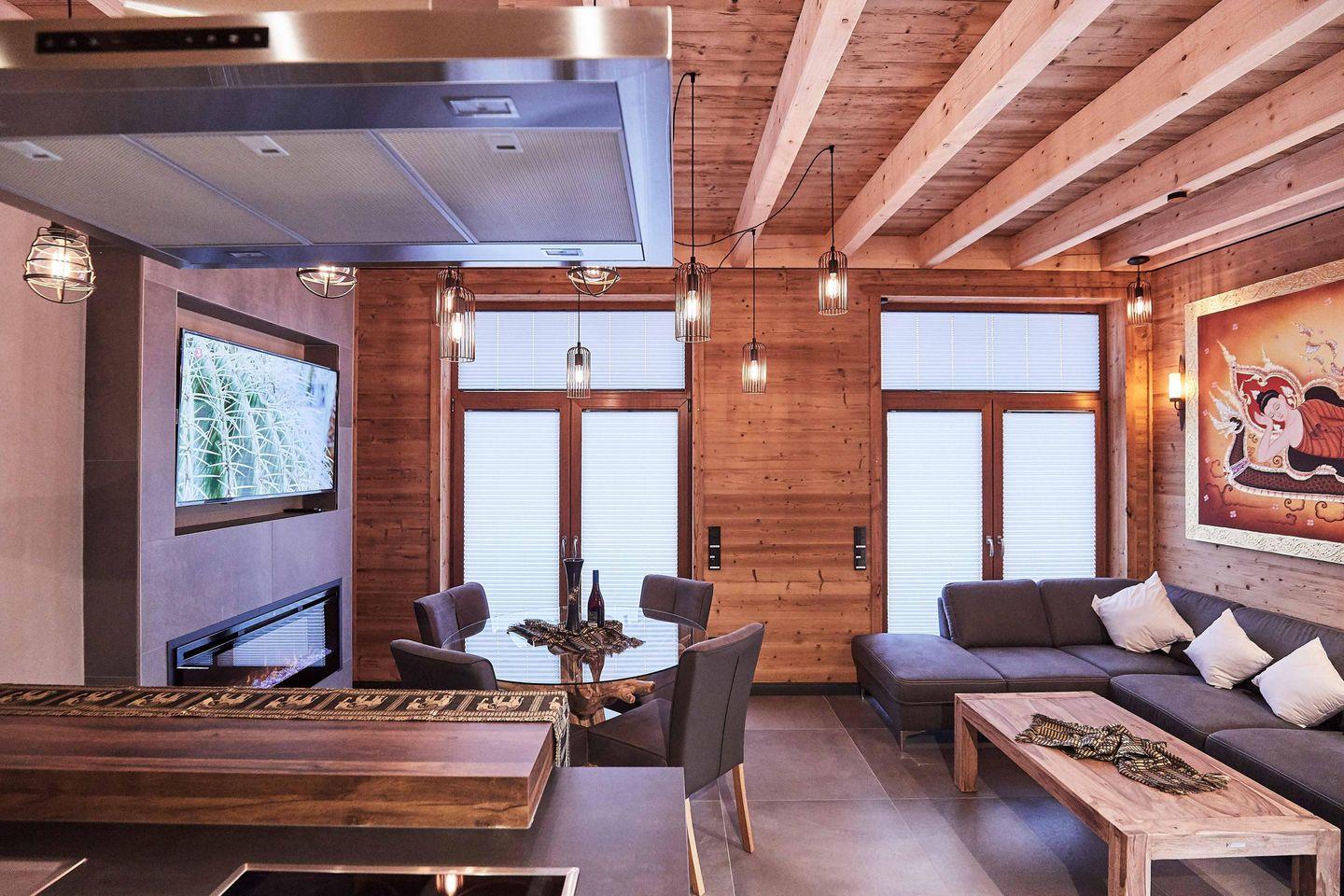 Die moderne, offene Küche ist mit einem Kaffeevollautomaten, Wasserkocher, Spülmaschine, Kühlschrank mit Gefrierfach sowie einem Backofen und einer Mikrowelle ausgestattet. Das angrenzende Wohn-/Esszimmer verfügt über einen E-Kamin, einen 65-Zoll-Flachbildfernseher und eine HiFi-Anlage.