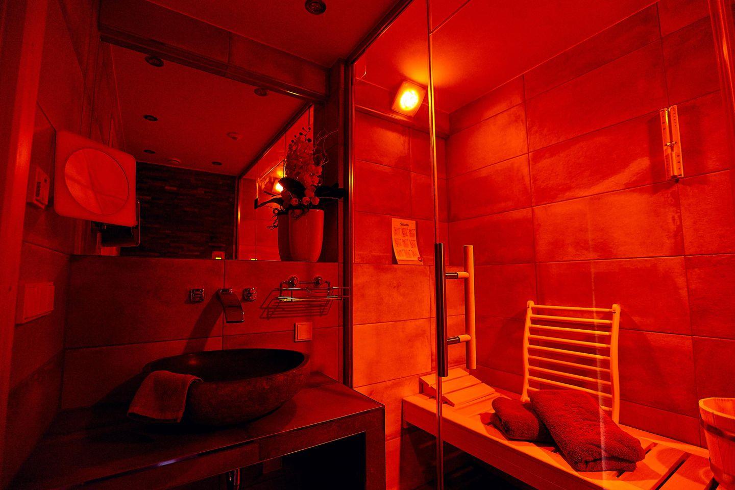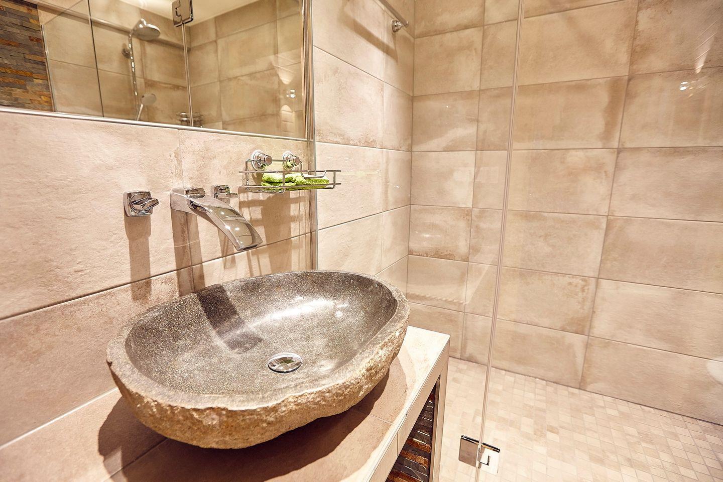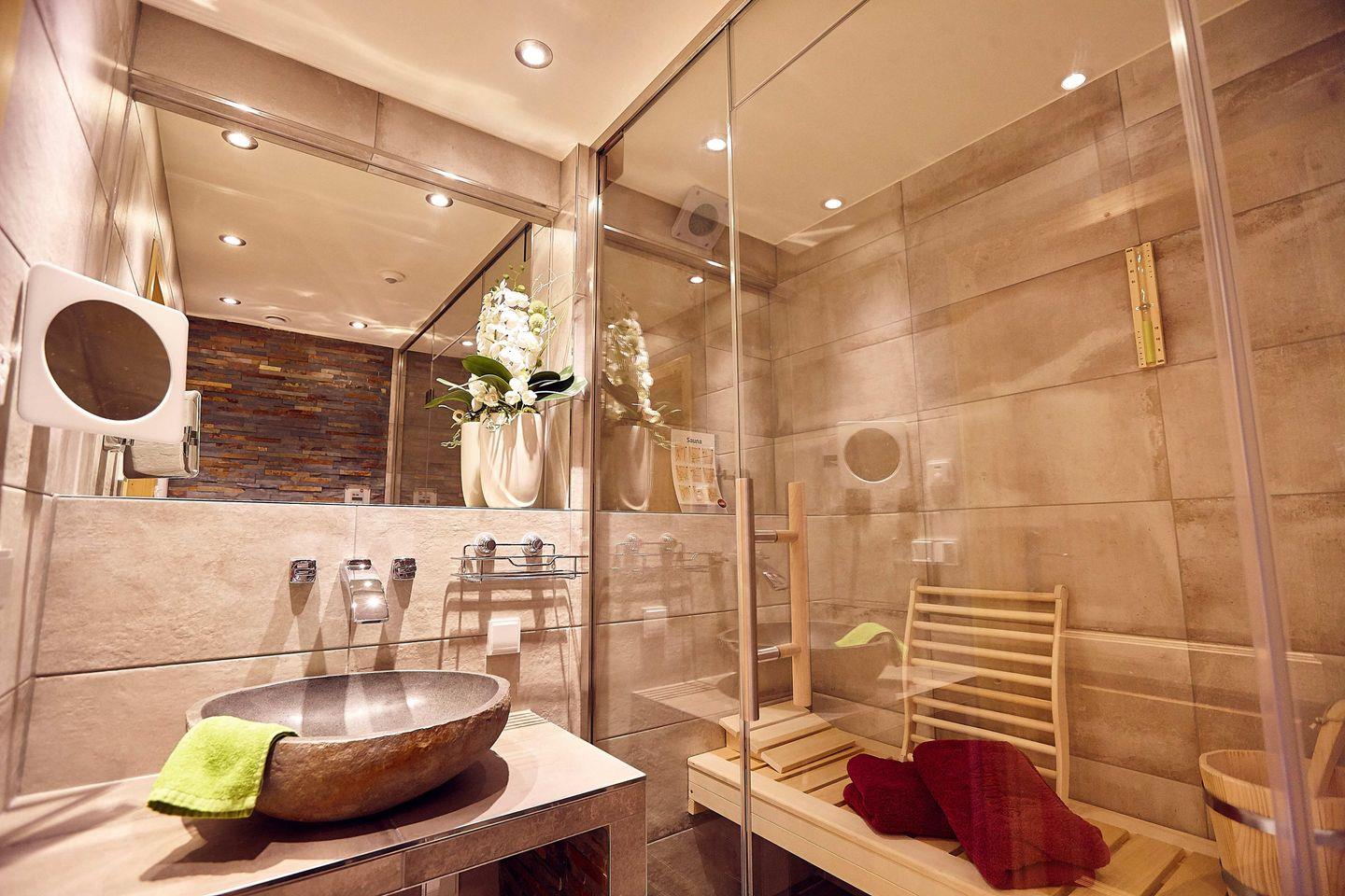 Die beiden Bäder sind perfekt ausgestattet: Eines verfügt über eine großzügige XL-Dusche, Waschbecken und WC, während das andere eine XL-Sauna, Waschbecken und WC bietet.