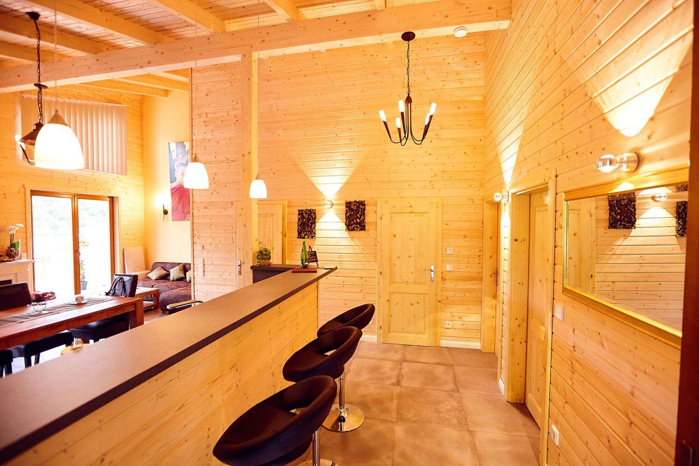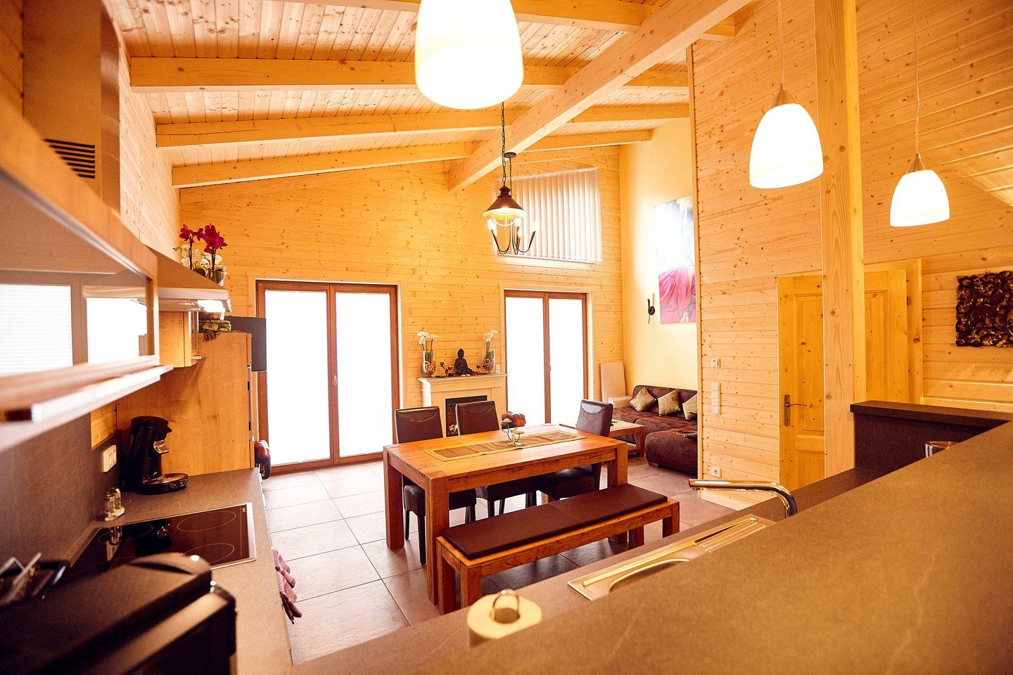 Die Innenausstattung umfasst eine offene Küche mit Theke, ausgestattet mit einem Kaffeevollautomaten, Wasserkocher, Spülmaschine, Kühlschrank mit Gefrierfach, Backofen und Mikrowelle. Das angrenzende Wohn-/Esszimmer verfügt über einen E-Kamin, einen 65-Zoll-Flachbildfernseher und eine HiFi-Anlage. Von hier aus gelangen Sie direkt zur traumhaften Terrasse, die mit Gartenmöbeln, Sonnenschirm und Grill ausgestattet ist.