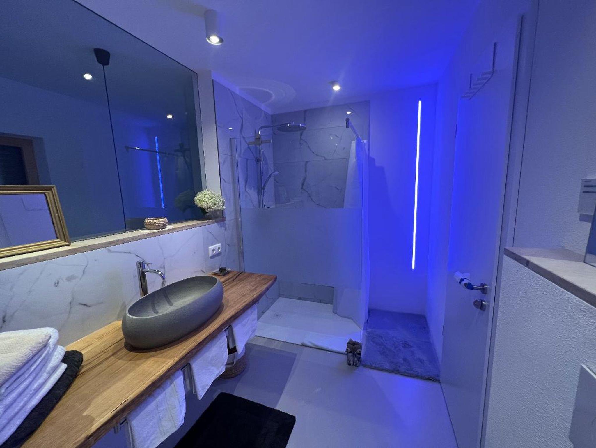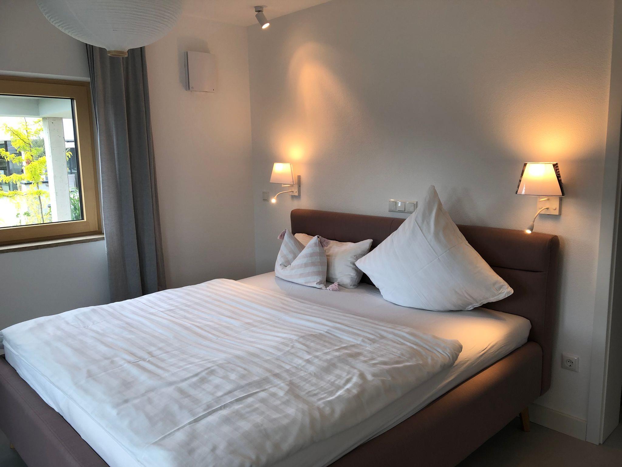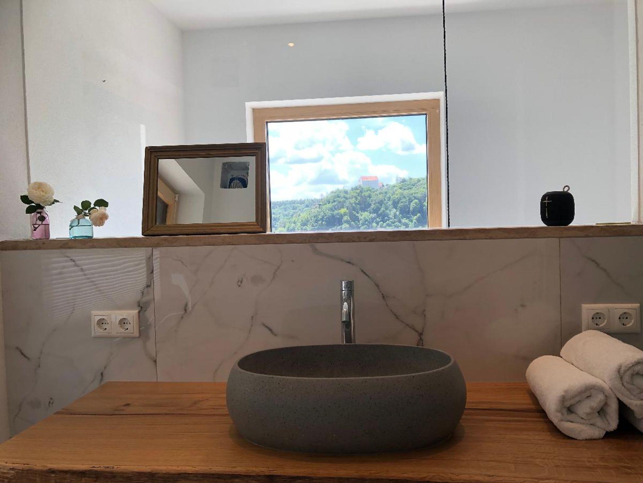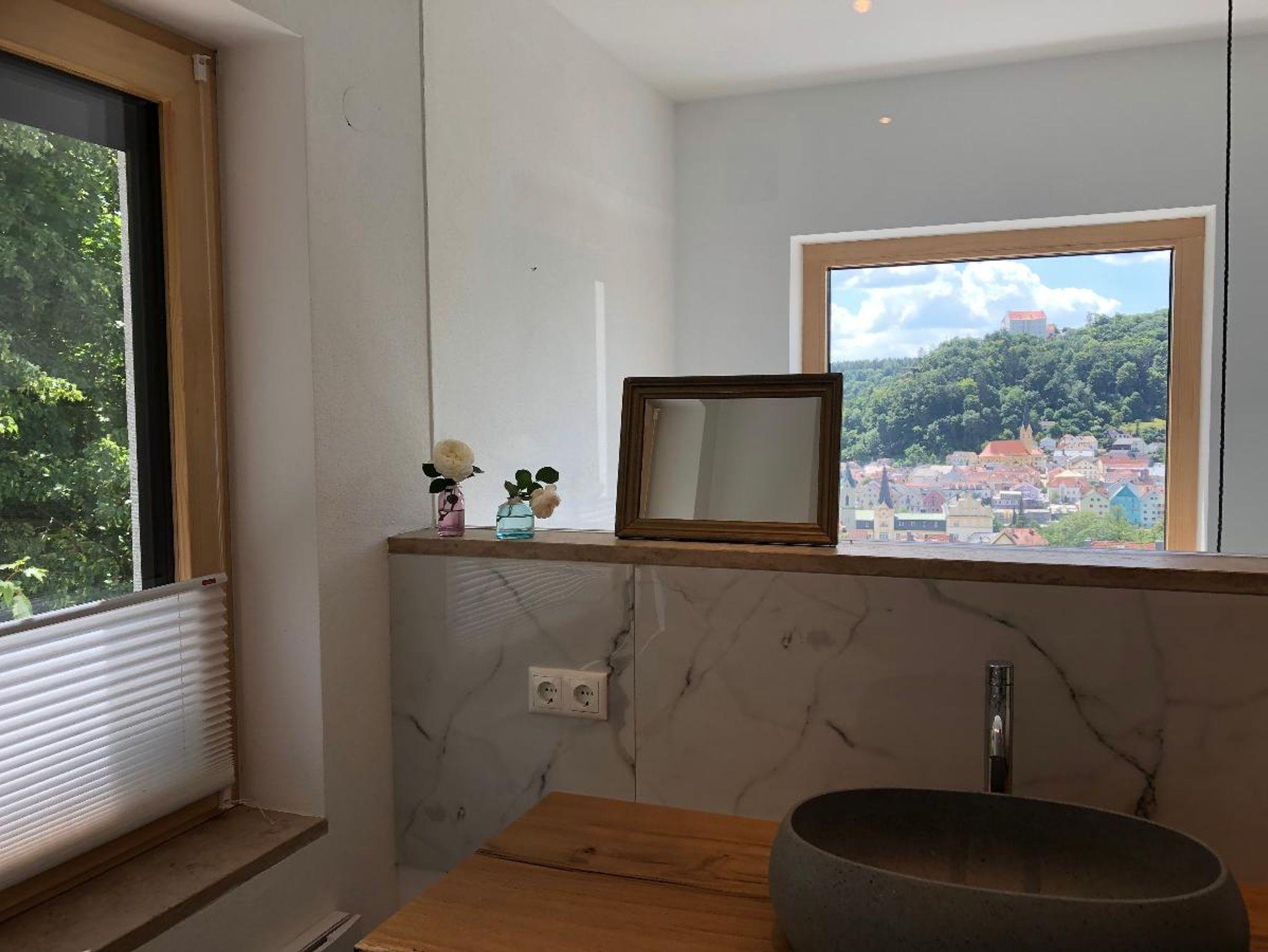 Das Schlafzimmer ist hell und ruhig und bietet vom Bett aus einen herrlichen Blick auf den Ort. Getrennt durch eine Türe befindet sich das zweite Schlafzimmer mit Kleiderschrank. Das Bad befindet sich auf der gleichen Etage mit Blick auf Riedenburg und die Rosenburg. Eine Schlafcouch bietet Platz für weitere 2 Personen.