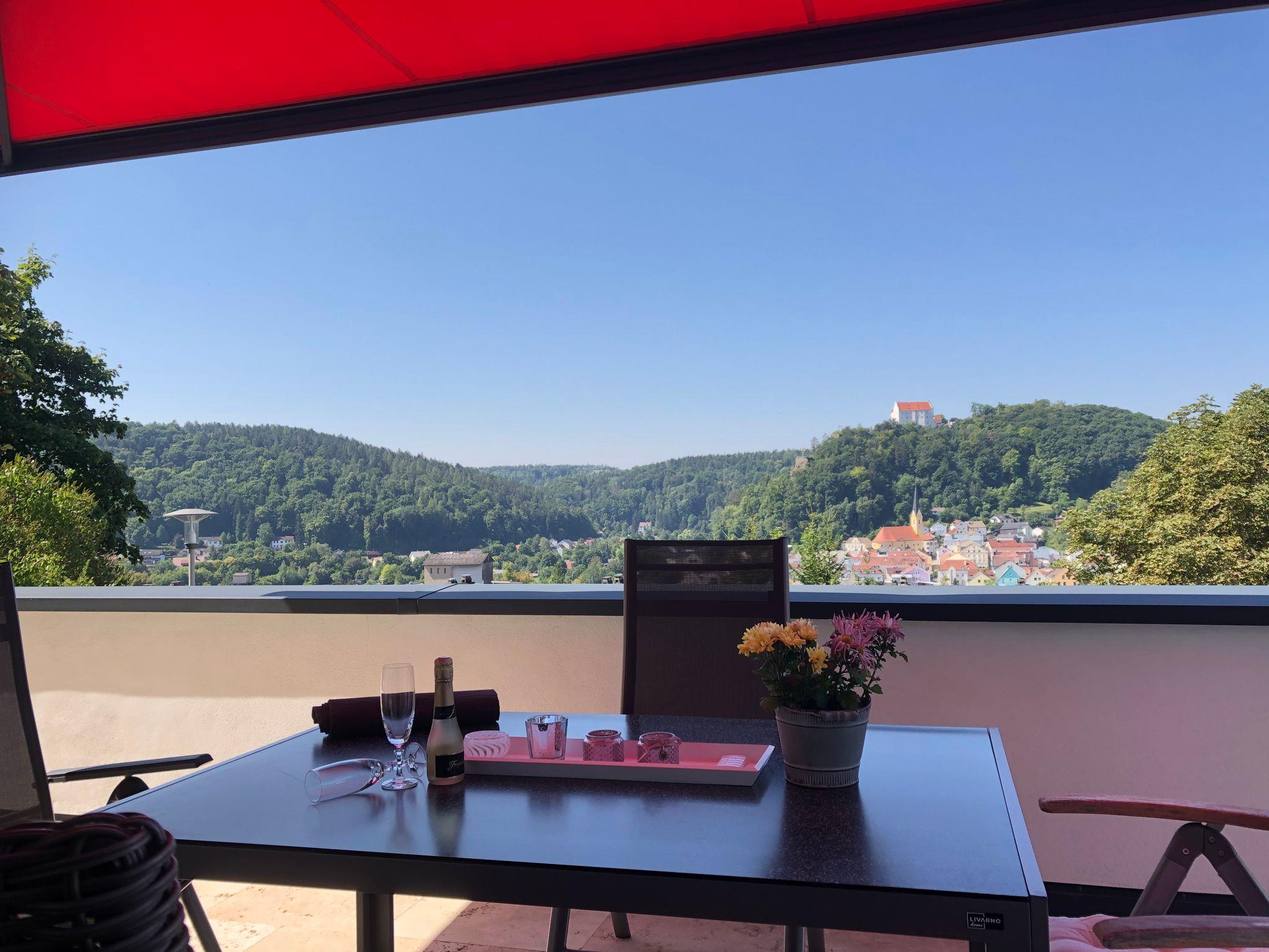 Es steht Ihnen eine möblierte Natursteinterrasse mit fantastischem Blick auf Riedenburg zur Verfügung.