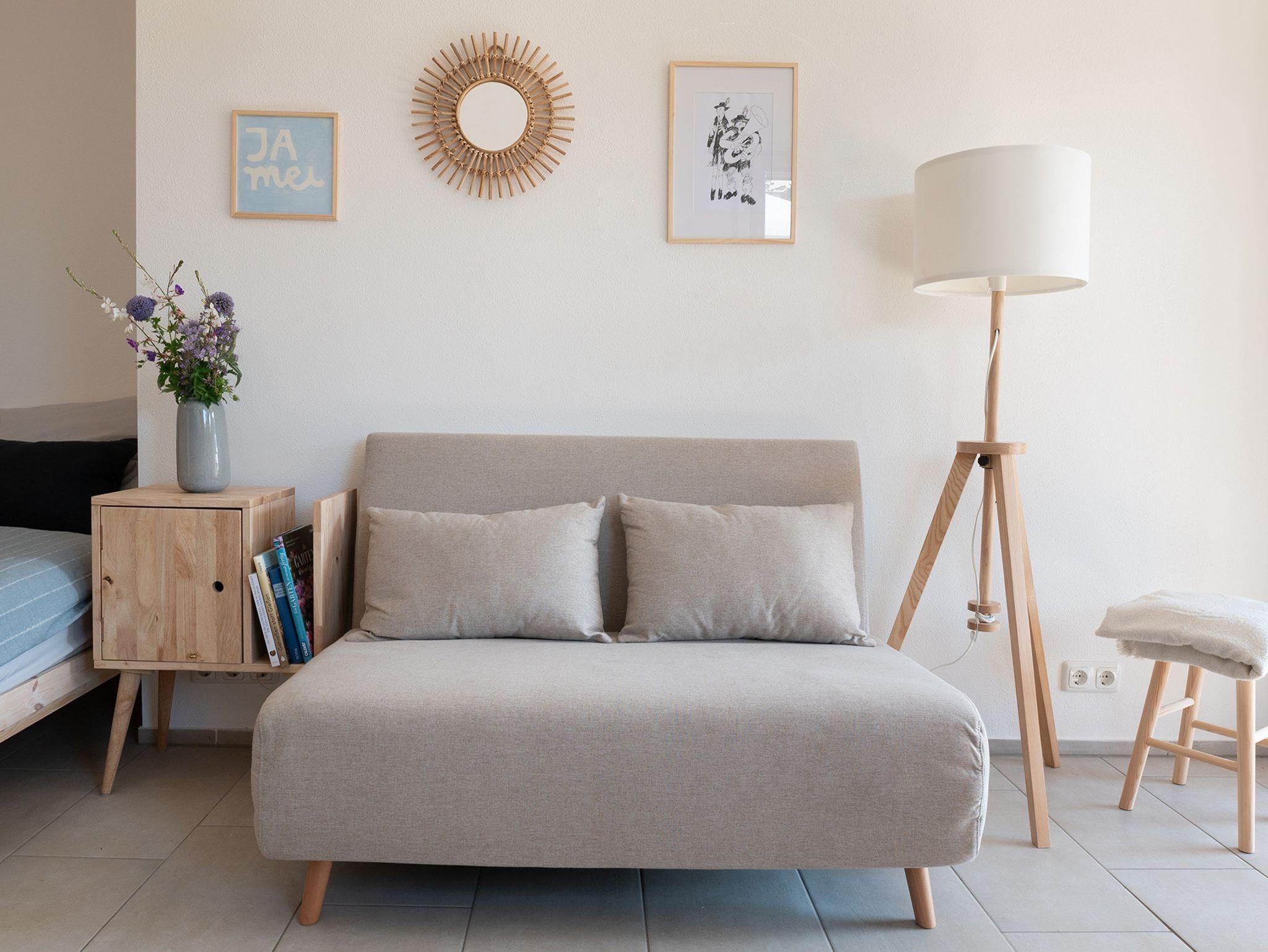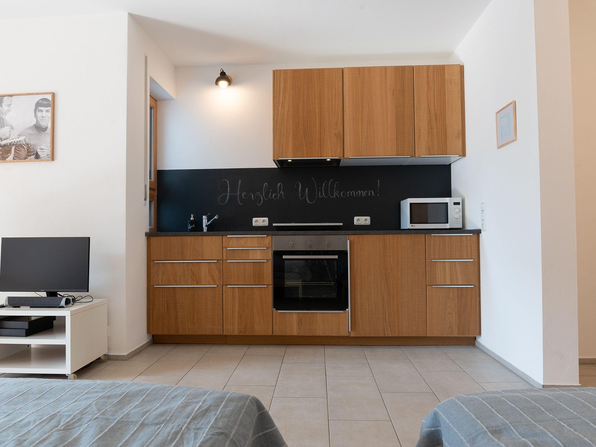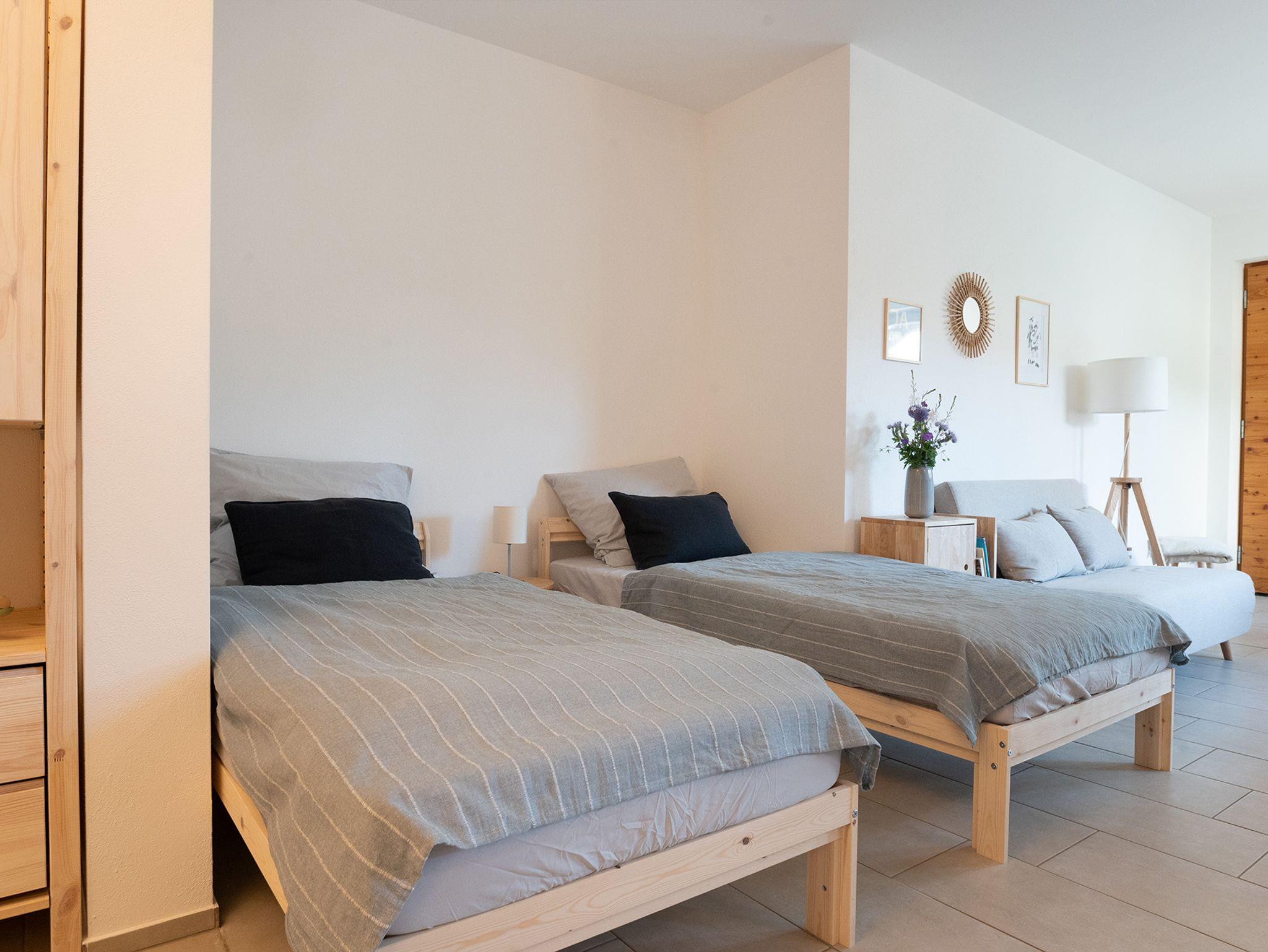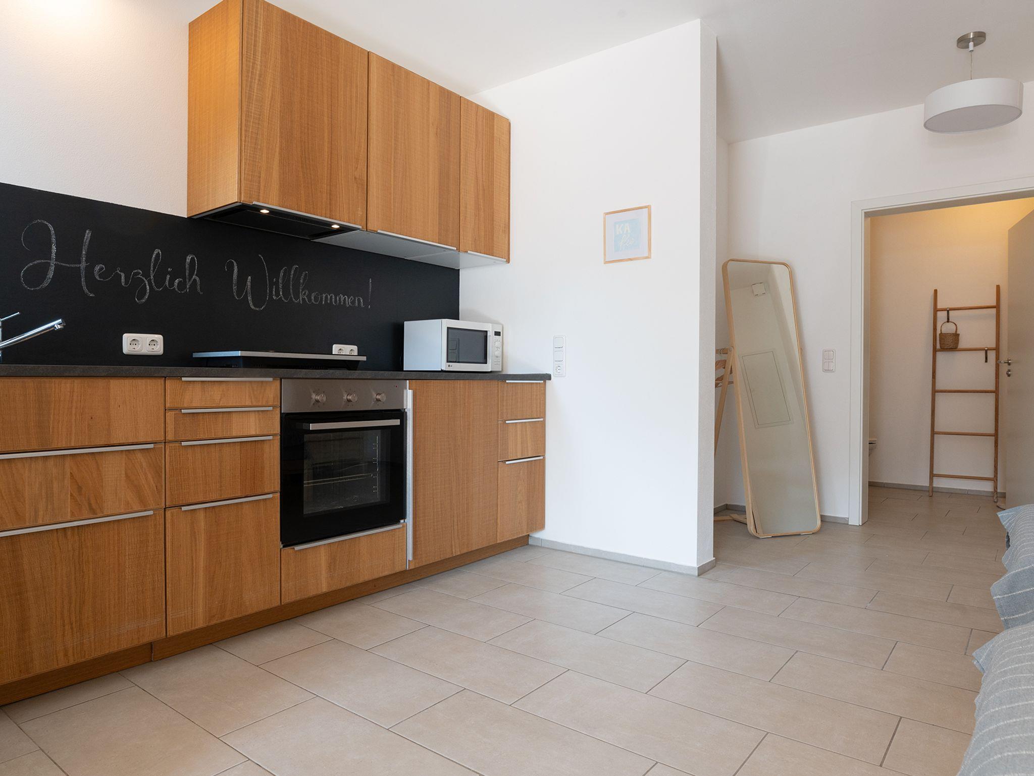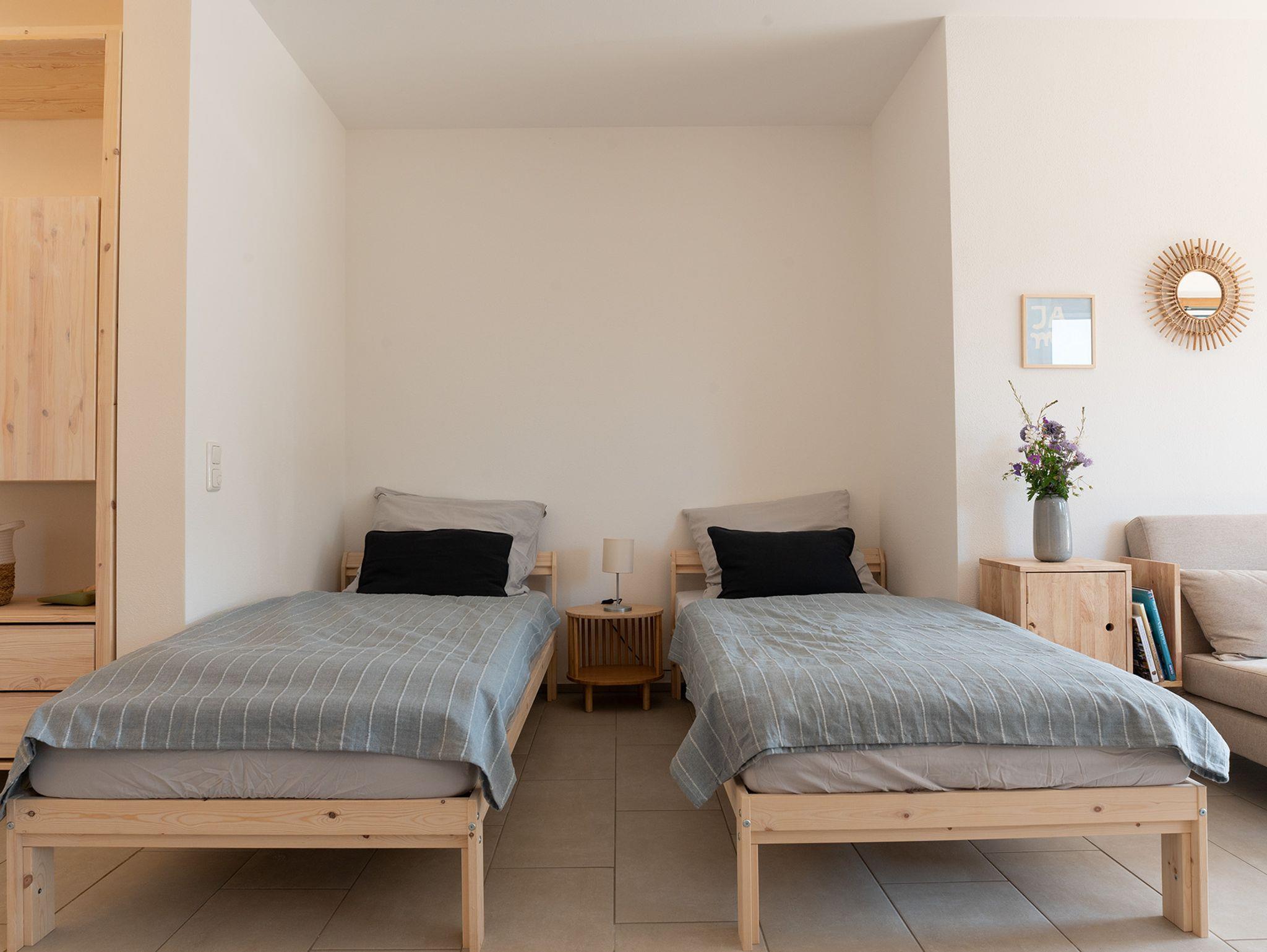 Die Wohnung verfügt über einen separaten Eingang mit eigener Haustu¨re. Der geräumige Wohn-und Schlafbereich bietet eine gemütliche Essecke mit schönen Einblicken in den Garten. Auf dem Sofa können Sie in der für Sie bereit gestellten Literatur schmökern oder vor dem Fernseher den Abend ausklingen lassen. Selbstverständlich haben Sie in der Wohnung und im Garten WLAN-Zugang. Die beiden Einzelbetten können auf Wunsch zusammengeschoben werden. In der Ku¨chenzeile finden Sie ein separates Induktionskochfeld, Backofen, French Press, Ku¨hlschrank mit Gefrierfach, Mikrowelle und allerhand Koch-und Essgeschirr.