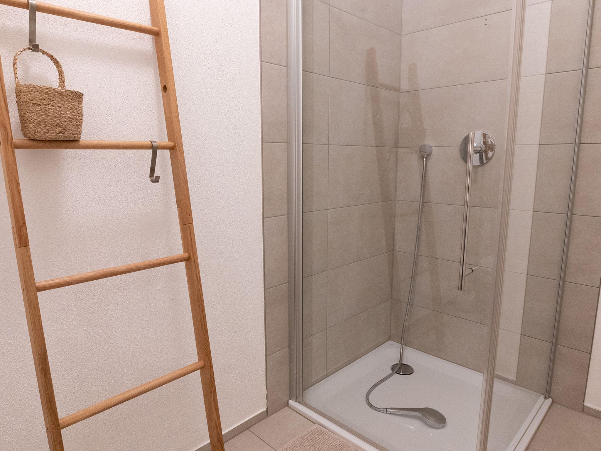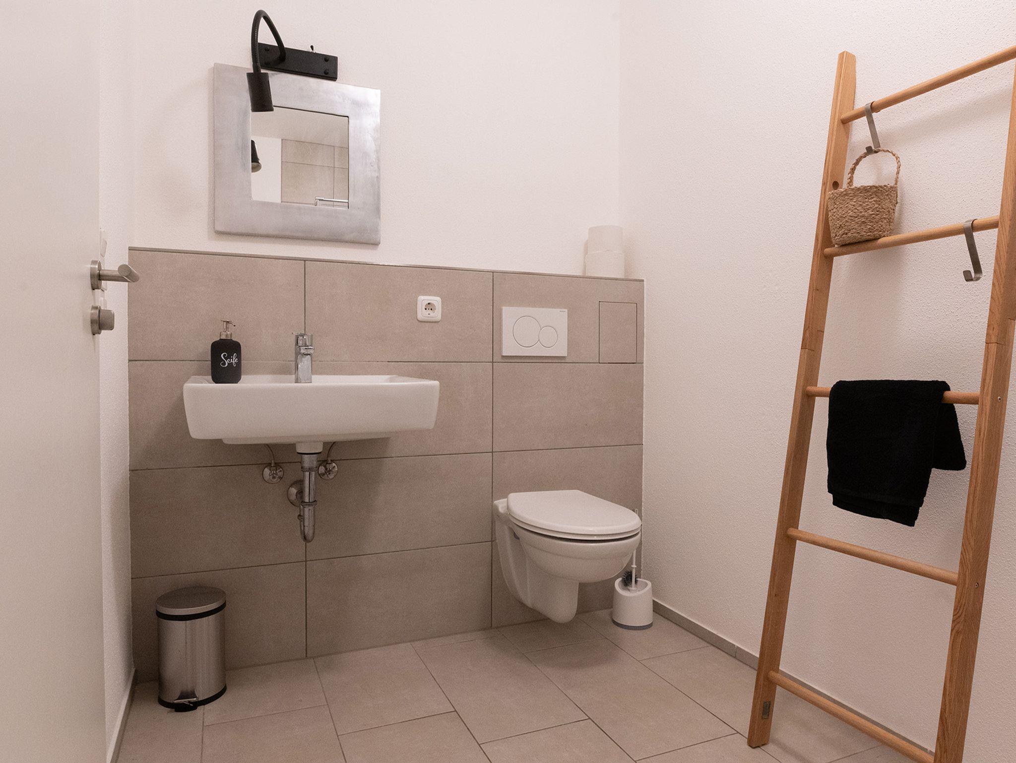 Im hinteren Bereich der Wohnung befindet sich ein kleiner Ankleidebereich mit Standspiegel. Das funktionale Badezimmer verfügt über Dusche, WC und Waschbecken.