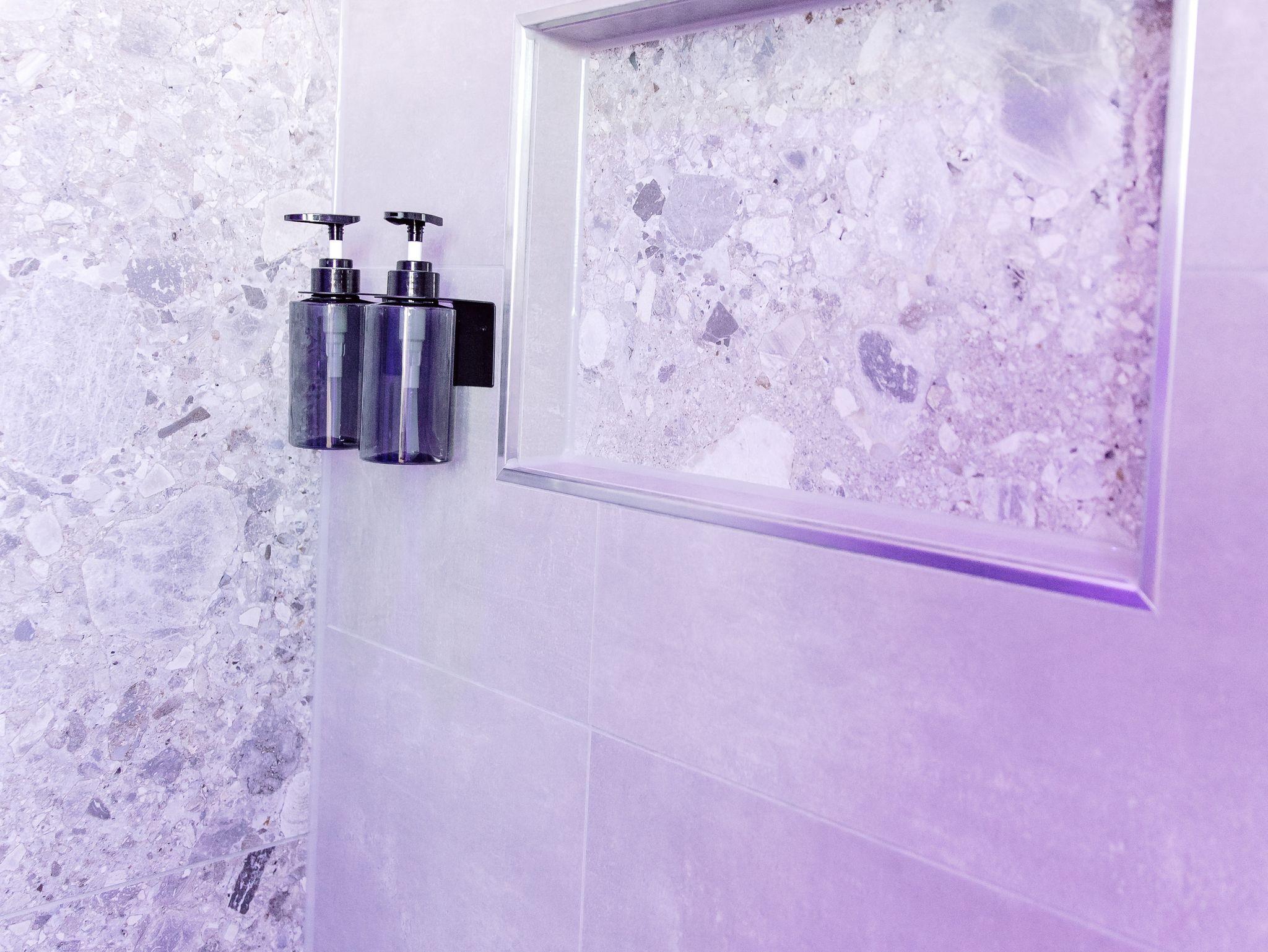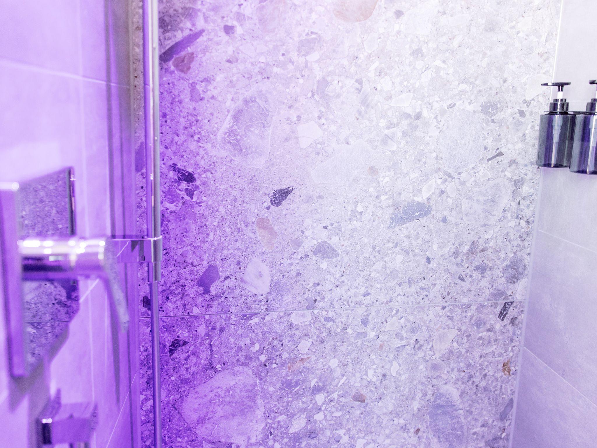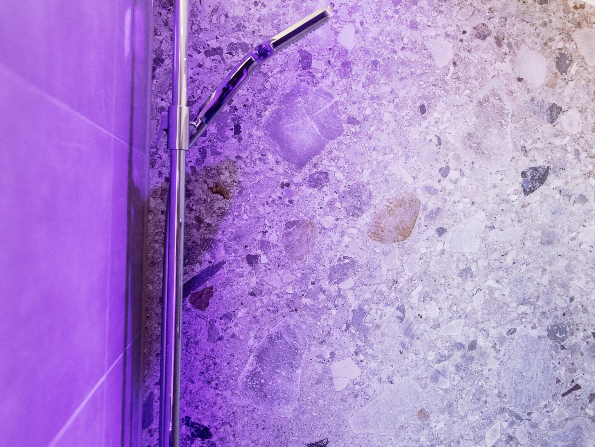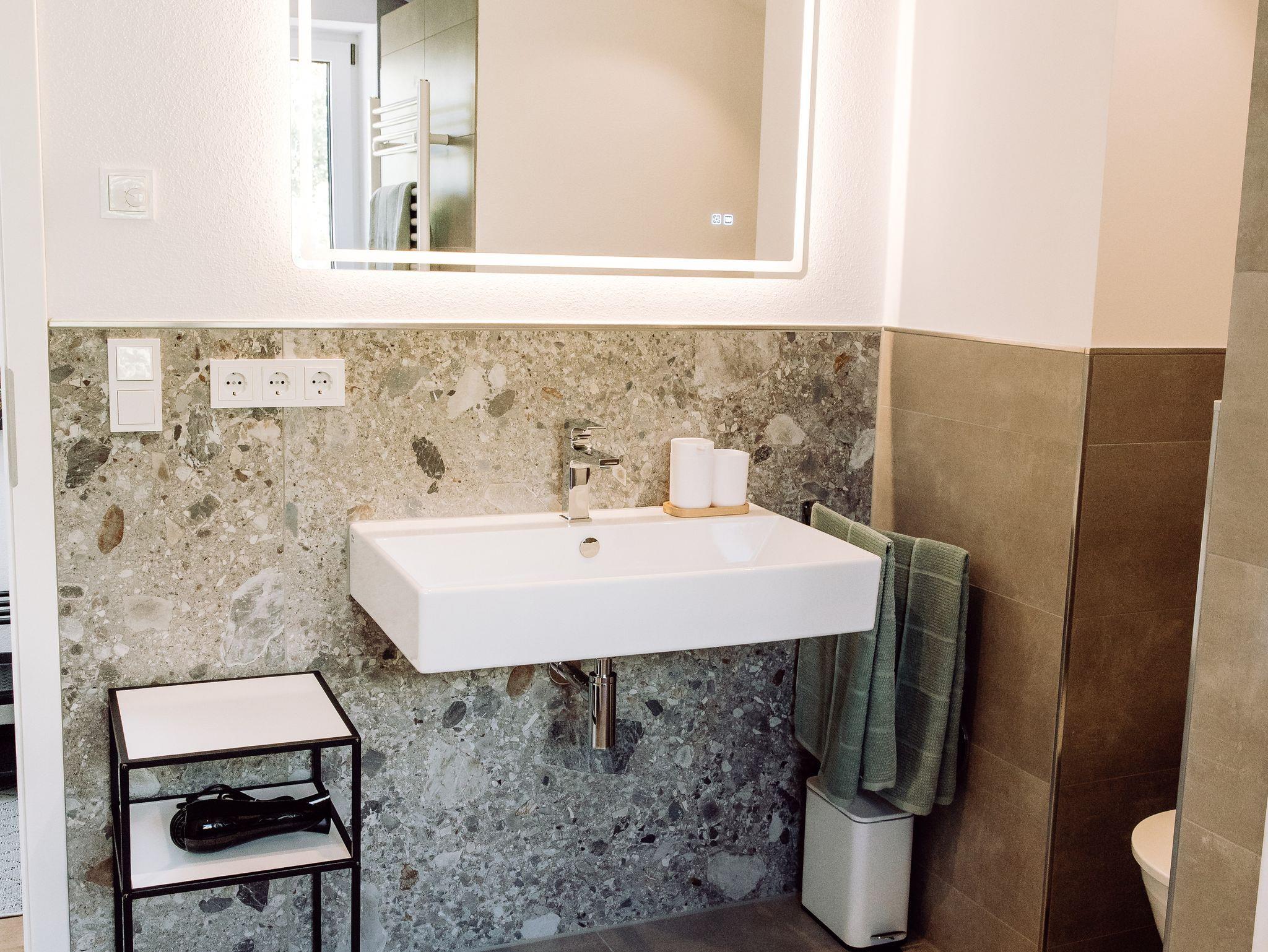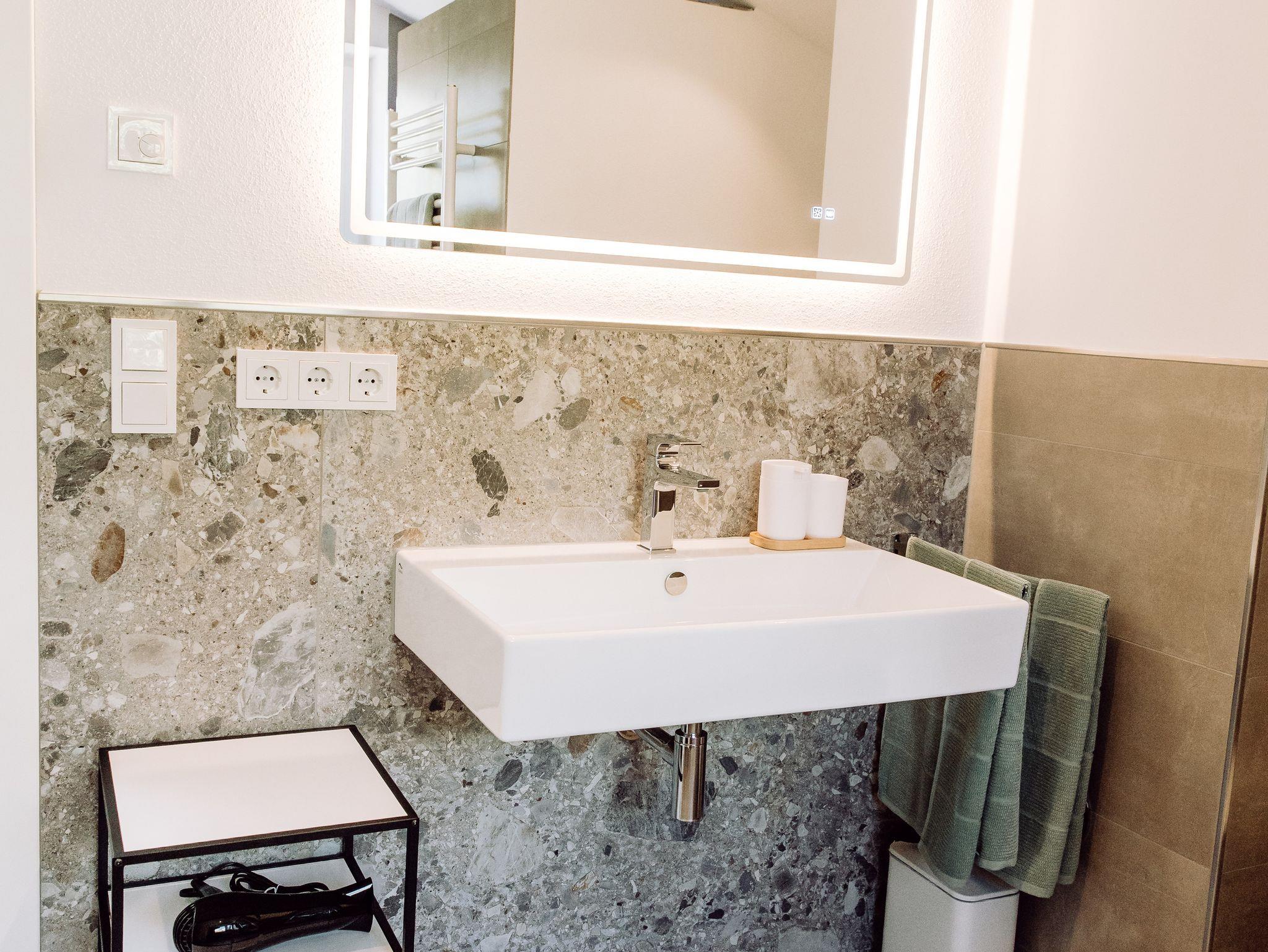 Das große moderne Bad verfügt über eine komfortable Dusche, stilvolle Amaturen und helle, freundliche Materialien.