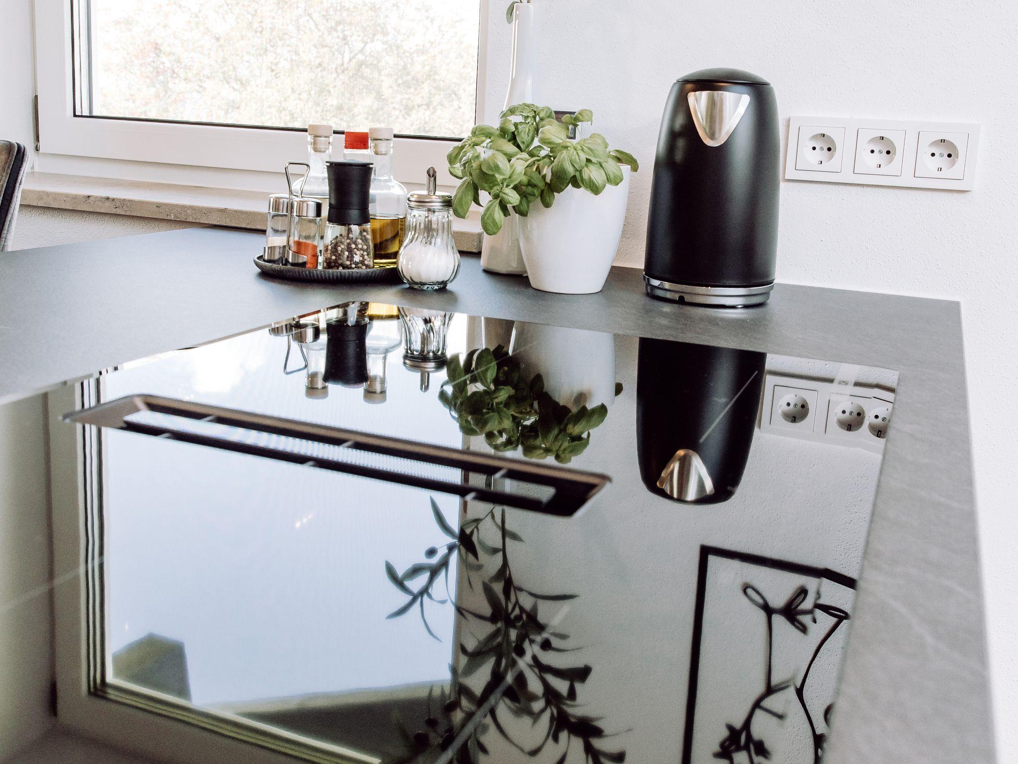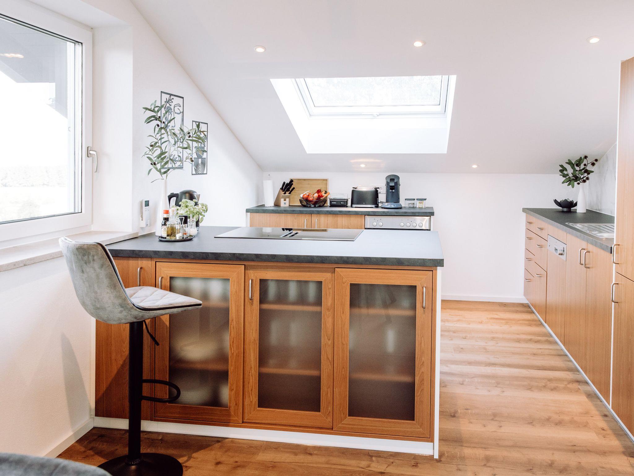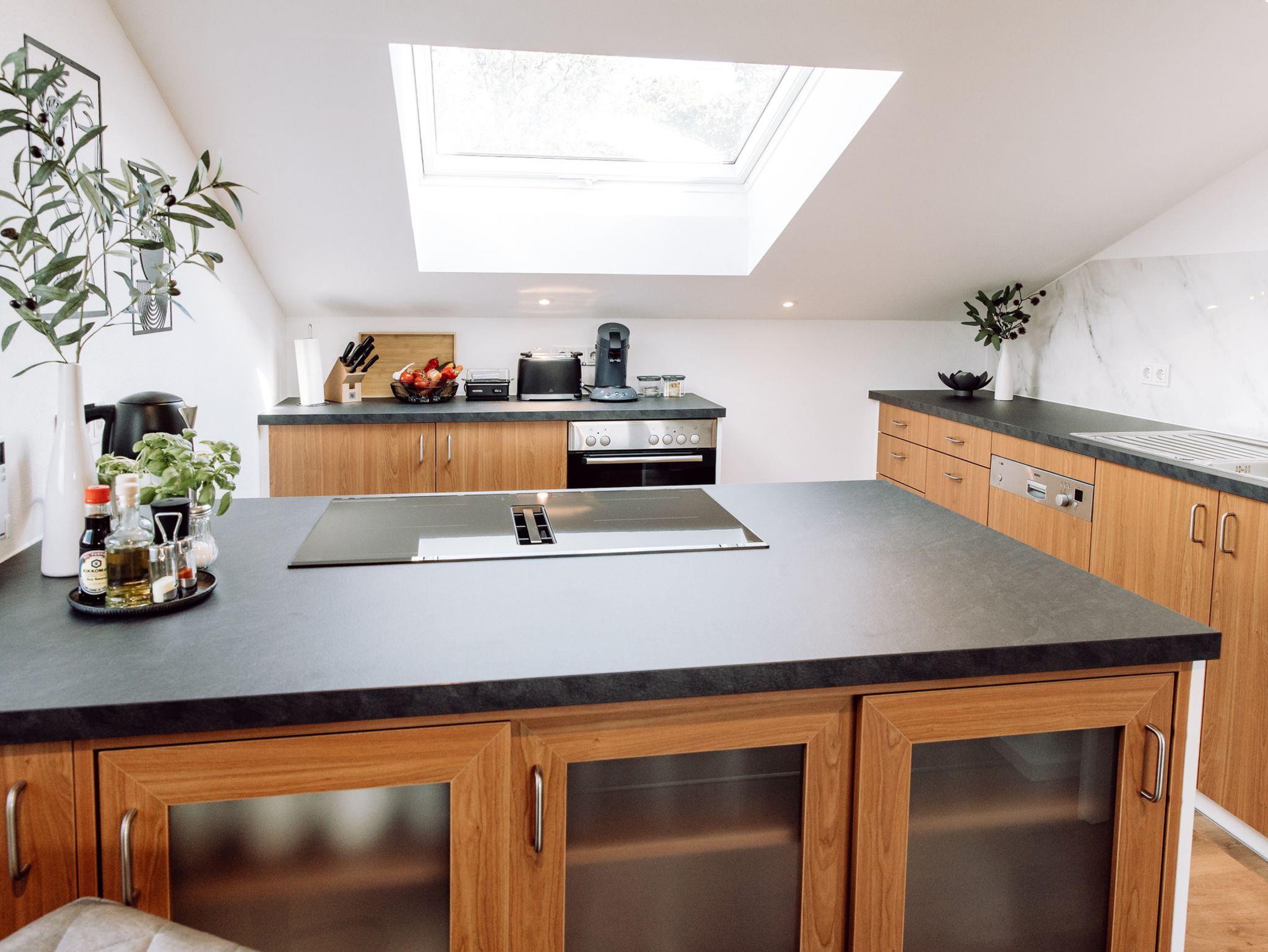 Die voll ausgestattete Küche mit Kochinsel lässt keine Wünsche offen: Moderne Geräte, großzügige Arbeitsflächen bieten alles für das gemeinsame Kochen.