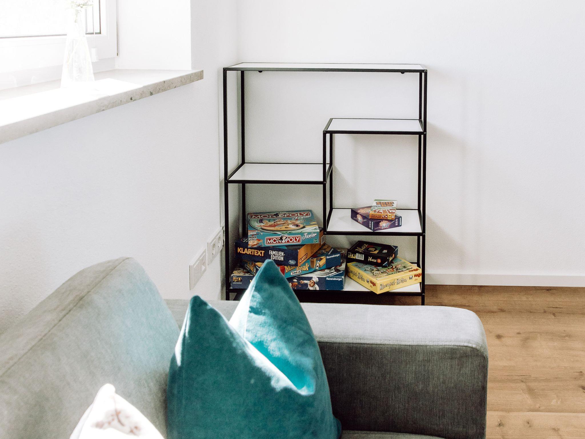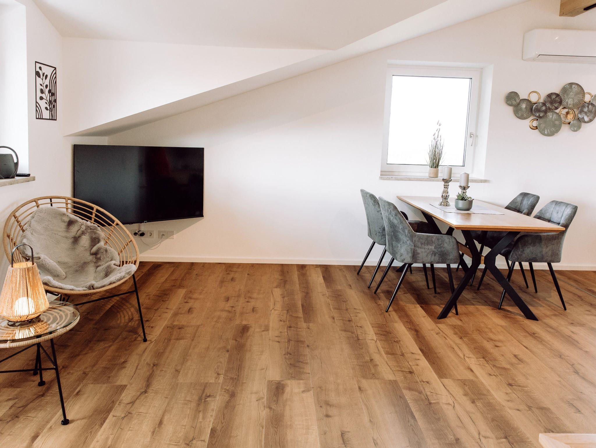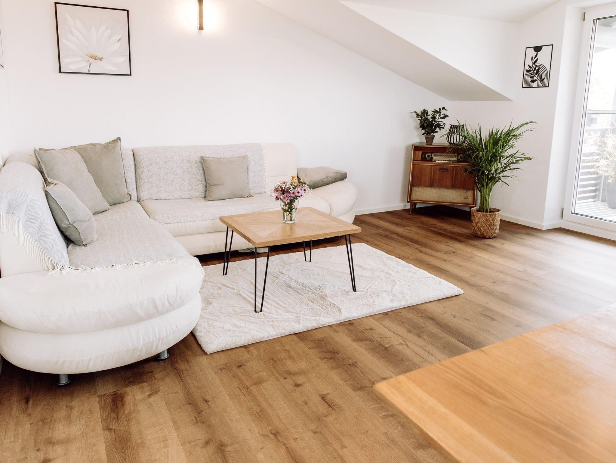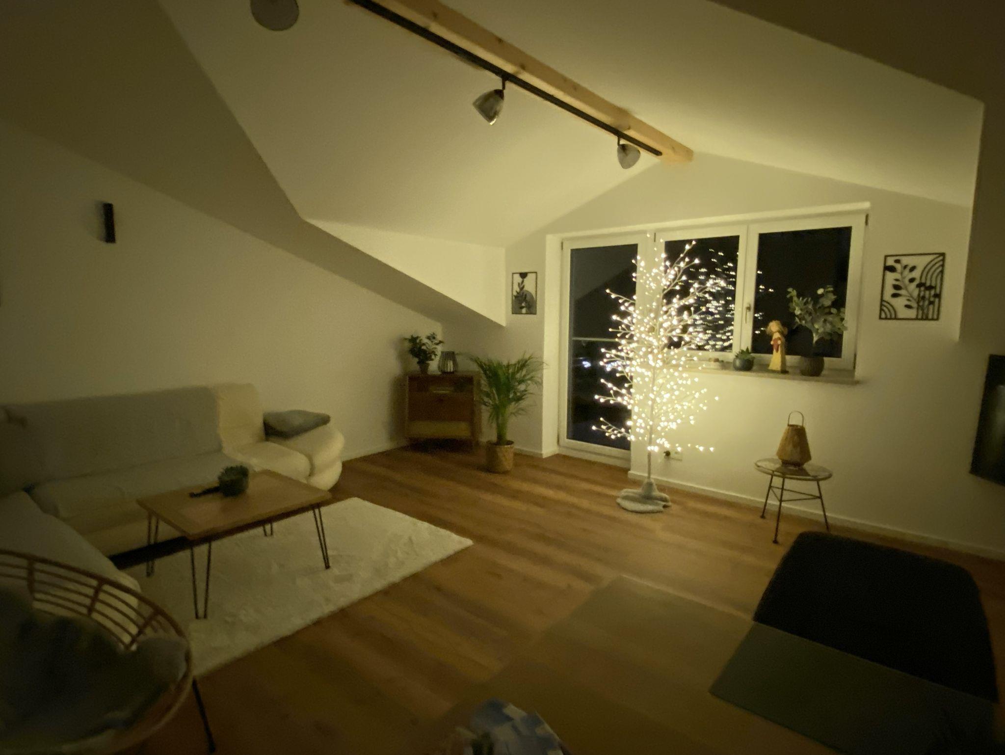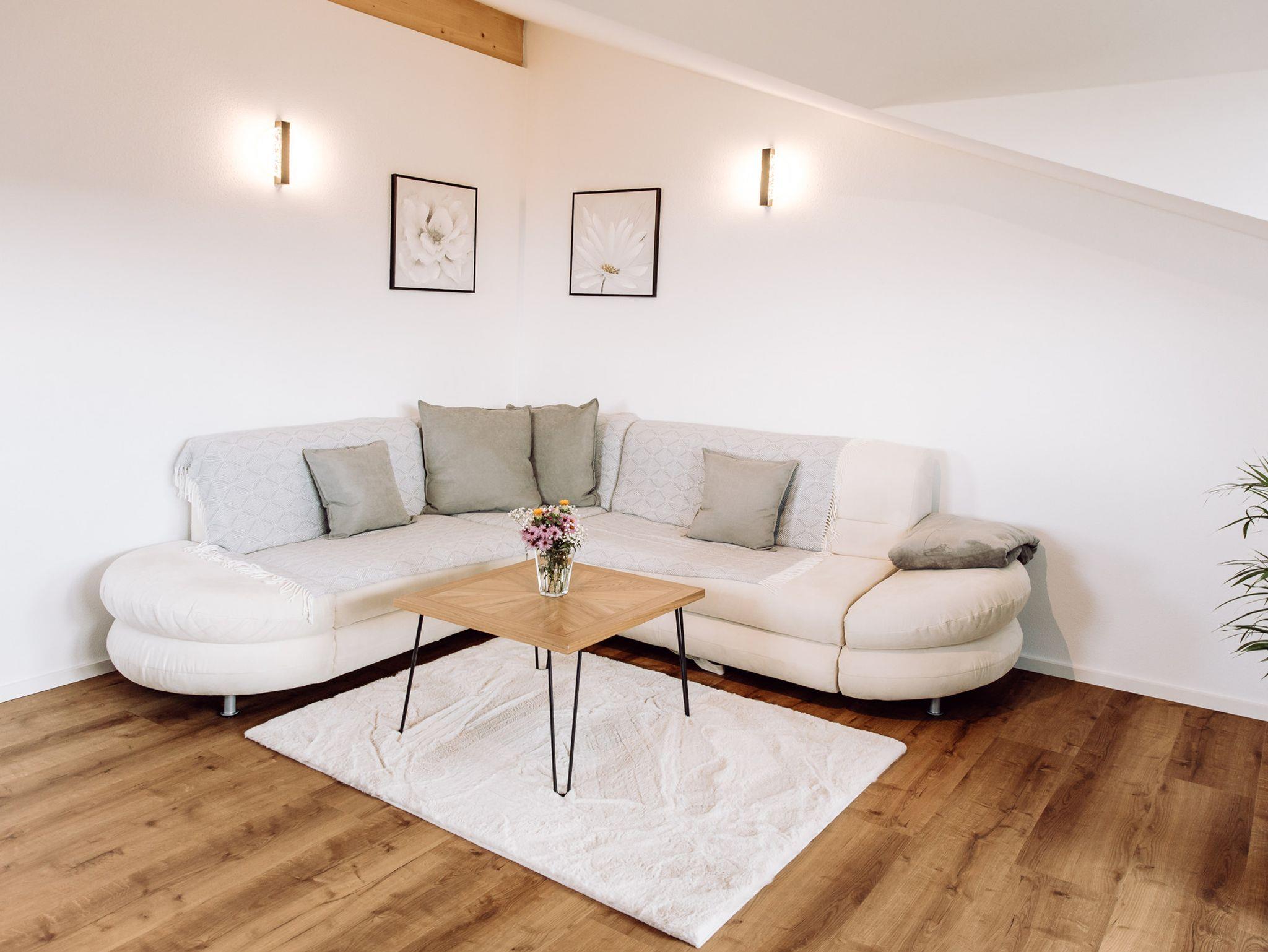 Das Wohnzimmer überzeugt durch seine einladende Atmosphäre und den besonderen Charme der Dachgaube. Ein großes, gemütliches Sofa und der 55 Zoll Fernseher eignen sich hervorragend zum Entspannen.