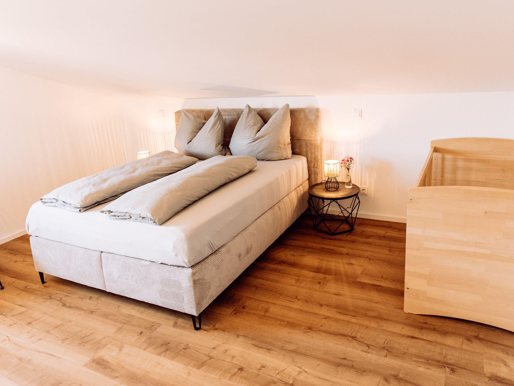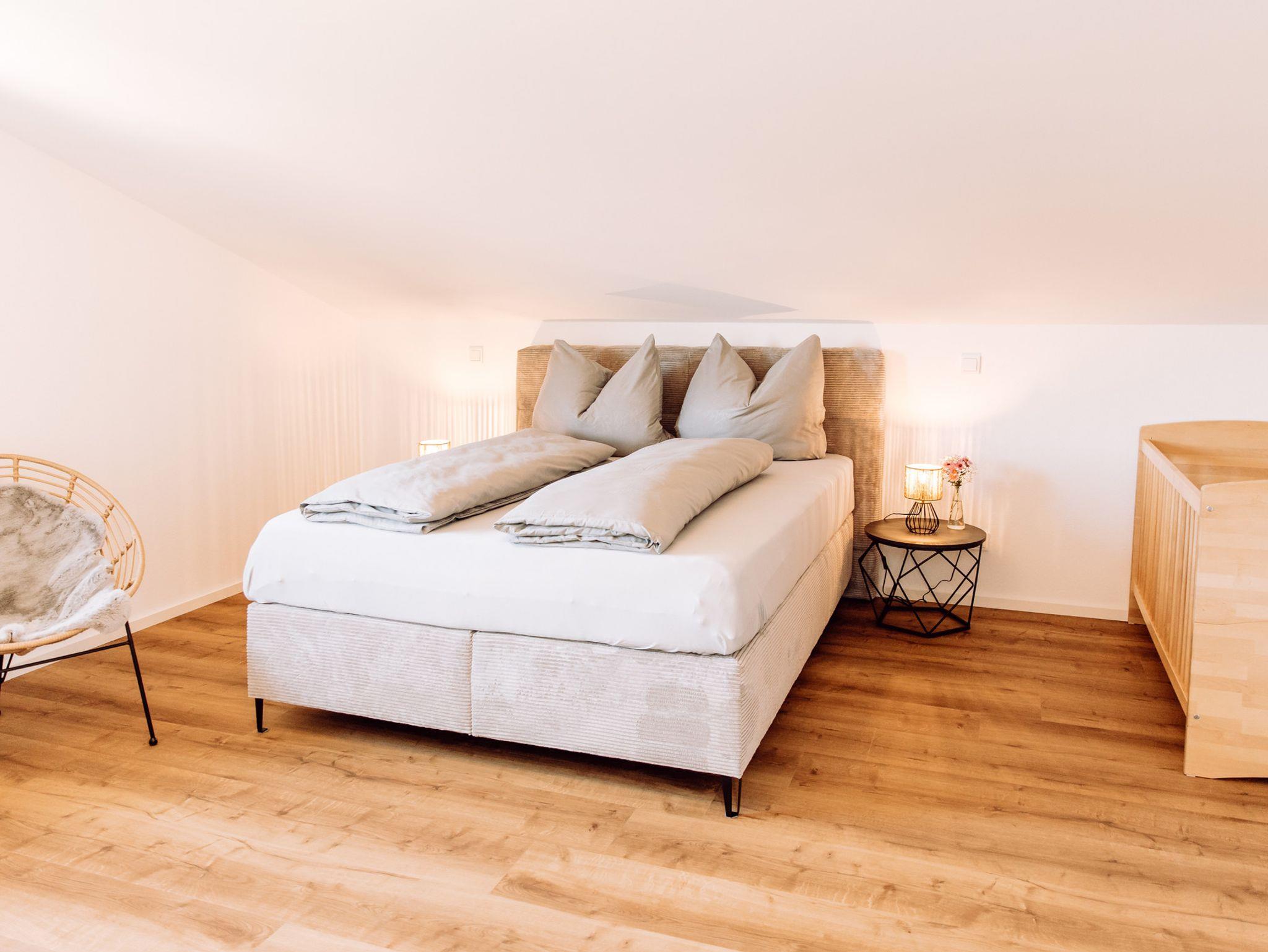 Die Wohnung verfügt über zwei separate Schlafzimmer. Das Hauptschlafzimmer ist mit einem komfortablen Boxspringbett 160x200m und einem Babybett ausgestattet. Das zweite Schlafzimmer ist als Jugendzimmer eingerichtet, Bett 120x200m und einer Ausziehcouch.