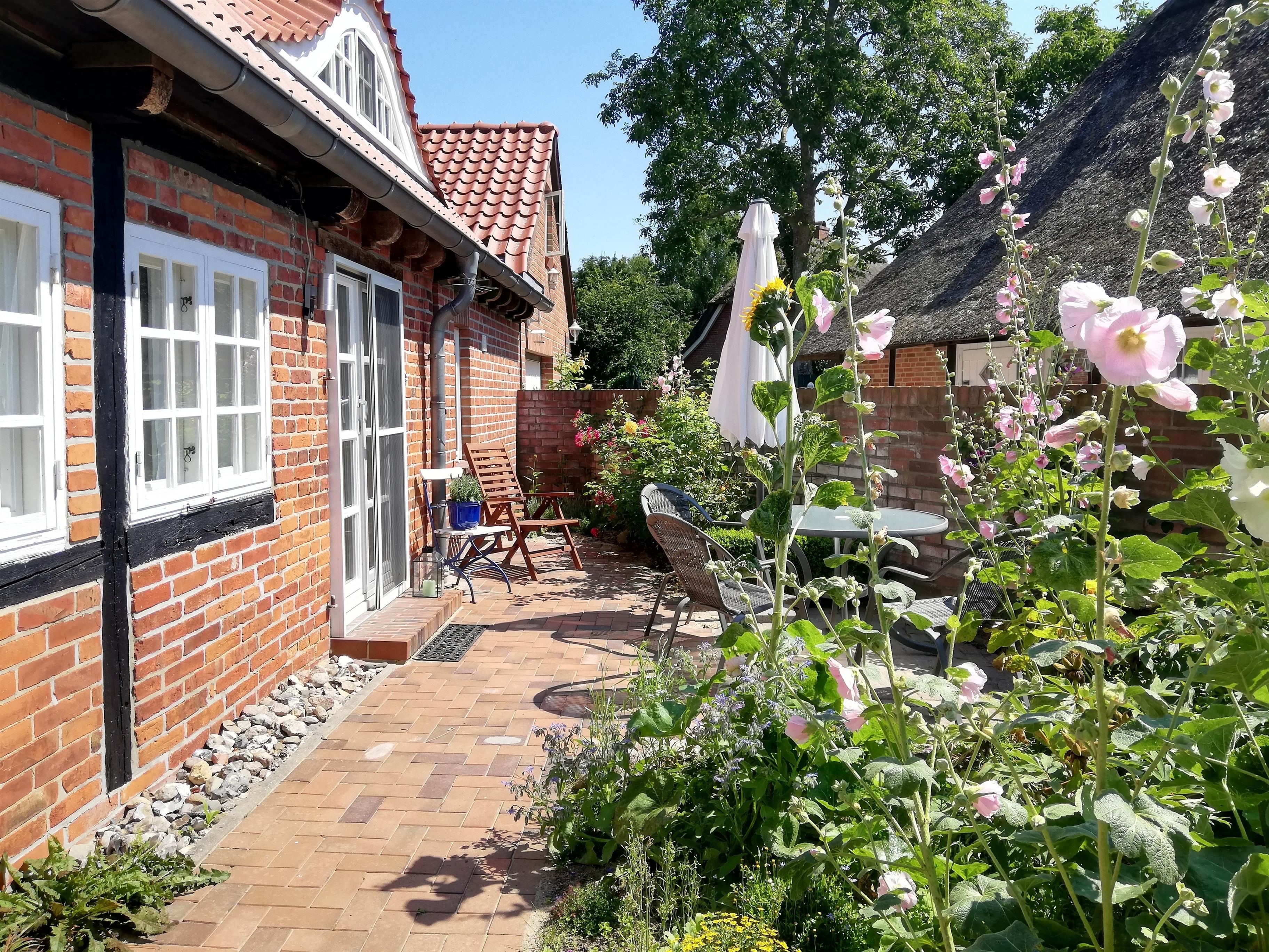 Die eigene Terrasse mit gemütlichem Sitzplatz liegt im Garten mit Wildblumen und wunderschönen Stockrosen. Kinder sind bei uns herzlich willkommen und können sich im Sandkasten und der Matschküche austoben.