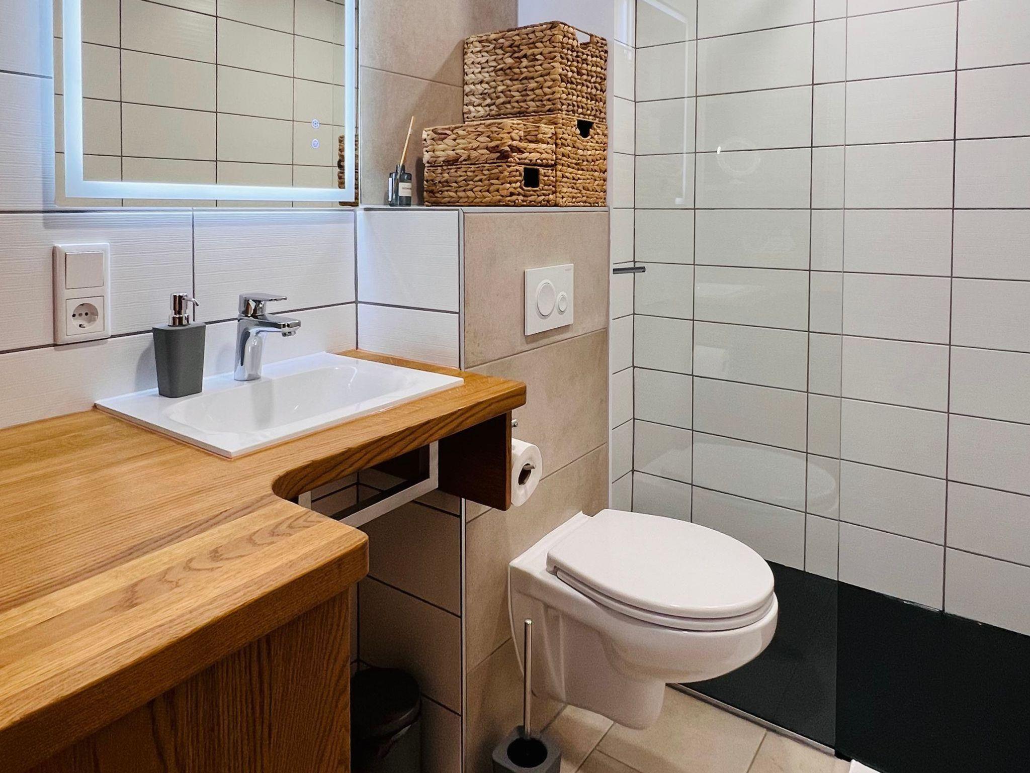 Das Badezimmer ist ausgestattet mit ebenerdiger Dusche, WC, Handtuchtrockner, Föhn, Kosmetikspiegel und Waschtrockner. Hand- und Badetücher liegen für Sie bereit.