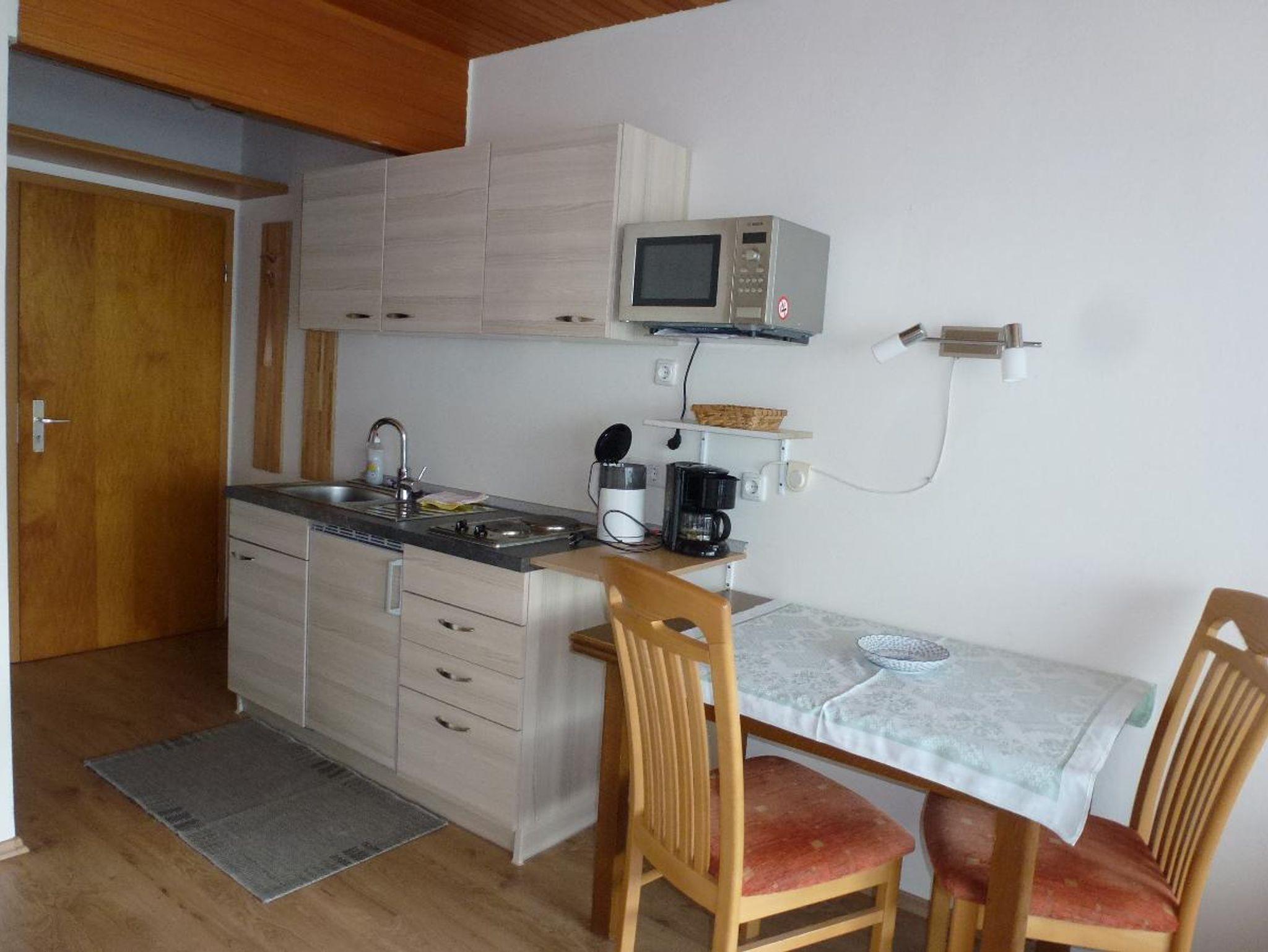 Die Küchenzeile ist ausgestattet mit einen Zweiplattenherd,Mikrowelle,