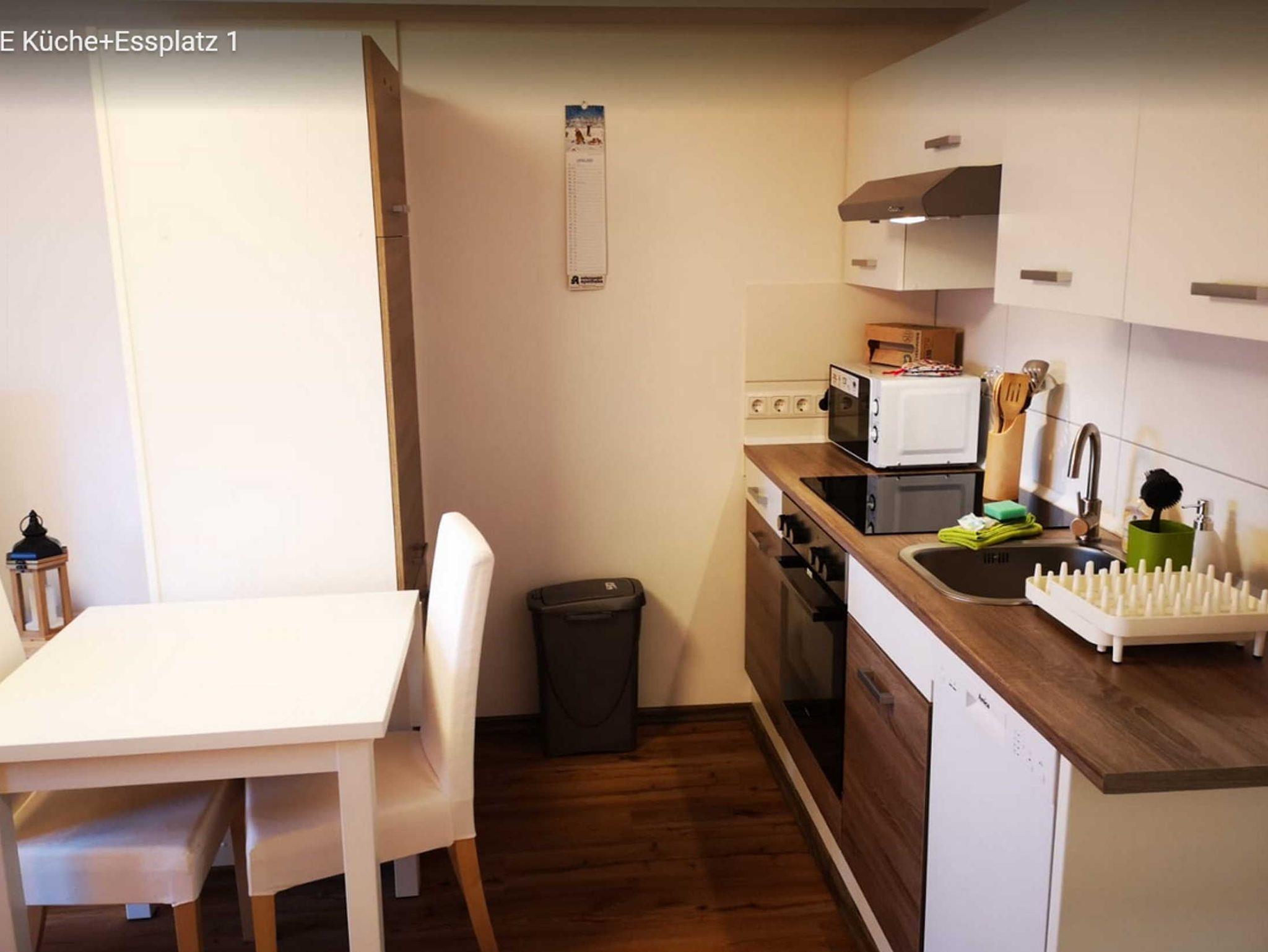 Die Küche enthält an Geräten eine Kühl-Gefrierkombination, einen Geschirrspüler, einen Glaskochfeldherd und Backofen, einen Mikrowellenherd, eine Filterkaffeemaschine, einen Toaster, einen Wasserkocher und einen Eierkocher. Geschirr, Gläser, Besteck, Schüsseln, Töpfe und Pfannen sind ebenfalls vorhanden - sowie weitere kleine Küchenhelfer.