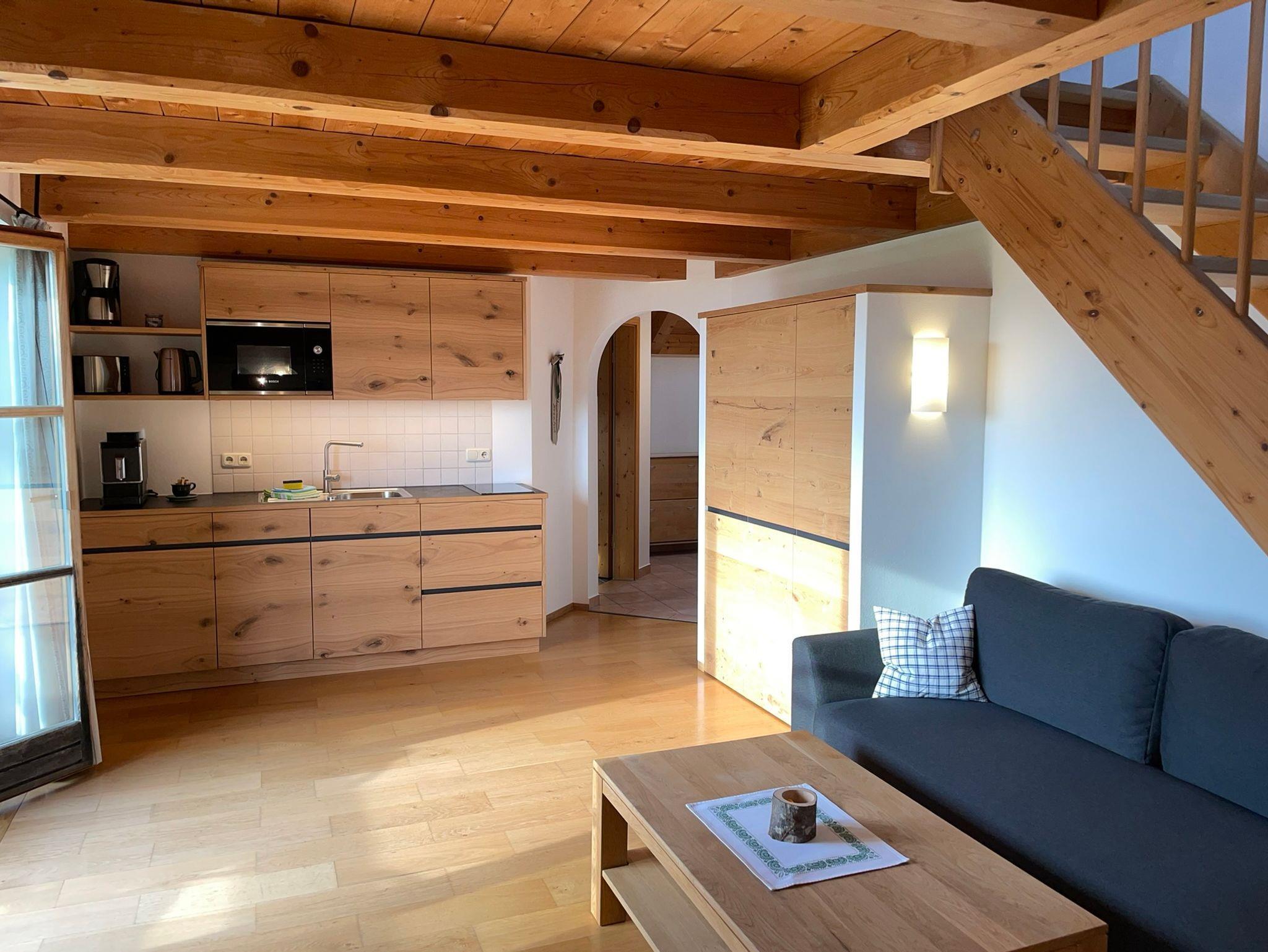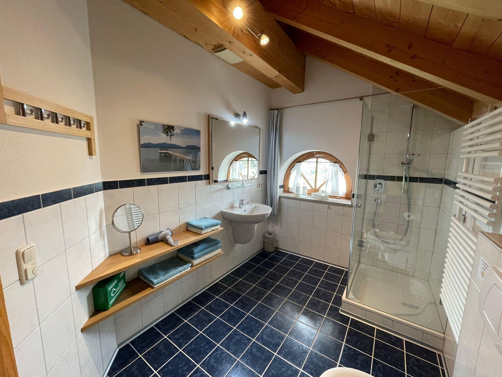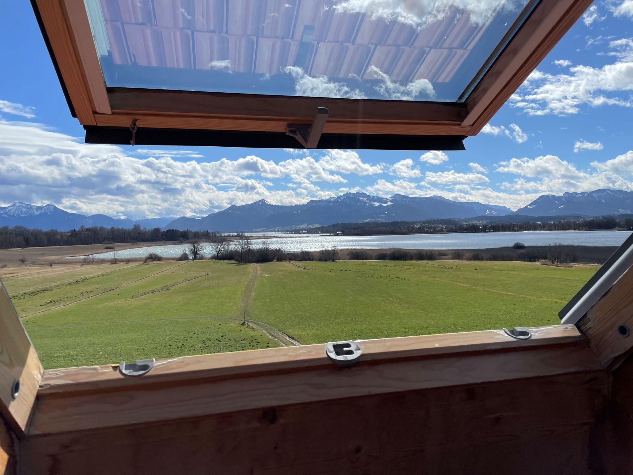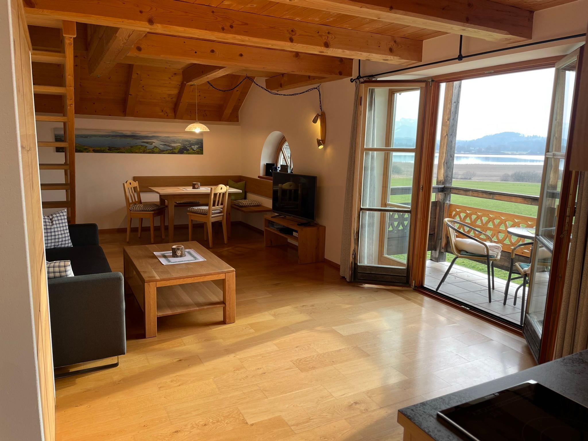 Die etwa 50 qm große Ferienwohnung ist durch eine Schlafgalerie räumlich getrennt und befindet sich im 2. Stock des SeeCafe Toni, ein einzelstehendes Landhaus am Nordufer des Chiemsees mit Blick über die Schafwaschener Bucht und die Chiemgauer Alpenkette.