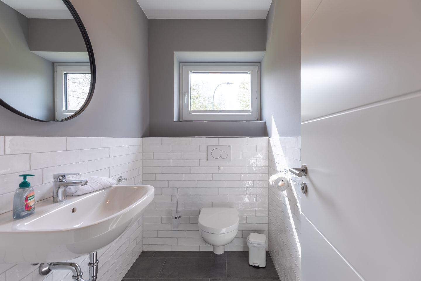 Das große, moderne Duschbad verfügt über eine bodengleiche Dusche.
