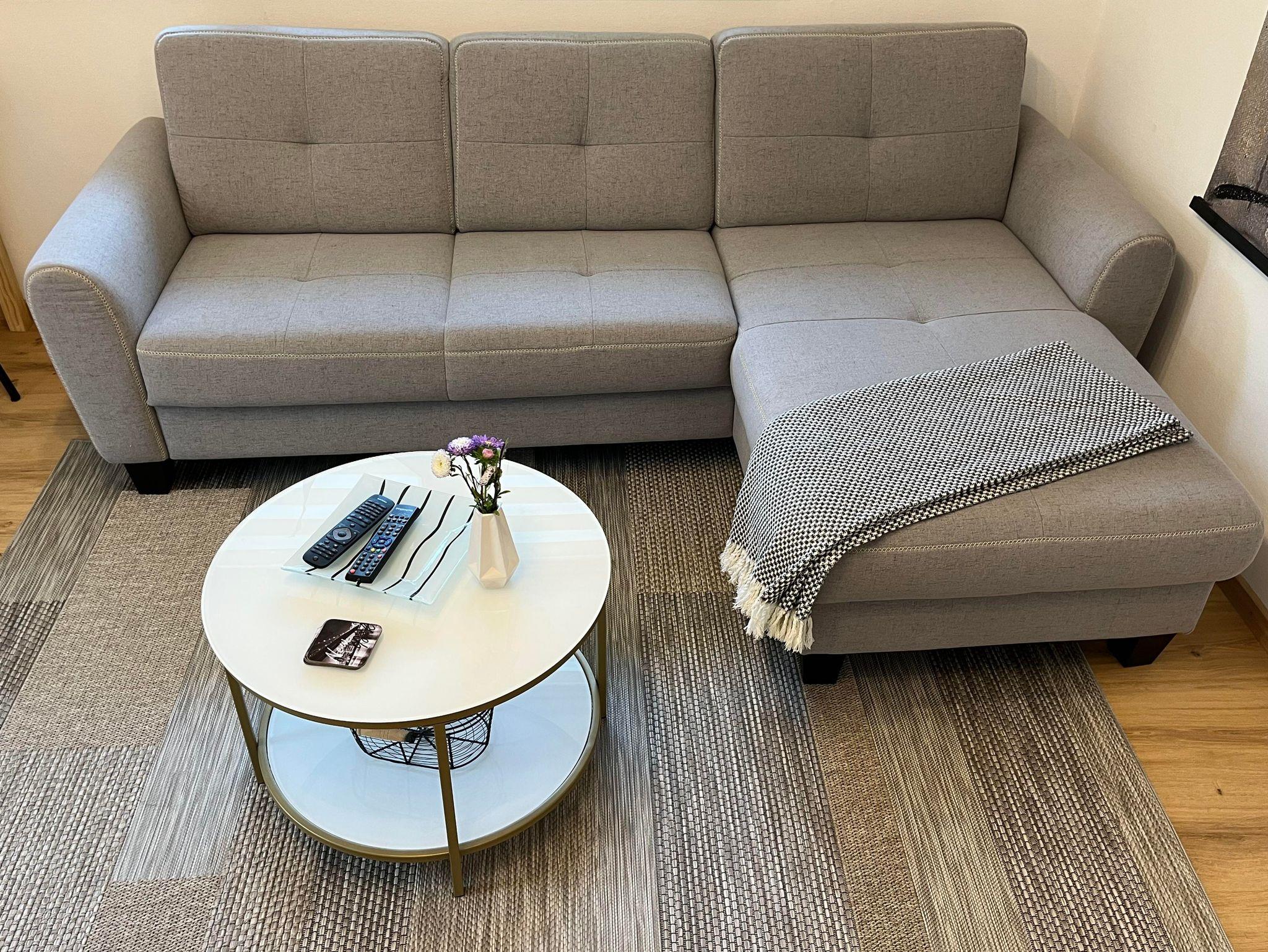 Wir bieten Ihnen ein Schlafzimmer mit einem großen Standard Doppelbett (1,80x2,00 m). Es ist möglich, ein kleines Kinderbett in diesem Raum zuzustellen. Außerdem gibt es für eine weitere Person eine ausklappbare, hochwertige Schlafcouch im Wohnzimmer.