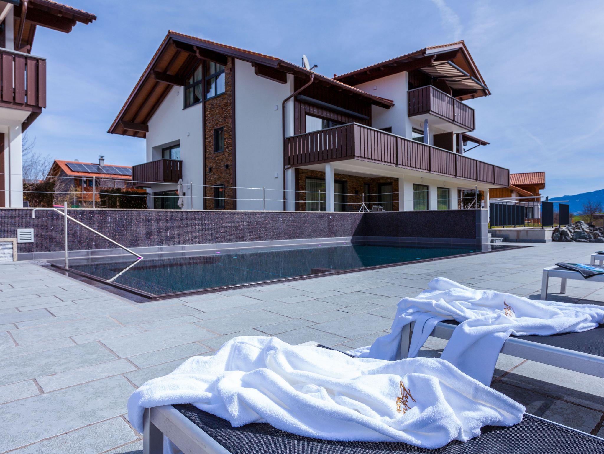 In modern alpenstyle eingerichteten Appartements in 4 Kategorien logieren Sie vor unberührter Natur direkt am Kurpark von Roßhaupten. Der Wellnessbereich und der beheizte Außenpool (Weihnachtsferien) laden Sie zu ''unvergesslichen Momenten'' ein.