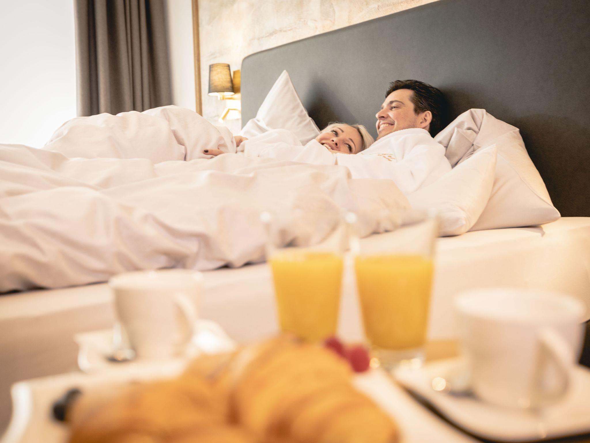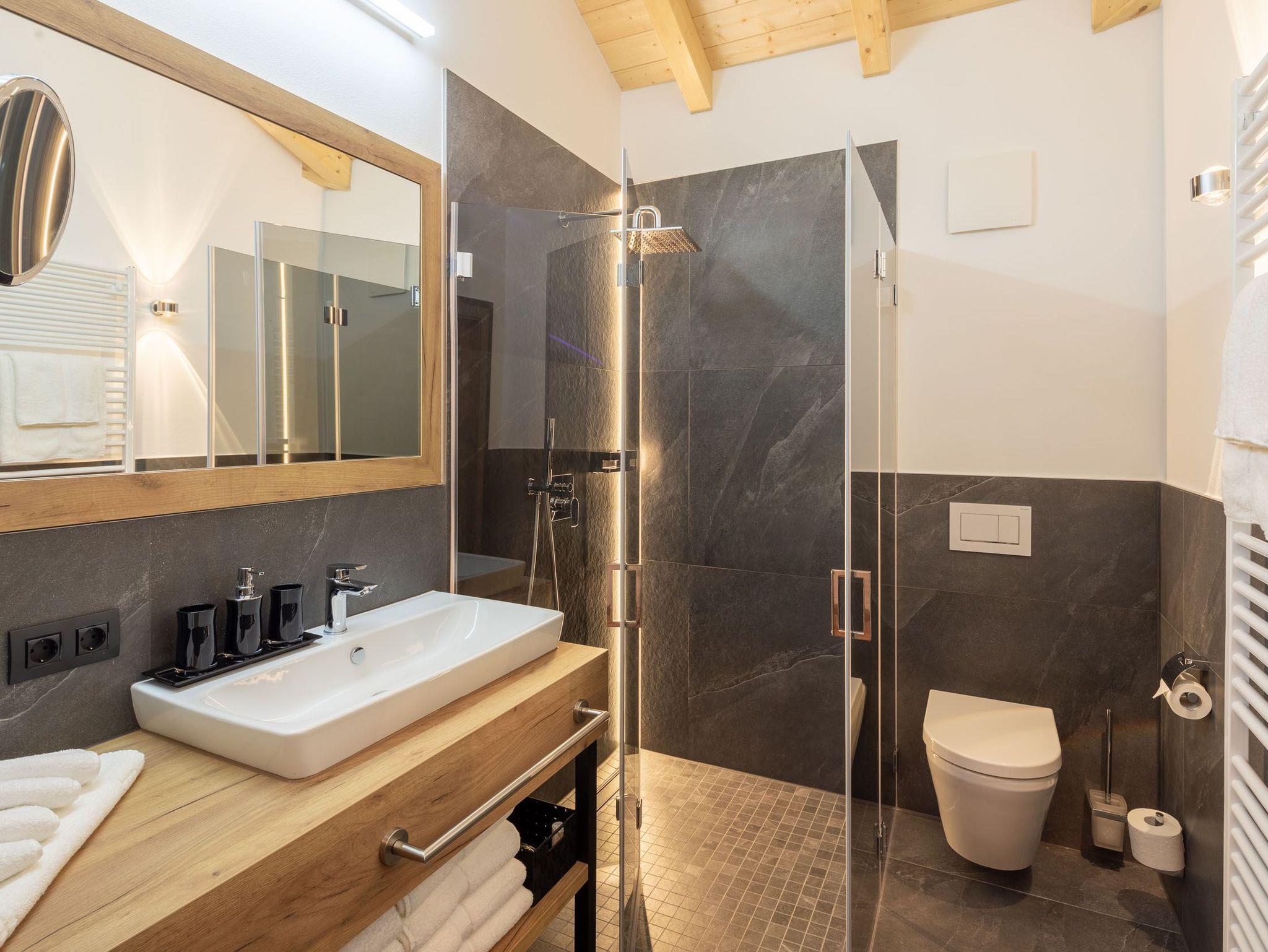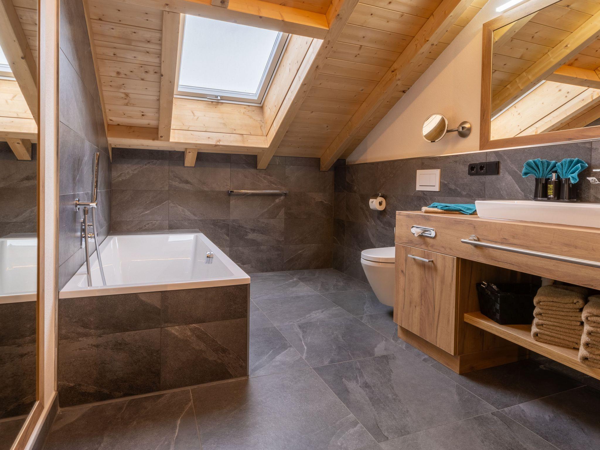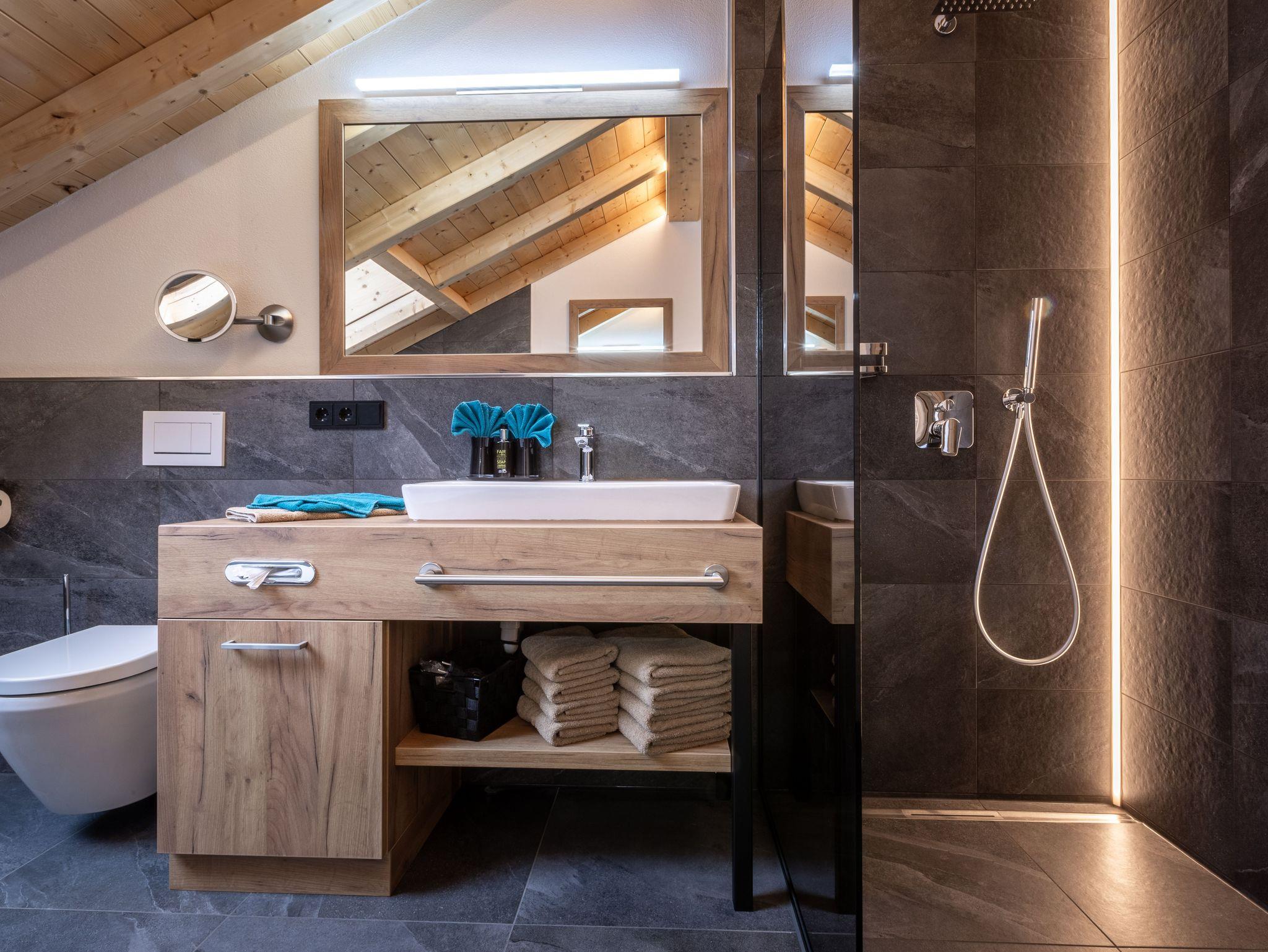 Das gemütliche Doppelzimmer verfügt über komfortable Boxspringbetten, die für erholsame Nächte sorgen. Das Badezimmer ist luxuriös ausgestattet und bietet sowohl eine Badewanne als auch eine Regendusche sowie ein WC.