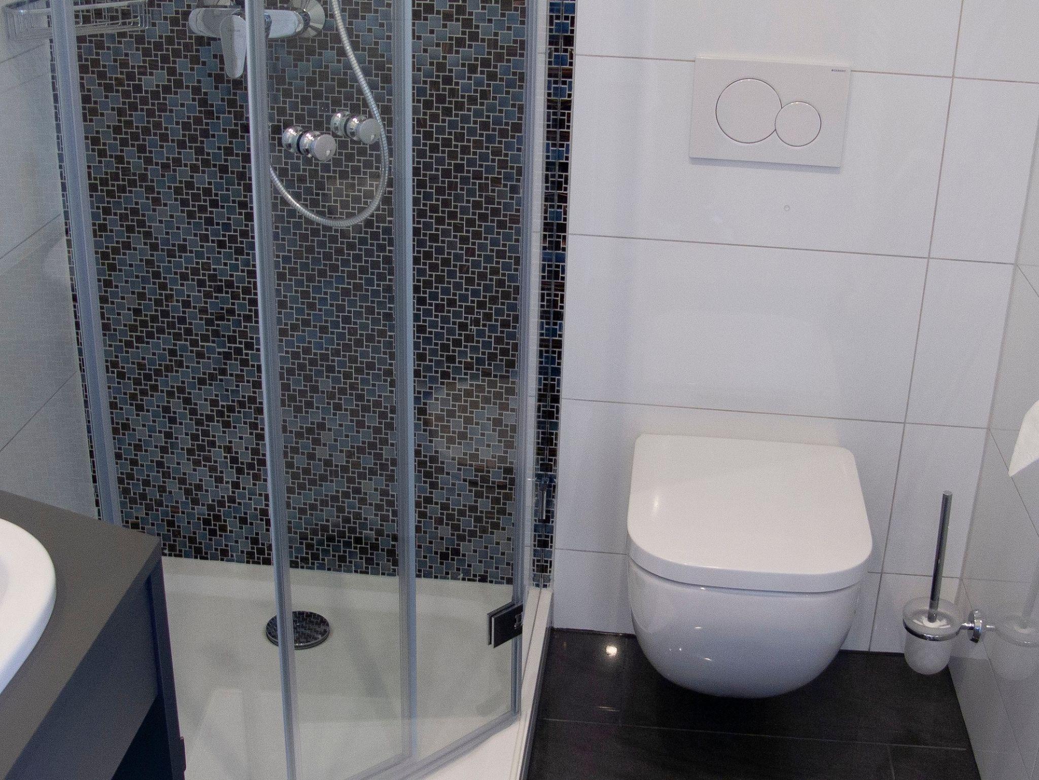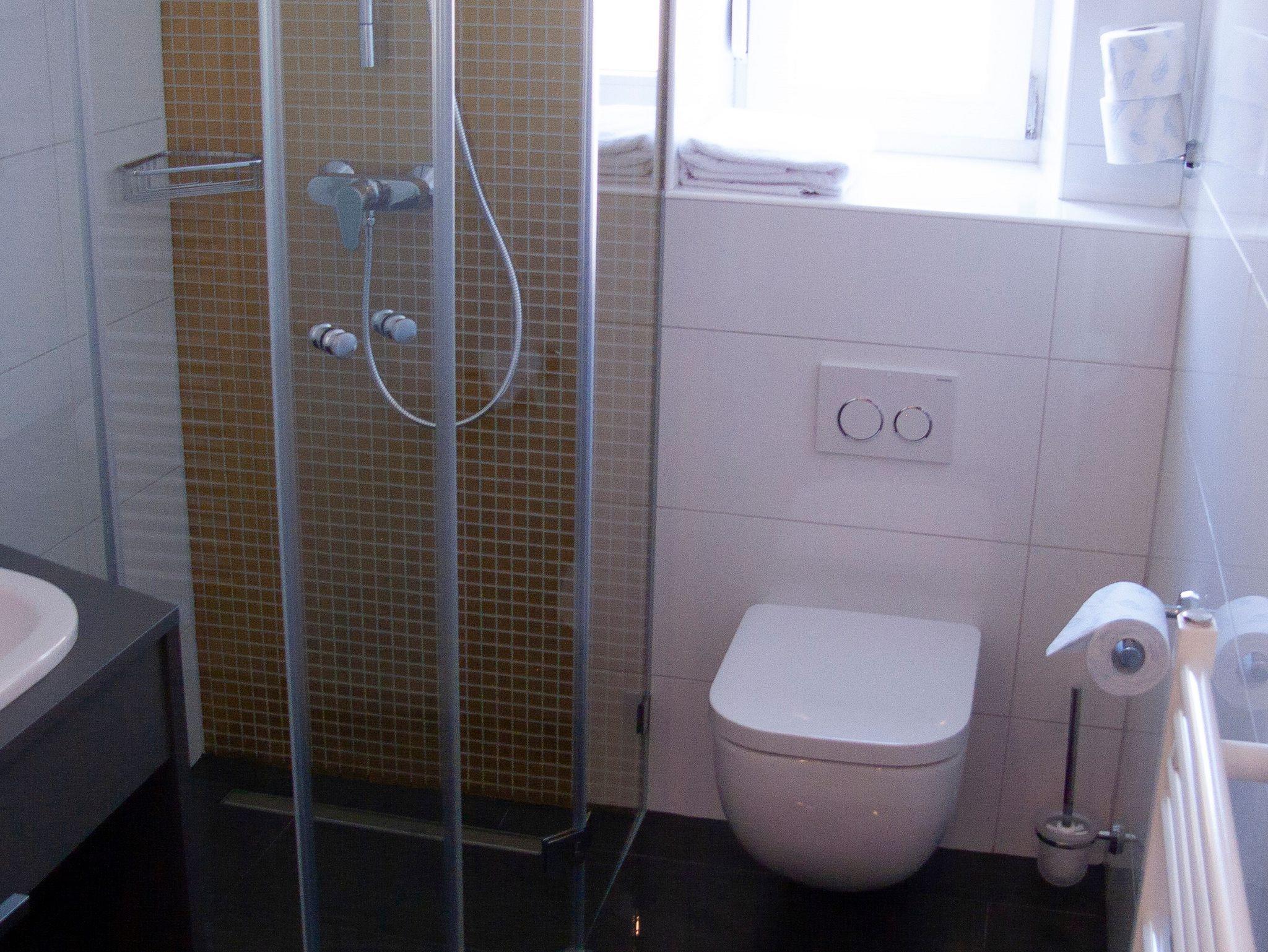 Im modernen Bad ist eine Echtglas Dusche, Waschtisch und WC ( Handtücher, Schampoo, Föhn, WC Papier sind für uns selbstverständlich sowie Bettwäsche, TV und kostenfreies W-Lan.