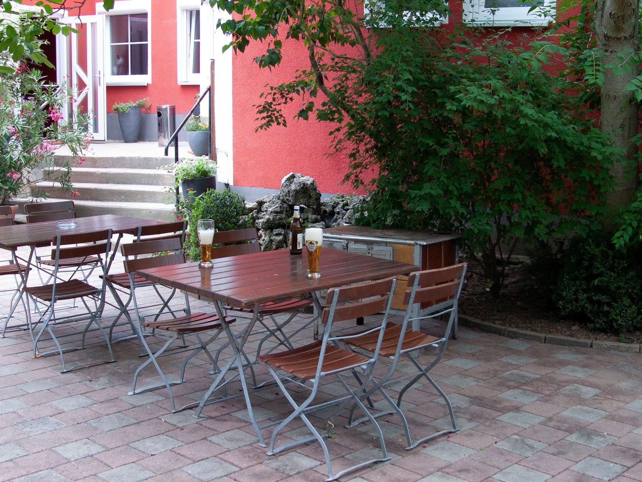 Unser ehemaliger Biergarten läd zum Sitzen unter dem Nußbaum ein, gerne mit einem regionalem Pyraser Bier aus unserem Getränkeautomat.