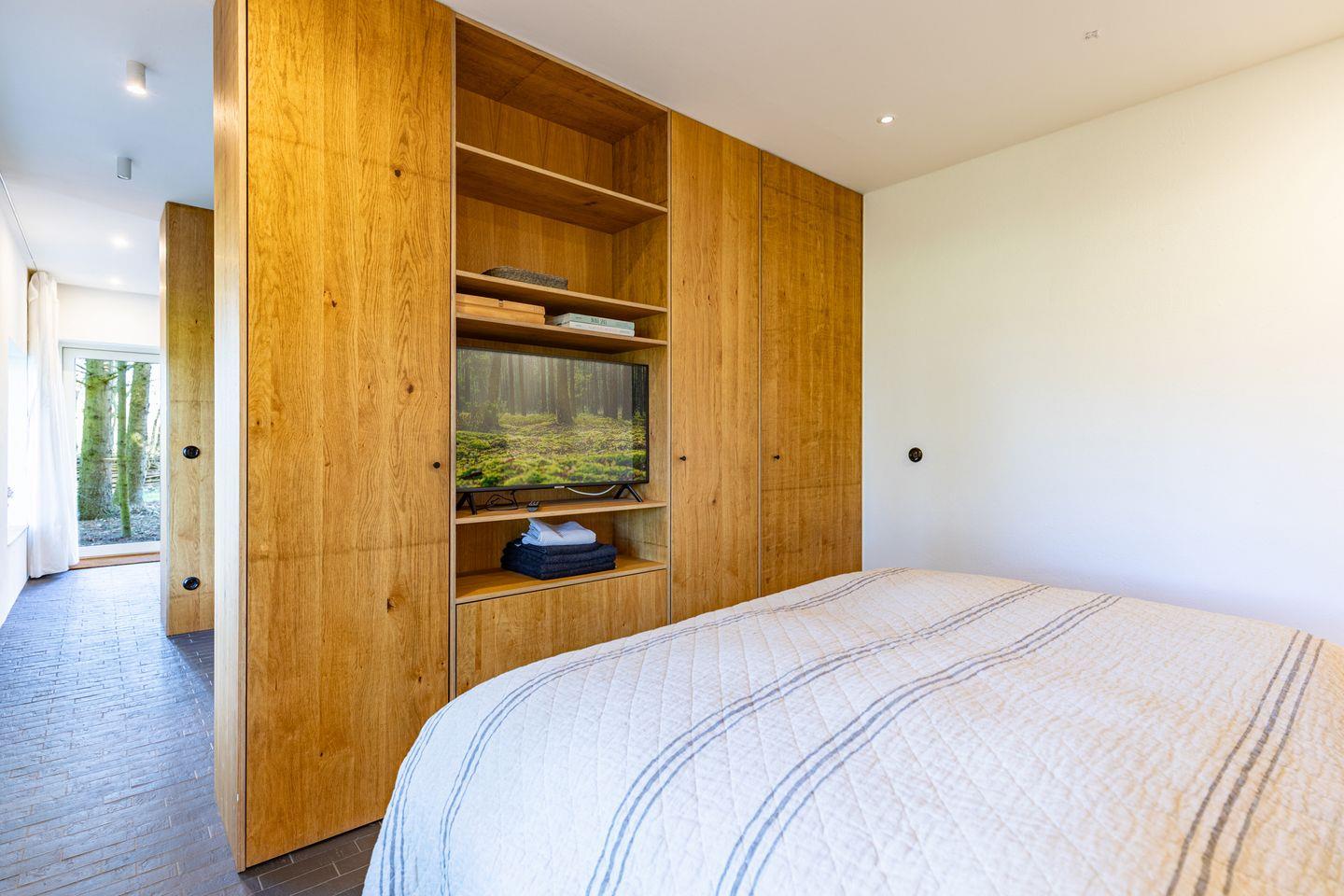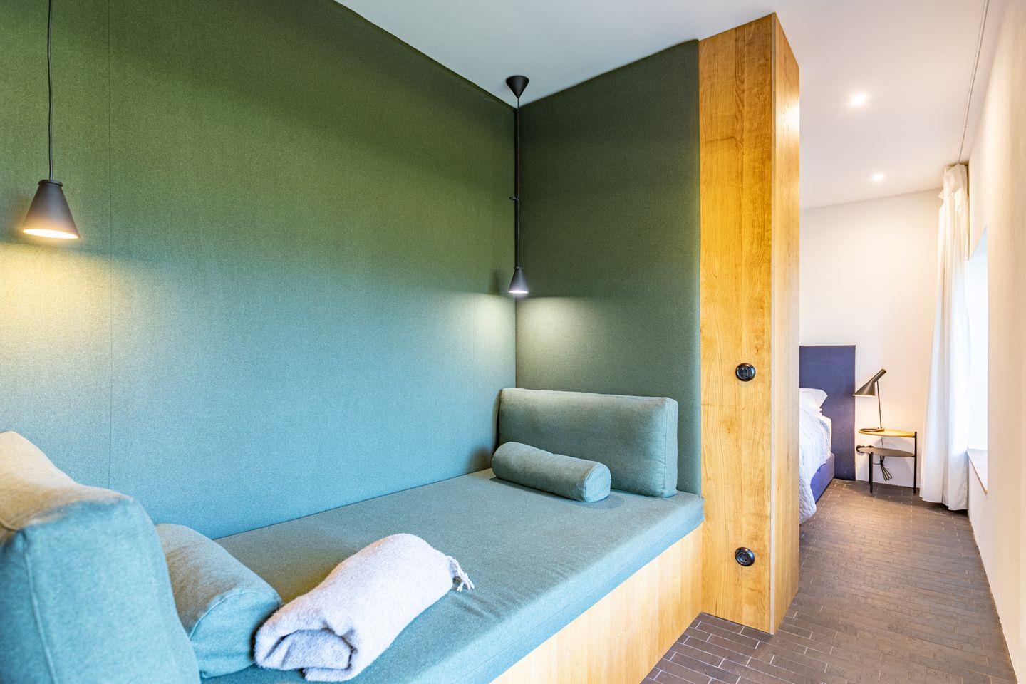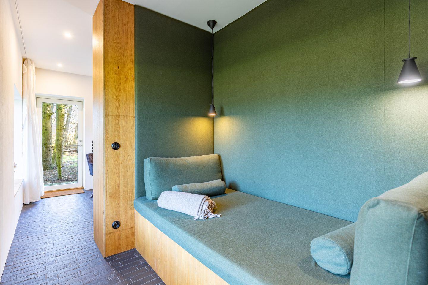 Der Wohnbereich überzeugt mit einer gemütlichen Sofanische, die zum Lesen und Entspannen einlädt. Große Panoramafenster sorgen in allen Räumen für viel Licht und eröffnen den Blick in den Naturgarten. Ein Boxspringbett (1,80 x 200), TV sowie Stauraumlösungen sind harmonisch in das Raumkonzept integriert.