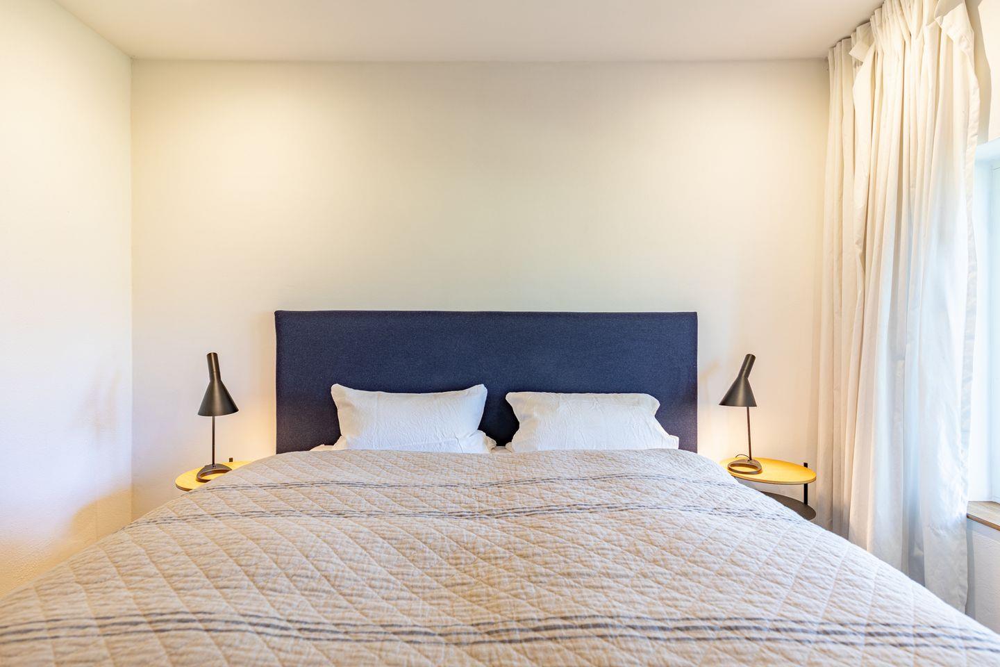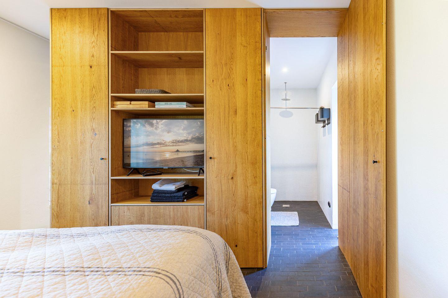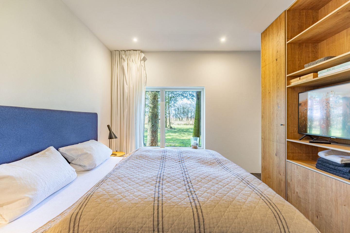 Der Wohnbereich überzeugt mit einer gemütlichen Sofanische, die zum Lesen und Entspannen einlädt. Große Panoramafenster sorgen in allen Räumen für viel Licht und eröffnen den Blick in den Naturgarten. Ein Boxspringbett (1,80 x 200), TV sowie Stauraumlösungen sind harmonisch in das Raumkonzept integriert.