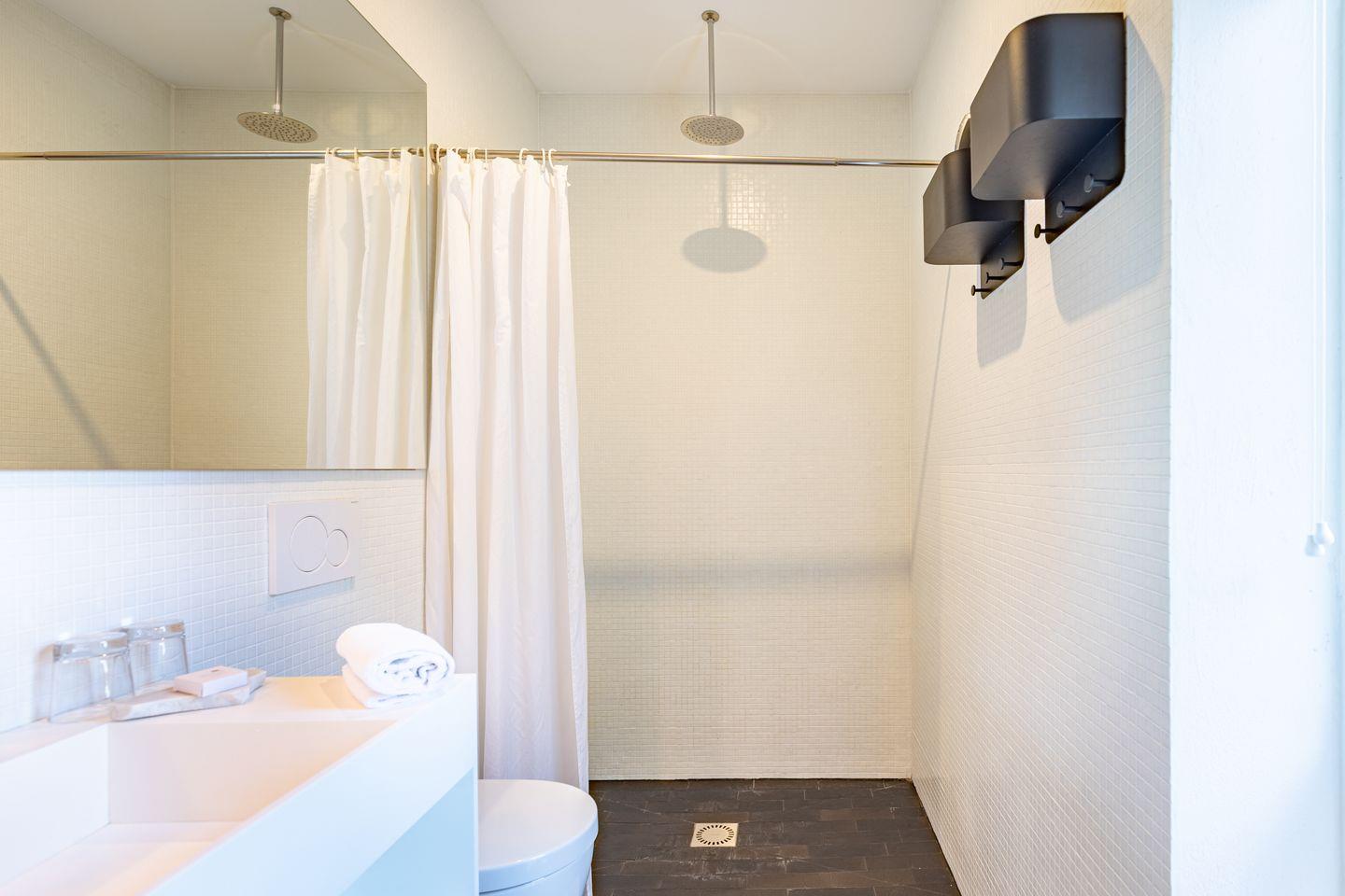 Das moderne Badezimmer ist hell gestaltet und mit einer bodengleichen Dusche, Waschbecken, WC, Spiegel und weiteren Annehmlichkeiten ausgestattet.