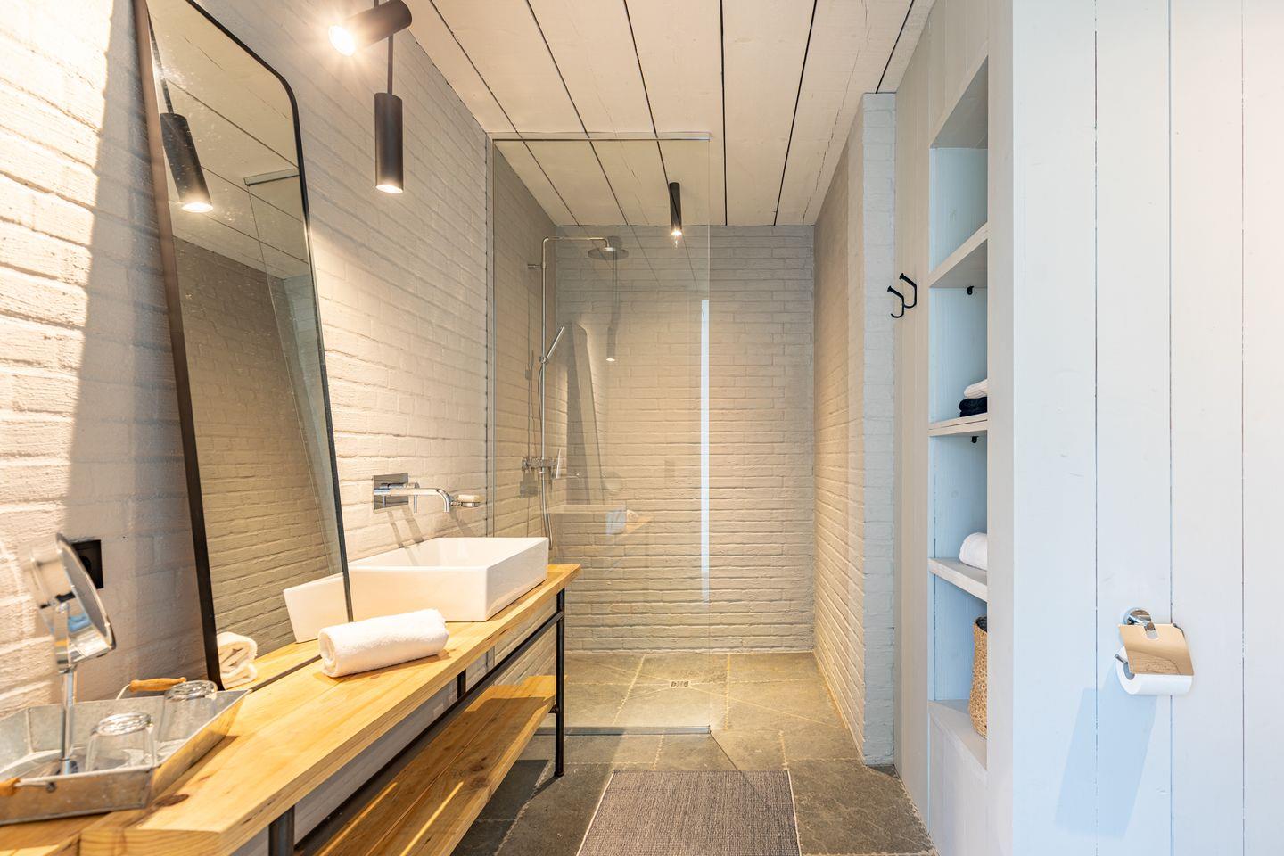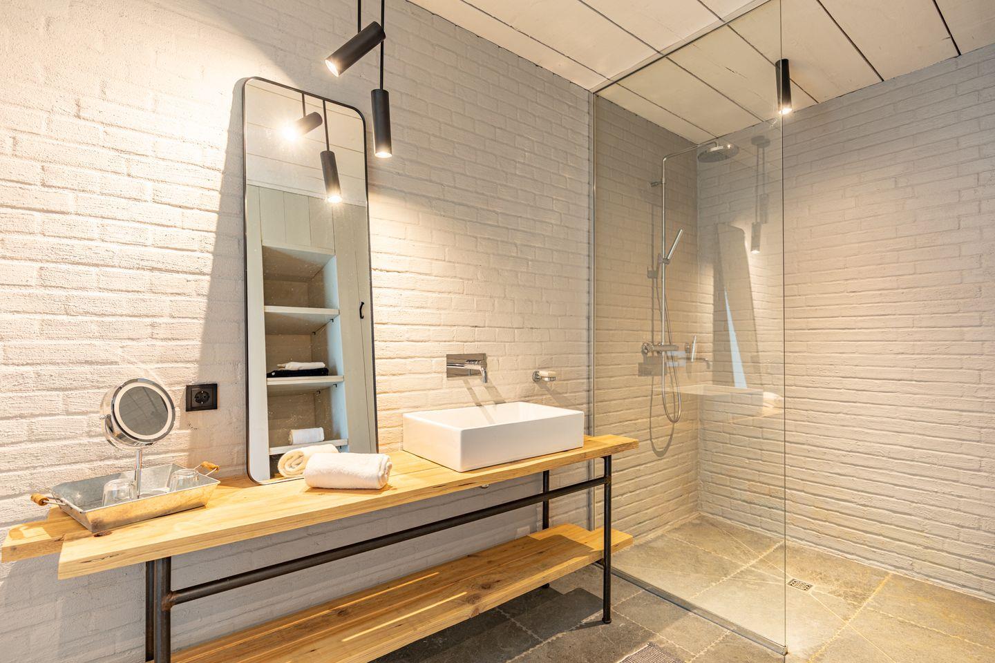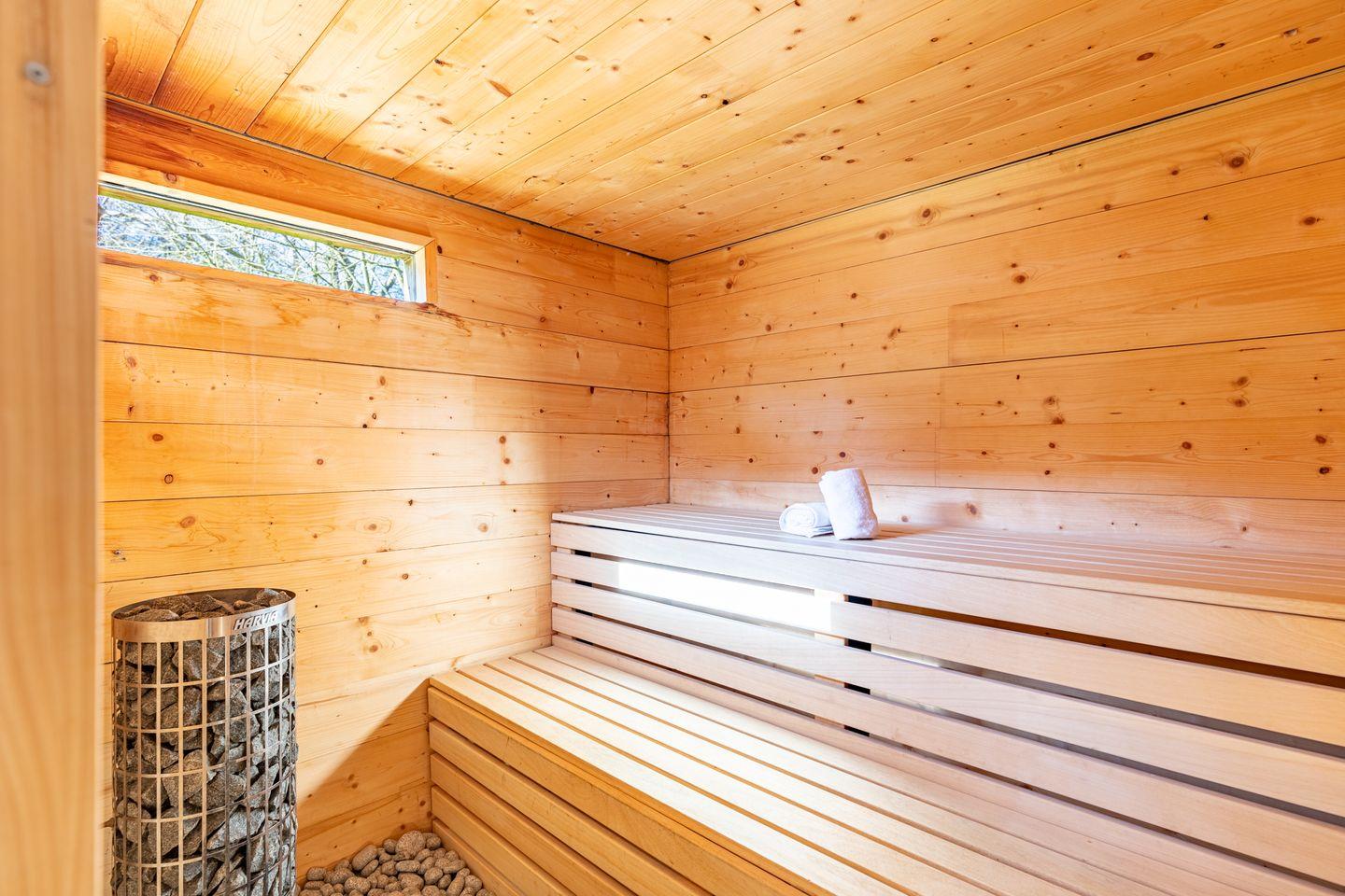 Die beiden Badezimmer bieten modernen Komfort mit bodengleichen Duschen, Badewanne, WC, Waschbecken, Fenster, Spiegel, Kosmetikspiegel und Haartrockner. Eine Sauna – teilweise als Außensauna im Gartenbereich integriert – sorgt für entspannte Wellnessmomente.