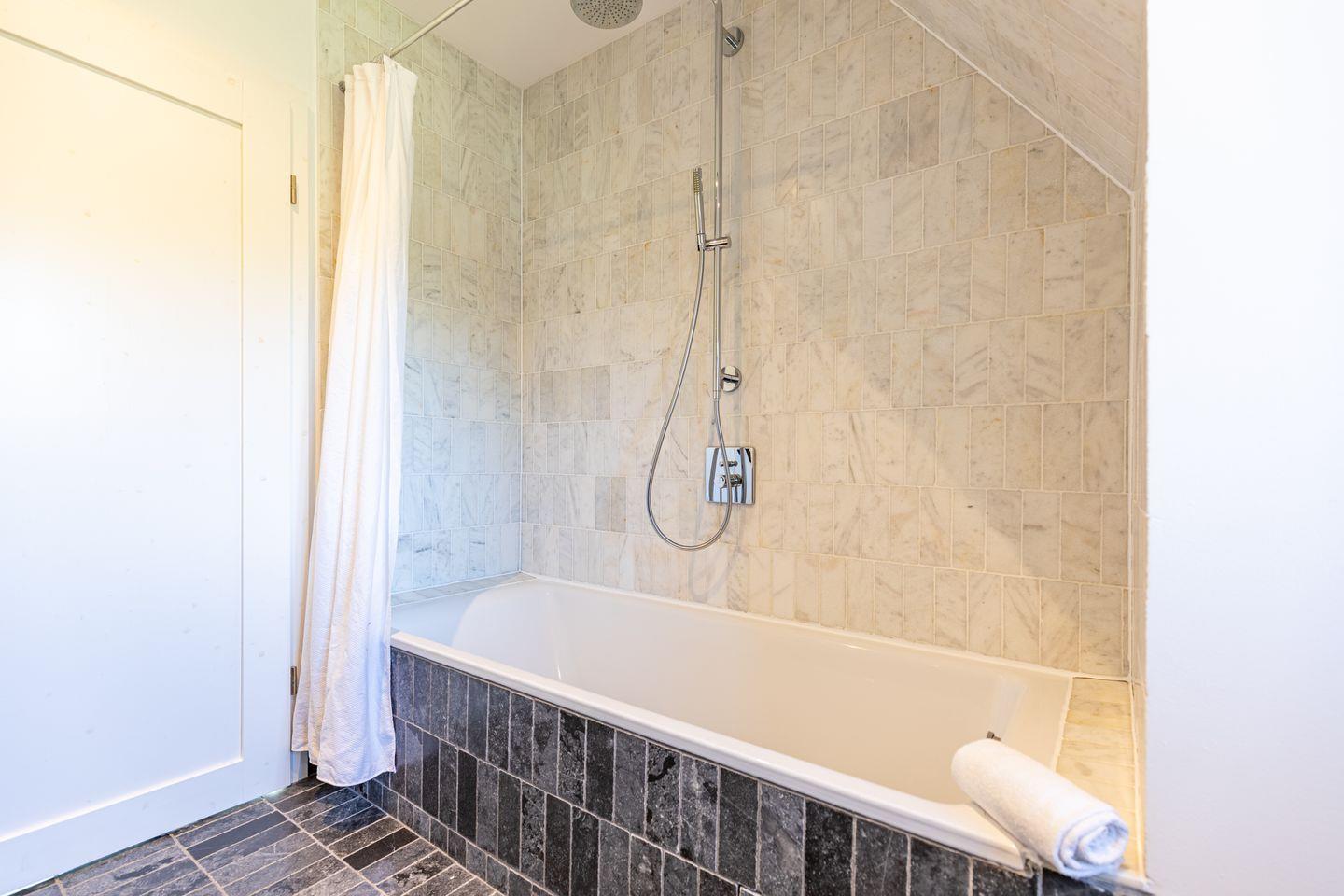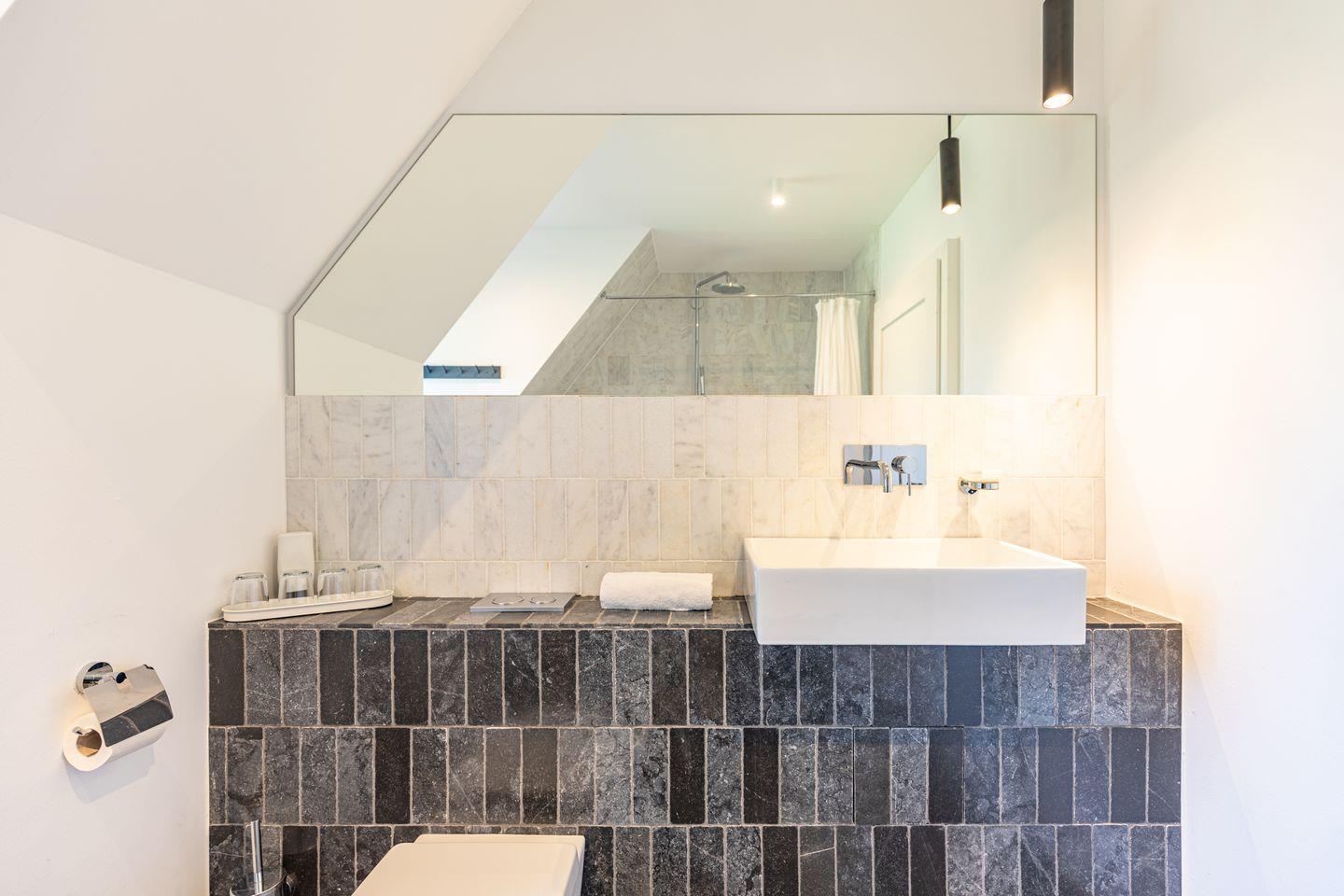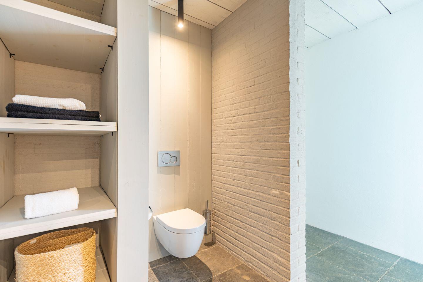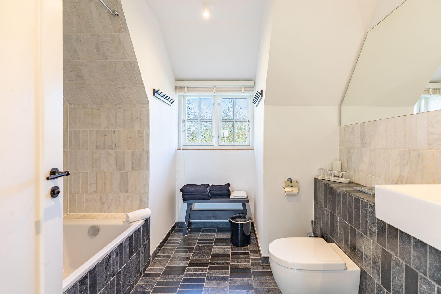 Die beiden Badezimmer bieten modernen Komfort mit bodengleichen Duschen, Badewanne, WC, Waschbecken, Fenster, Spiegel, Kosmetikspiegel und Haartrockner. Eine Sauna – teilweise als Außensauna im Gartenbereich integriert – sorgt für entspannte Wellnessmomente.