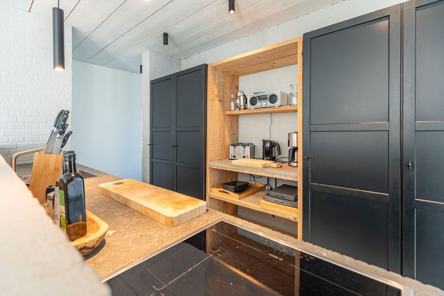 Die voll ausgestattete Küche verfügt über Induktionsherd, Backofen, Mikrowelle, Kühlschrank mit Gefrierfach und Spülmaschine sowie Kaffeemaschine, Espressomaschine und umfangreiche Küchenutensilien.