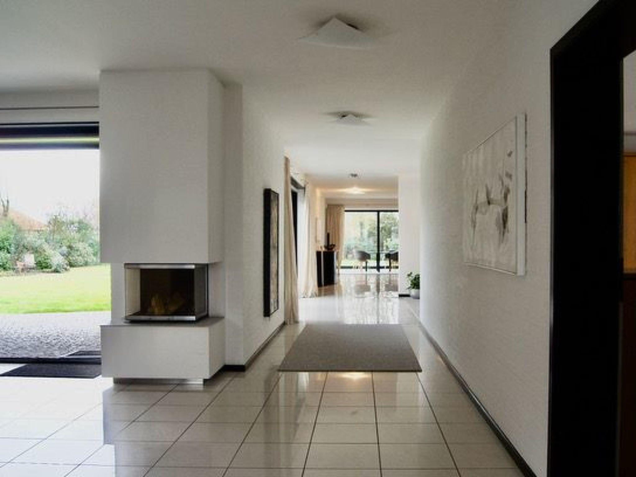 A hallway with guest WC and cloakroom leads to the open-plan kitchen/dining area, which has a special ambience thanks to a glass fireplace and floor-to-ceiling windows throughout the house.