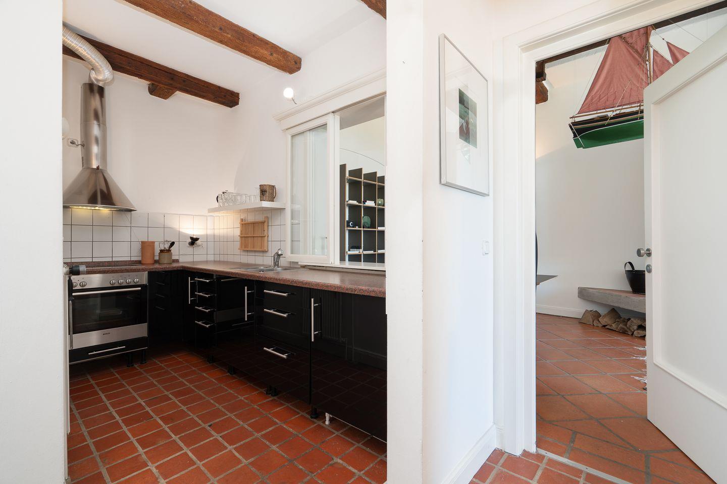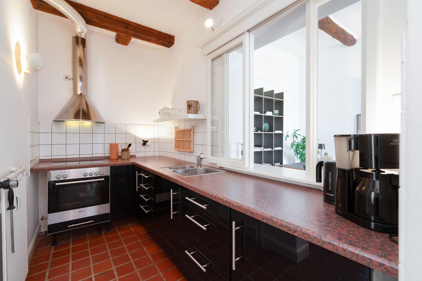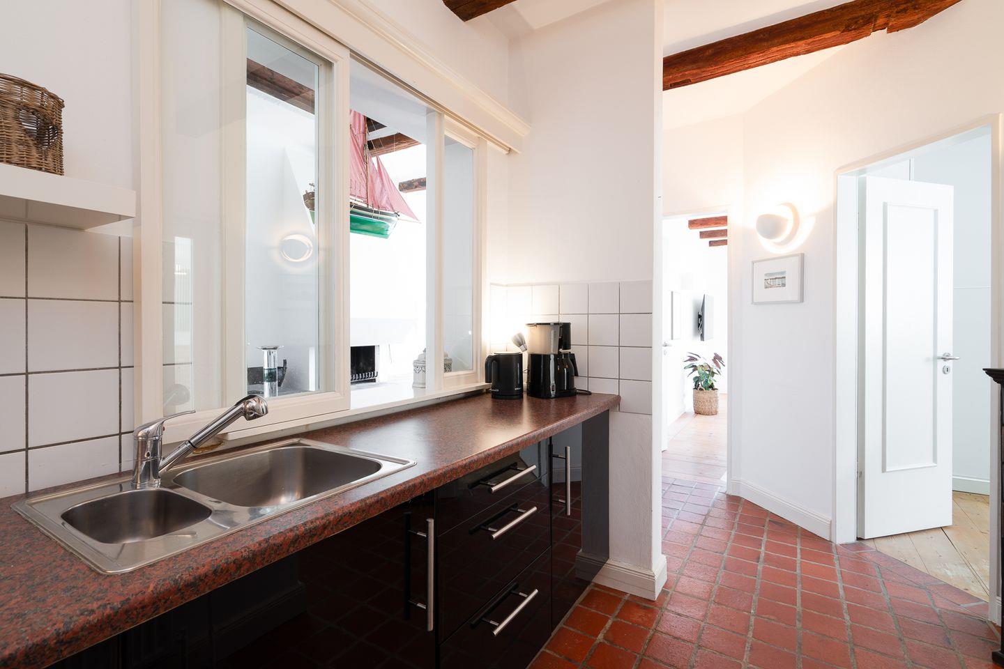 Die abgeschlossene Küche ist umfassend ausgestattet: Sie finden einen Ceranherd, Backofen, Kühlschrank mit integriertem Gefrierfach, Mikrowelle, Toaster, Wasserkocher und Kaffeemaschine sowie ausreichend Geschirr, Besteck und Küchenutensilien. Zum Kochen und Beisammensein ist die Küche ideal eingerichtet. Staubsauger, Abfalleimer und weitere nützliche Haushaltsgeräte stehen bereit.