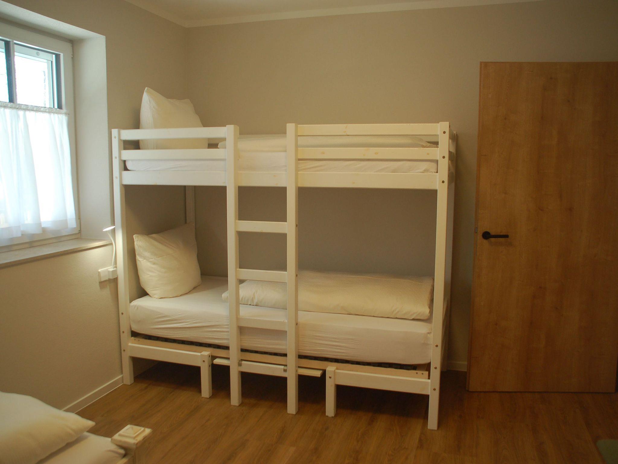 Der große Wohn-/Essbereich ist mit einer komplett ausgestatteten Küchenzeile, einem großen Esstisch und einer gemütlichen Couch bestückt. Das großzügige Badezimmer bietet eine mit dem Rollstuhl befahrbare Dusche sowie einen unterfahrbaren Waschtisch und ein WC. Direkt neben dem Badezimmer befindet sich eine weitere separate Toilette. Im Elternschlafzimmer erwartet unsere Gäste ein 180 cm breites Boxspringbett. Das Kinderschlafzimmer ist mit einem Etagenbett (2 x 200 x 90 cm) sowie einem weiteren Einzelbett (200 x 90 cm) ausgestattet.