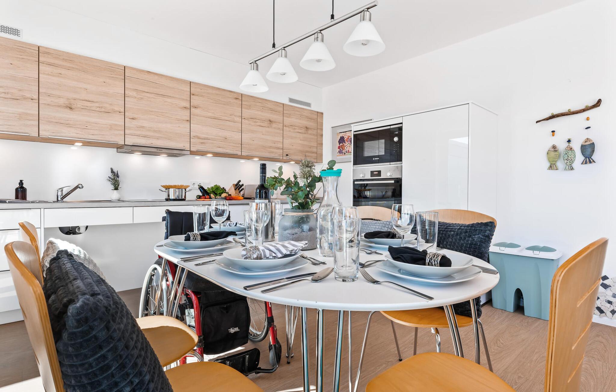 I det fullt utstyrte kjøkkenet er vasken og kokeplaten tilgjengelige for rullestolbrukere. Avtrekkshetten kan nås fra sittende stilling, og stekeovnen har teleskopskinner og er satt høyere. Spiseplassen har plass til opptil 6 personer med et spisebord som er tilgjengelig for rullestolbrukere.