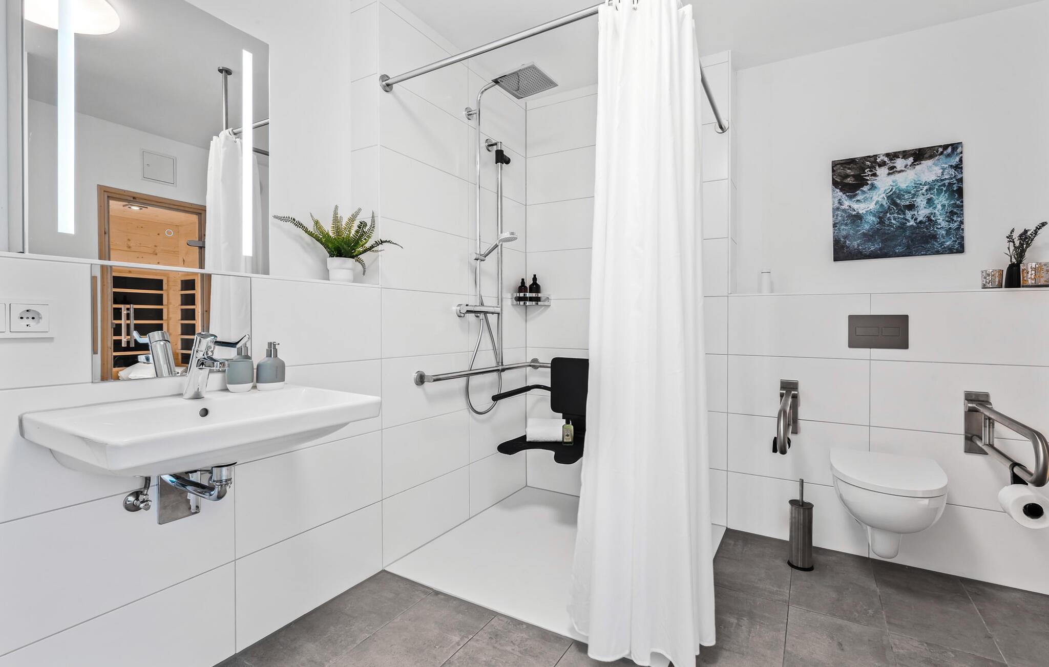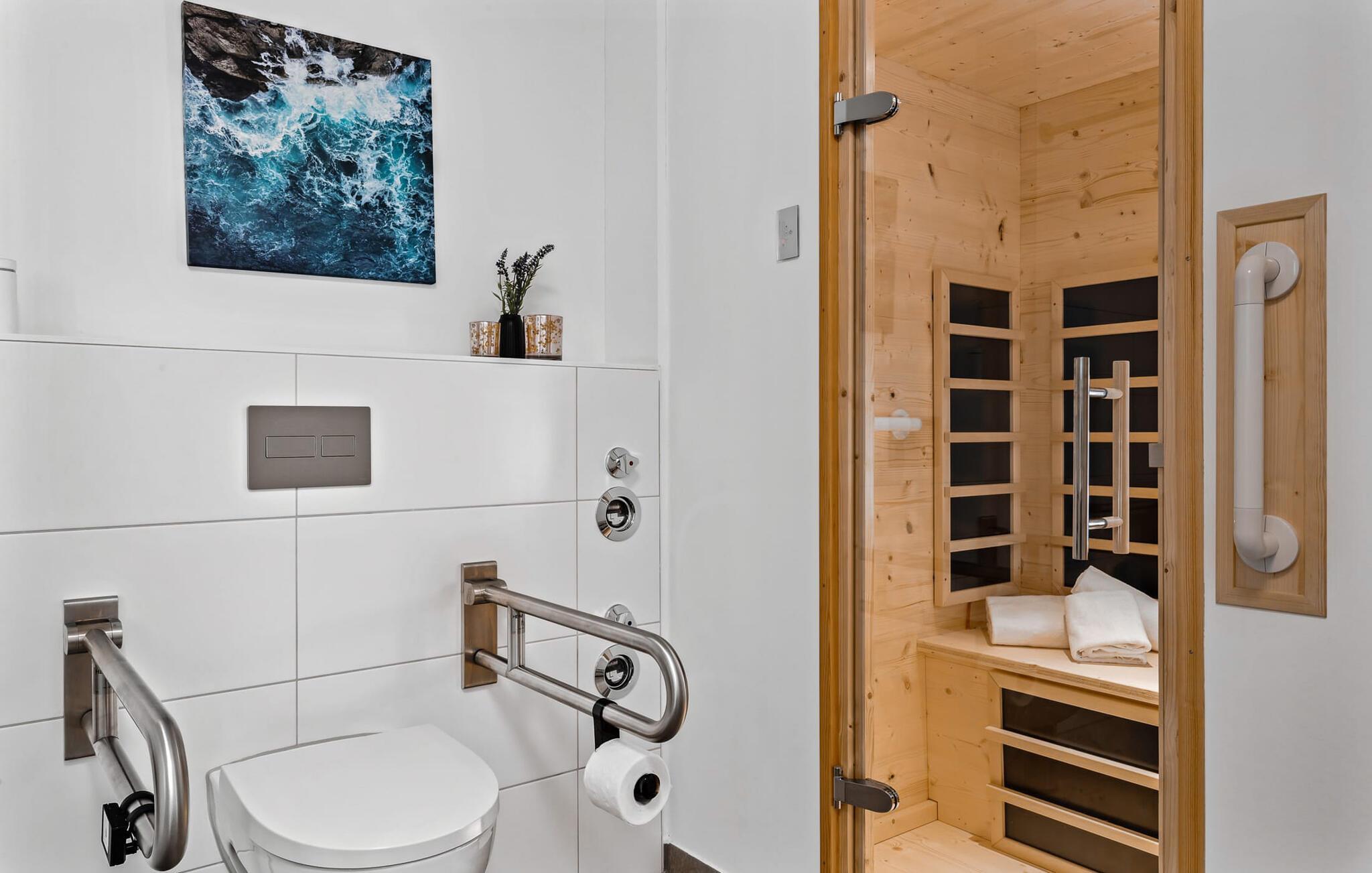 Dusjrommet har en dusj med nivådusj med hjørnegelender, dusjstol og ekstra håndtak å holde seg fast i. Toalettet er høyere plassert, kan nås fra begge sider og har oppfellbare støttehåndtak. Servanten og speilskapet er også tilpasset rullestolbrukere. Den infrarøde kabinen gir deg dine helt egne velværeøyeblikk og har støttehåndtak både på innsiden og utsiden.