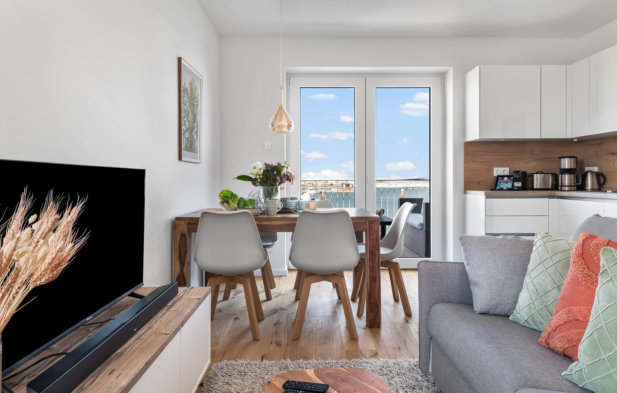 Den åpne stue-/spisestuen med integrert kjøkken av høy kvalitet får hjertet til enhver Østersjø-elsker til å banke raskere. Herfra har du en umiskjennelig utsikt over vannet, og takket være den sørvestvendte, omsluttende terrassen, som kan nås fra alle rom, har du sol hele dagen lang.
