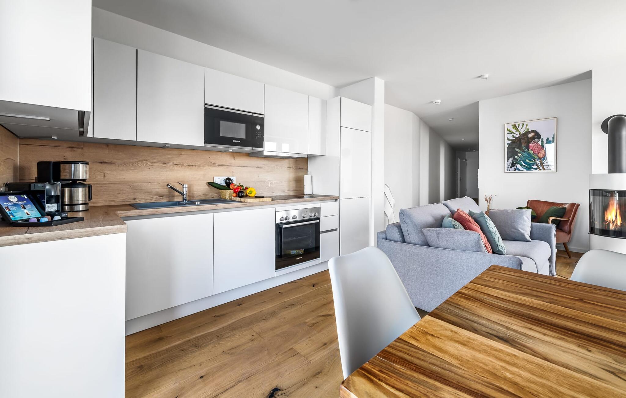 Det er også et annet høydepunkt i oppholdsrommet: Når solen går ned og temperaturen synker, sørger vedovnen for at det holder seg varmt og fremfor alt koselig. Velg mellom knitrende peis eller underholdning fra Smart-TV-en med mulighet for å bruke ulike strømmeleverandører. Innendørs underholdning er uansett sikret.