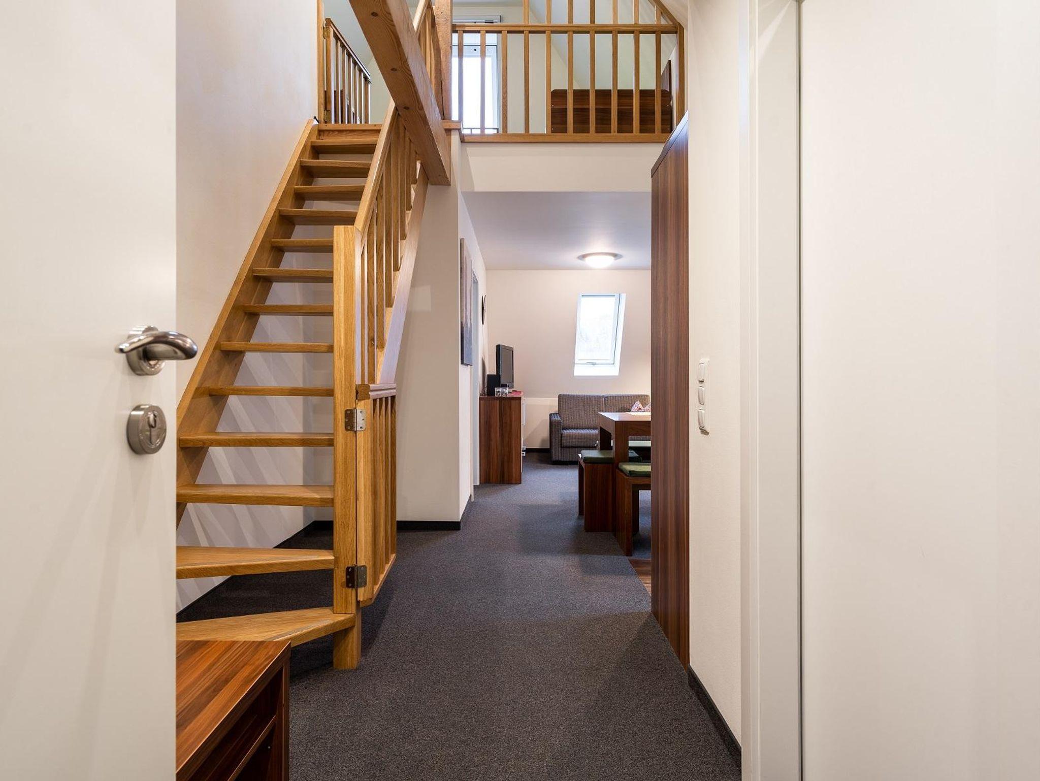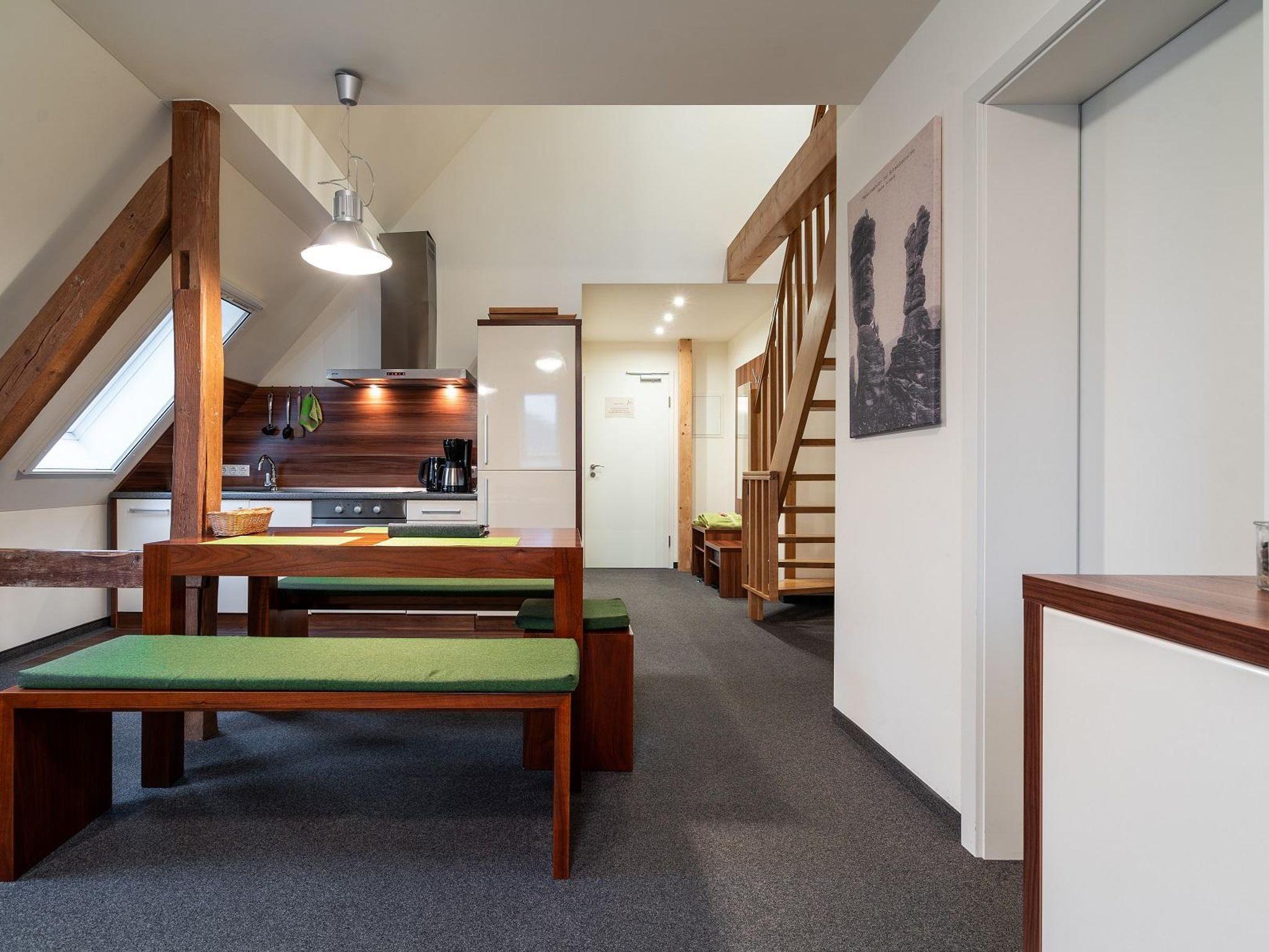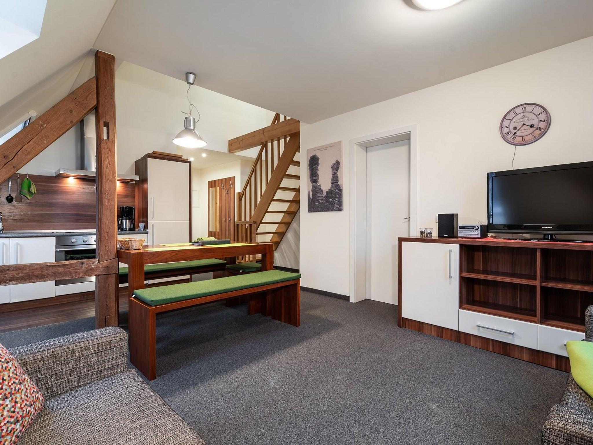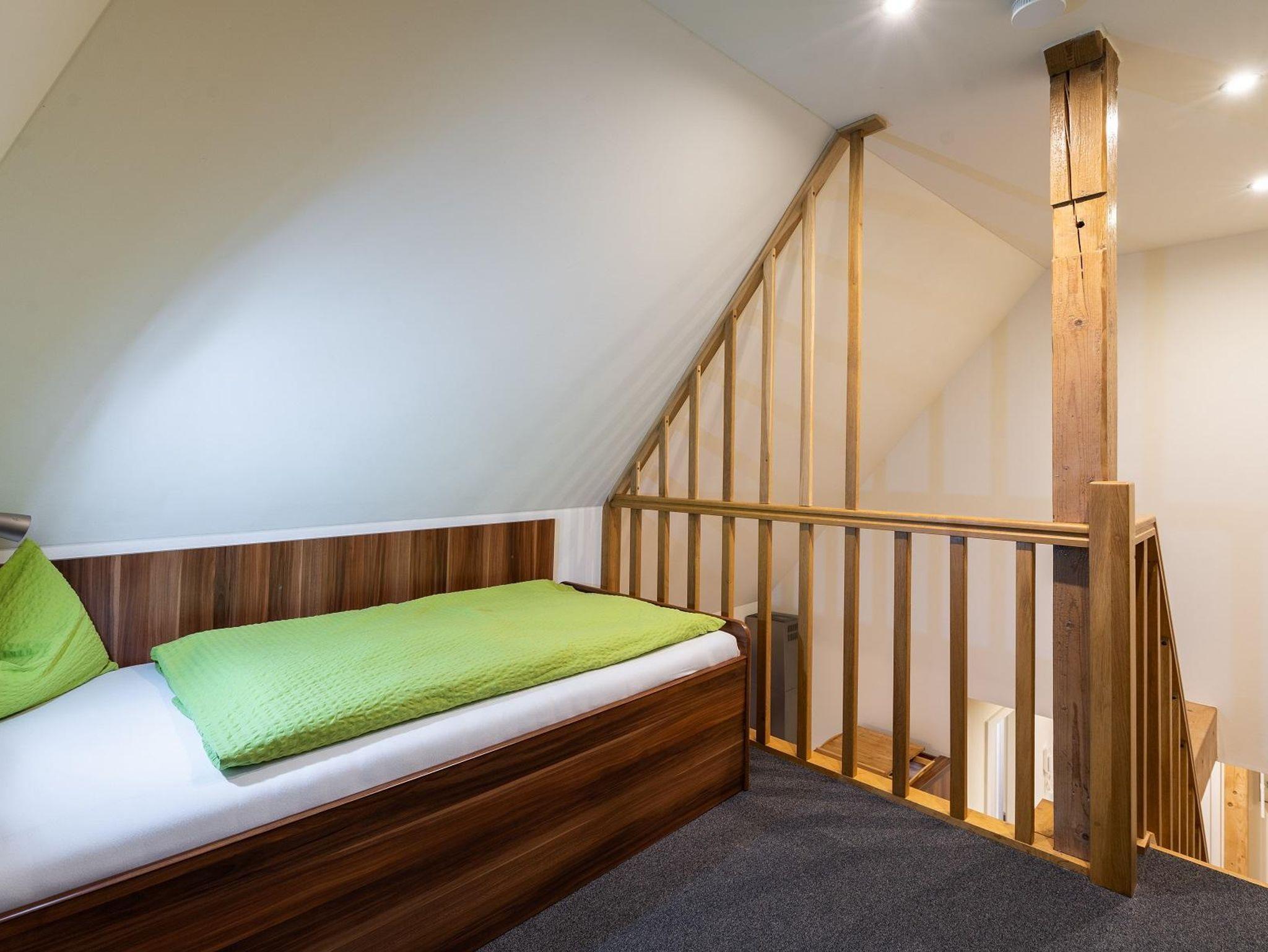 Eine großzügig, helle Ferienwohnung im 2. Stock des Hauses mit 1 separaten Schlafzimmer und einer Schlafgalerie, bietet Platz für 1 - 4 Personen und hat eine Größe von 65m². Der Charme dieser Wohnung stellt das sichtbare Fachwerk und die Galerie zum Schlafen mit der Wohlfühlatmosphäre eines gemütlichen Dachgeschosses dar. Besonderer Wert wurde auf die Sicherheit unserer Kleinsten gelegt und die Treppe mit Schutzgittern versehen. Nichtraucherwohnung, sowie Tierhaarallergie geeignet.