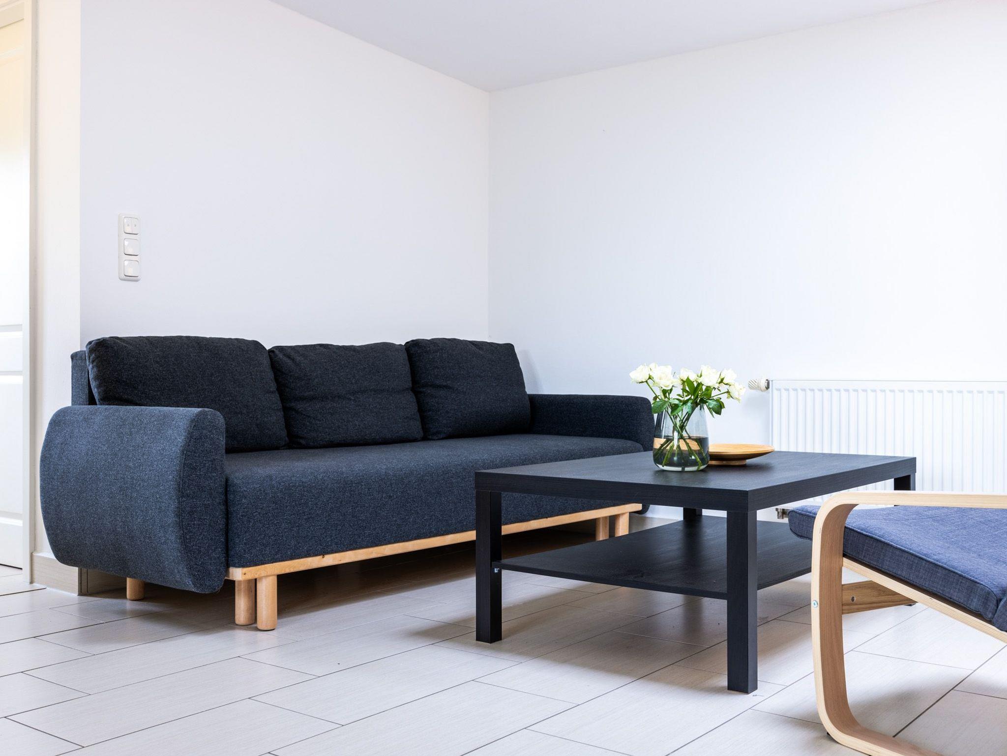 Wohnzimmer mit Sofaecke (Schlafsofa) und TV. Offene Küche mit 4- Platten Herd, Backofen, Geschirrspüler, Kaffeemaschine, Wasserkocher und Toaster, Esstisch. Schlafzimmer mit Doppelbett und Kommode, Bad mit Dusche und WC.