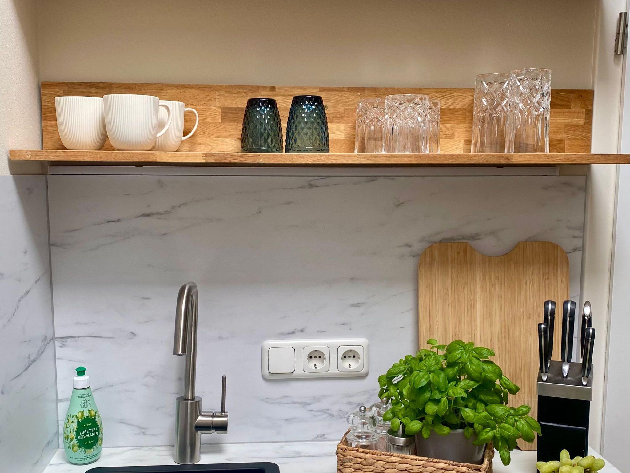 Doppelbett, Bettwäsche, Pantry Küche mit Kühlschrank & Herd, Duschbad mit Fön & Handtüchern, Smart - TV und Internet. Die Pantryküche ist mit Geschirr, Gläsern, Besteck, Töpfen und einer Pfanne, einer Kaffee- und einer Nespressomaschine, Toaster, Wasserkocher und anderen Gebrauchsgegenständen ausgestattet.