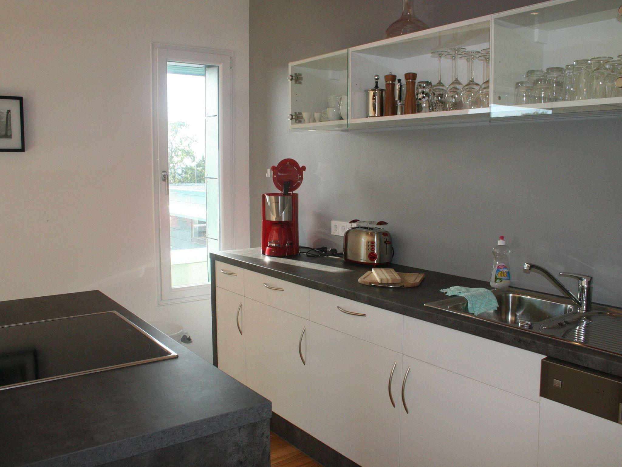 Die Küche verfügt über eine Kochinsel und alle Arten von Komfort. Auf diese Weise können Sie die Weite und den Kurpark auch beim Kochen erleben.